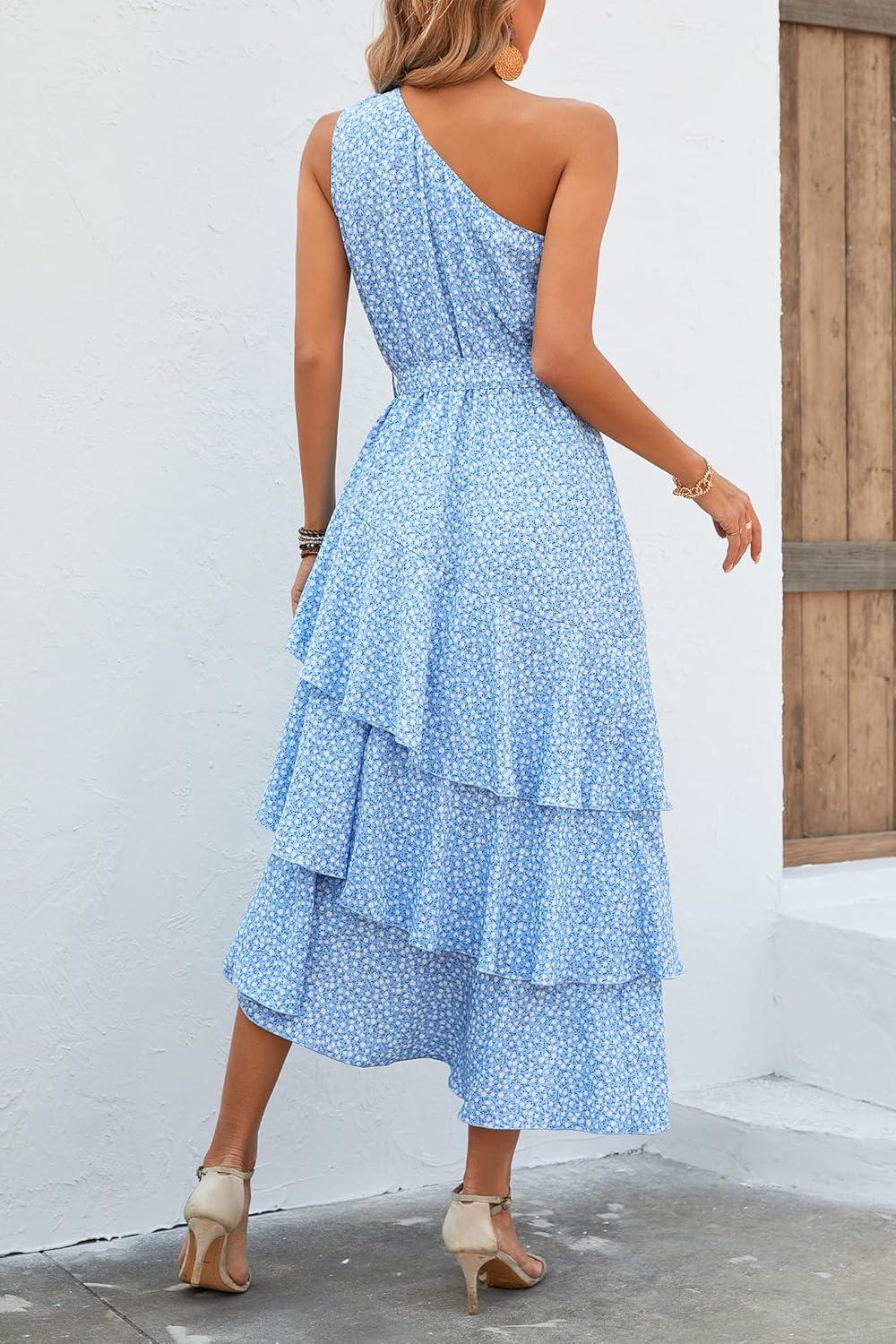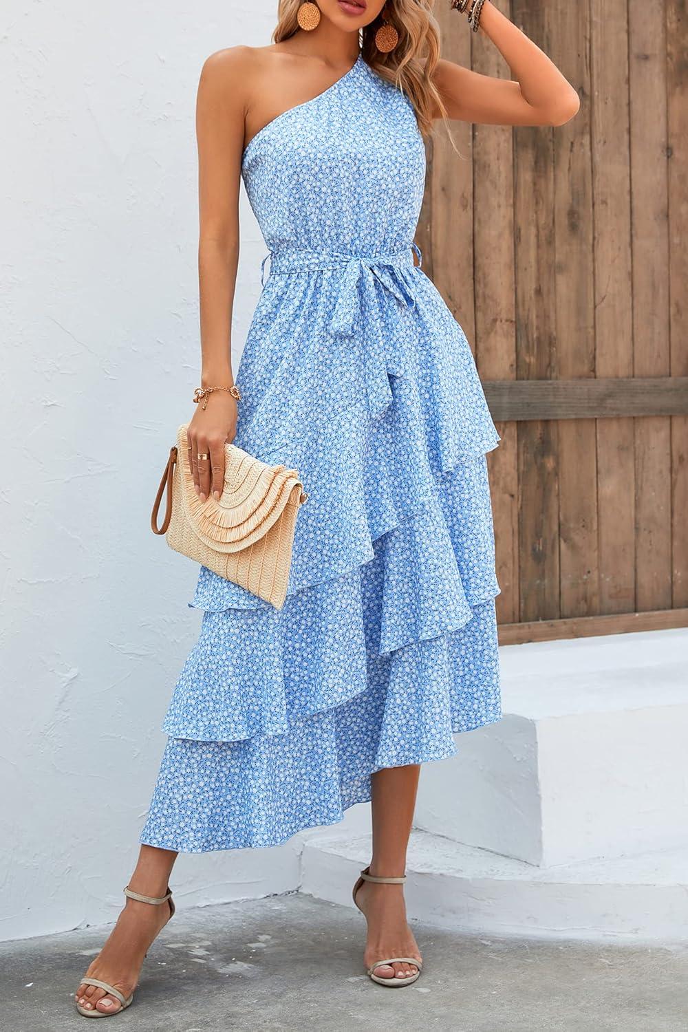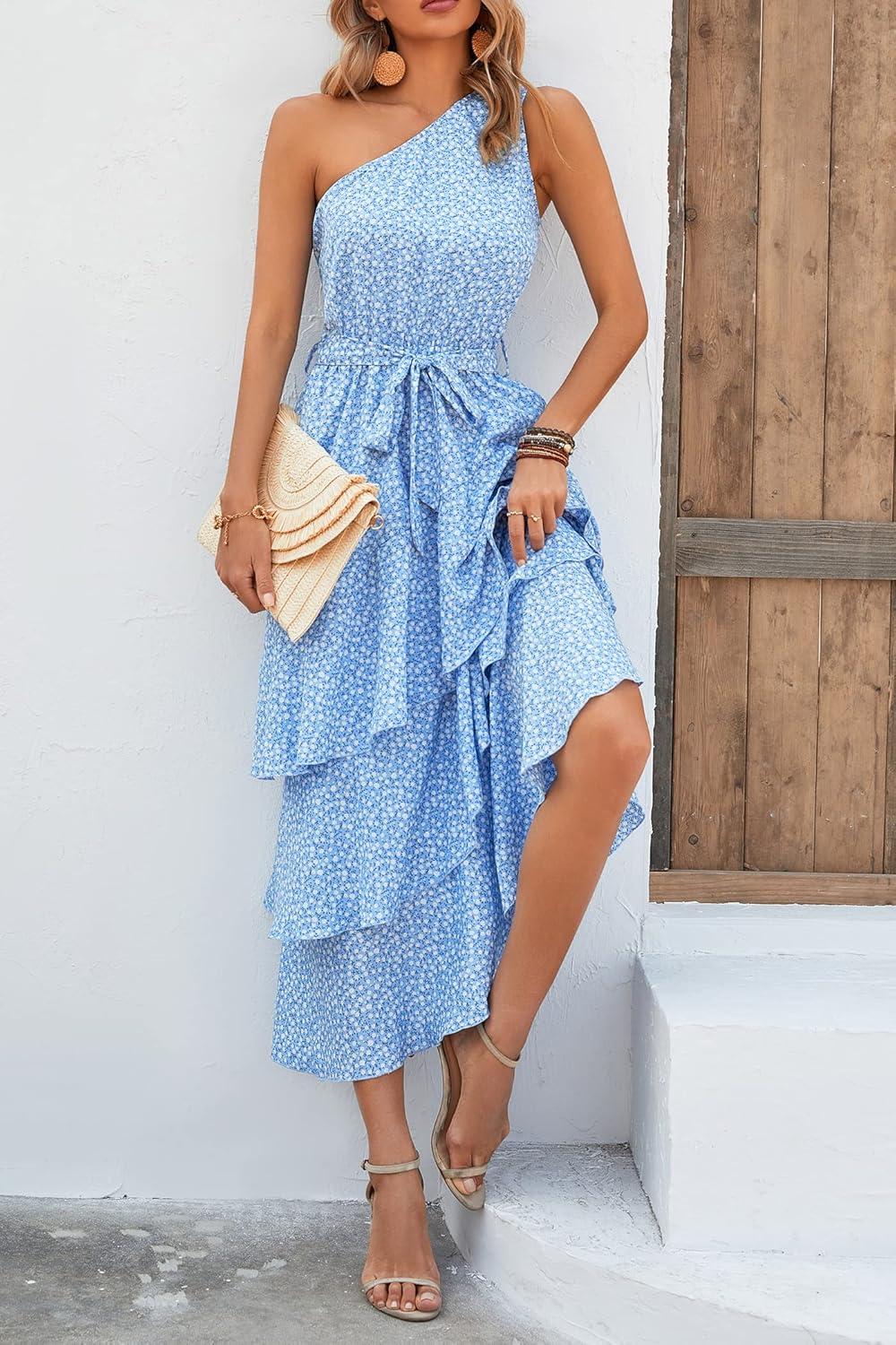 PRETTYGARDEN Women's Summer Floral Sundress Casual One Shoulder Tiered Ruffle Flowy Midi Beach Boho Dresses(Floral Light Blue)