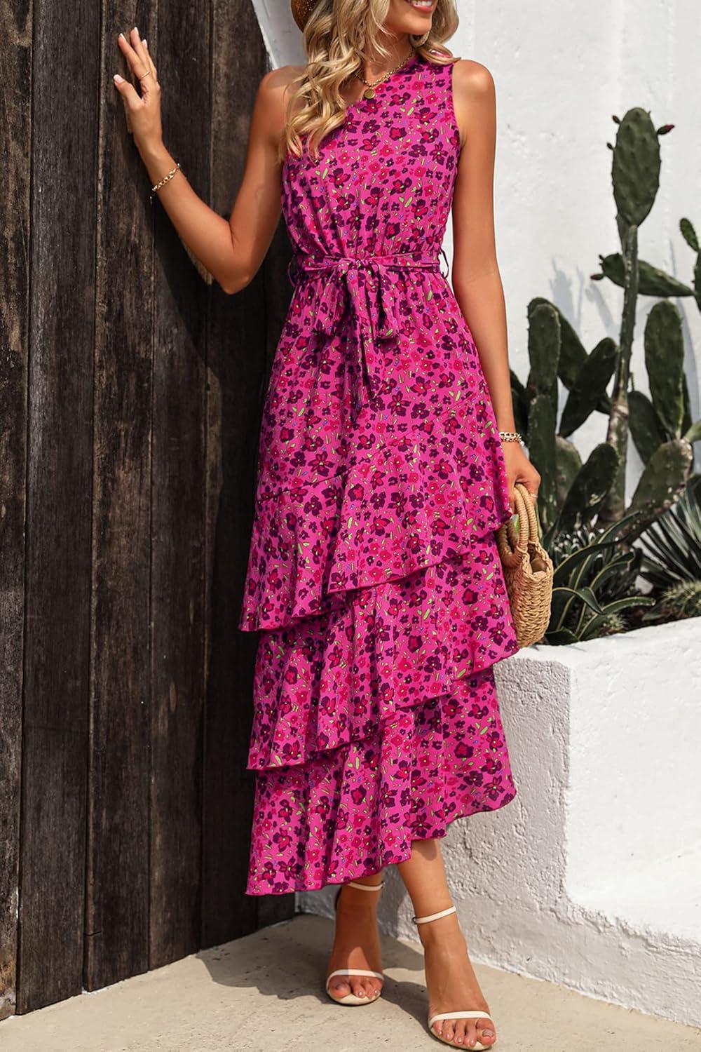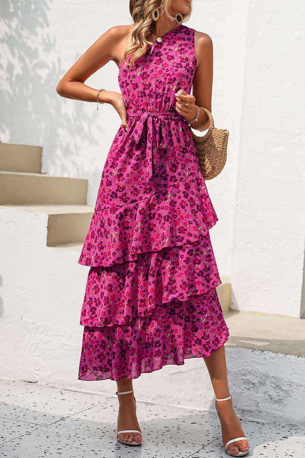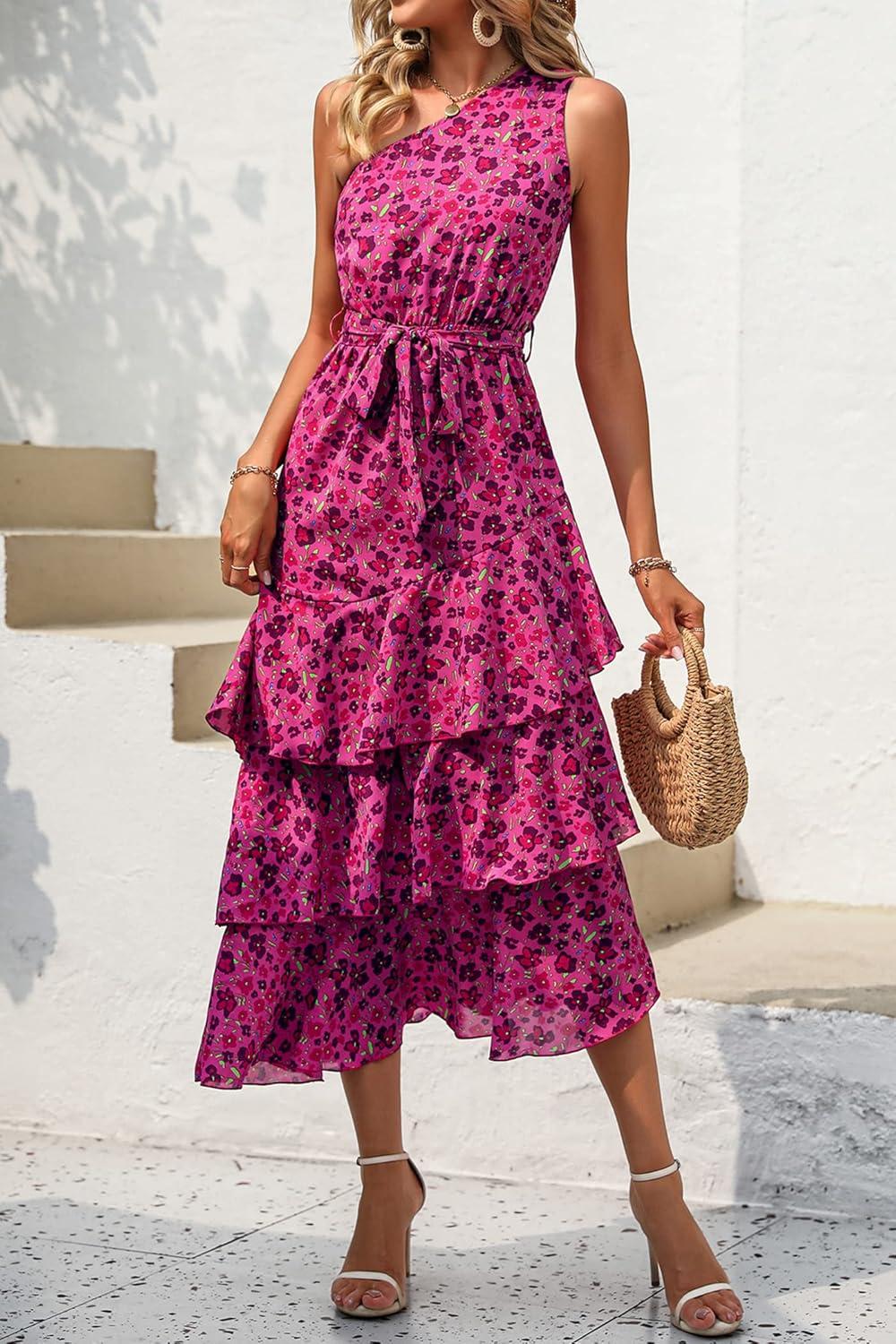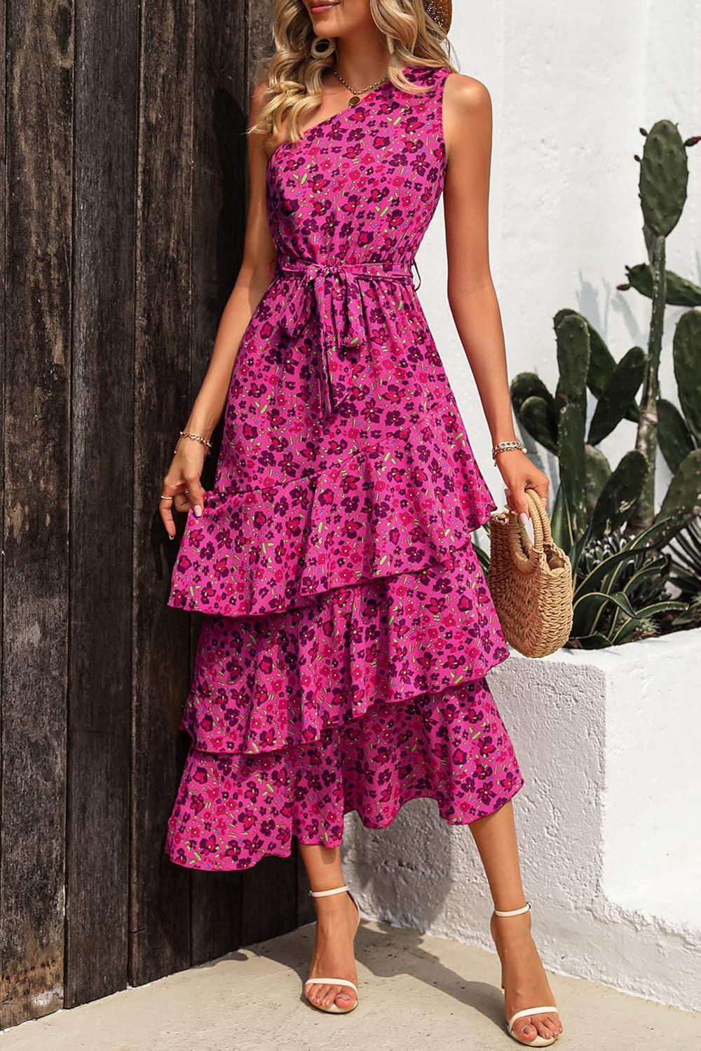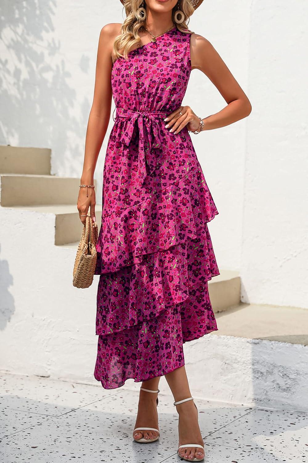PRETTYGARDEN Women's Summer Floral Sundress Casual One Shoulder Tiered Ruffle Flowy Midi Beach Boho Dresses(Floral Rose Red)