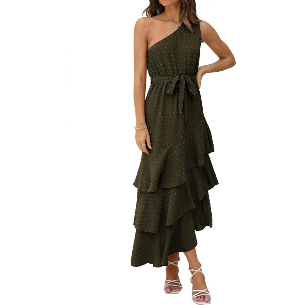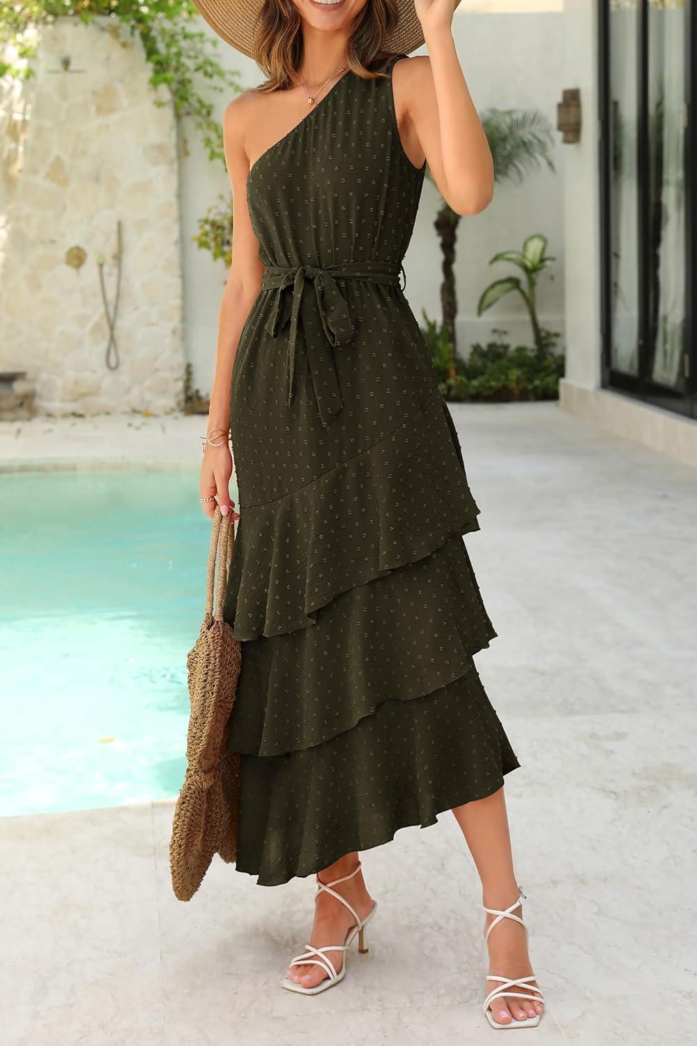 PRETTYGARDEN Women's Summer Floral Sundress Casual One Shoulder Tiered Ruffle Flowy Midi Beach Boho Dresses(Swiss Dot Army Green)