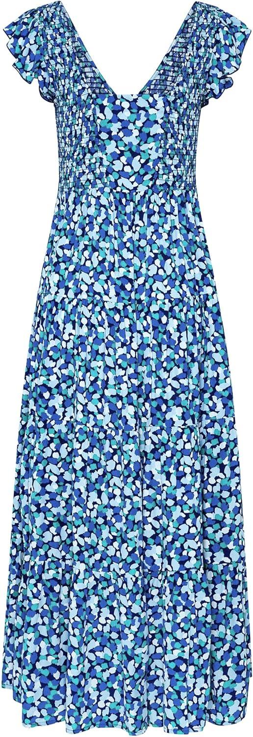 PRETTYGARDEN Women’s Summer Flowy Maxi Dress Casual Cap Sleeve V Neck Smocked Beach Sundress(Print Blue)