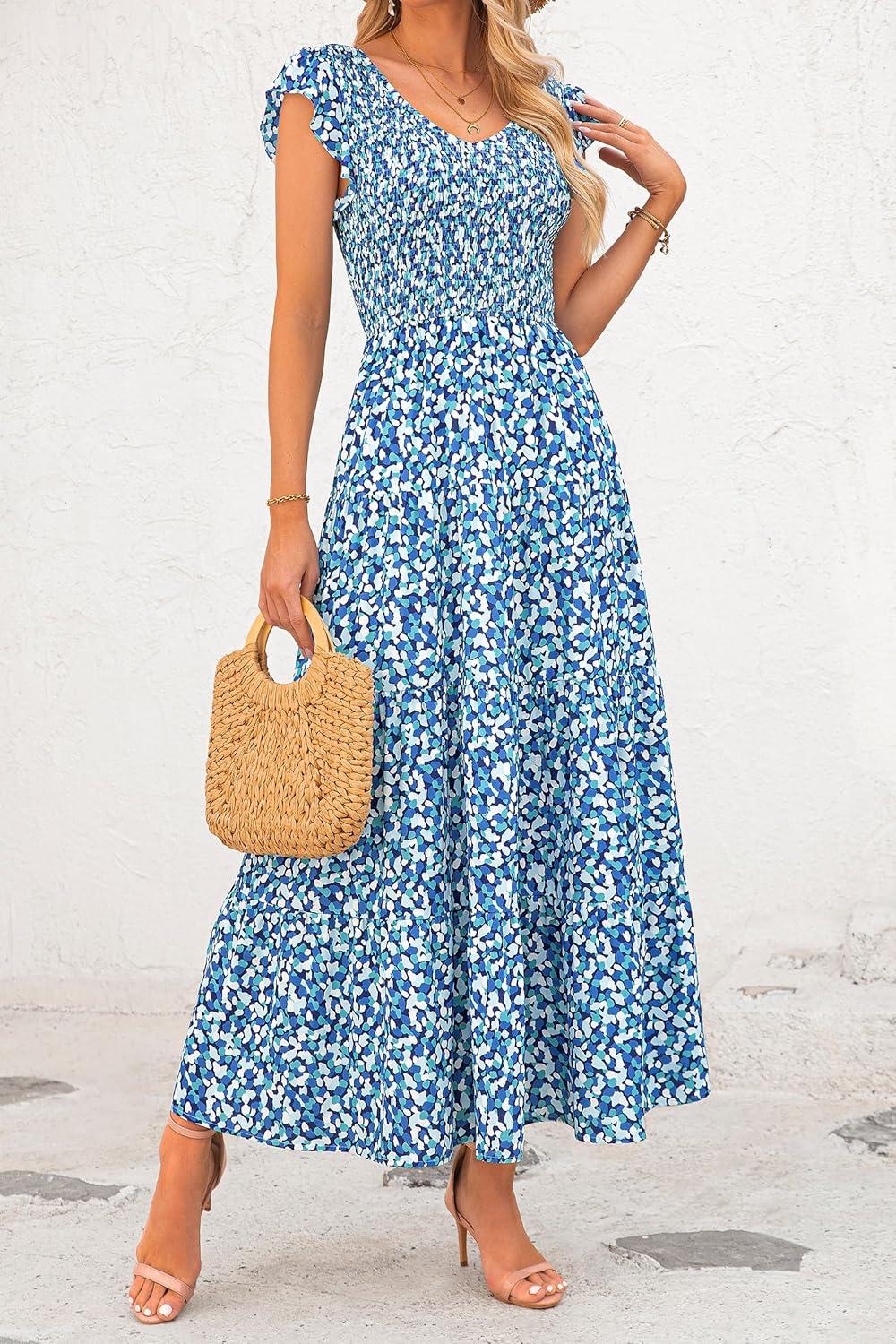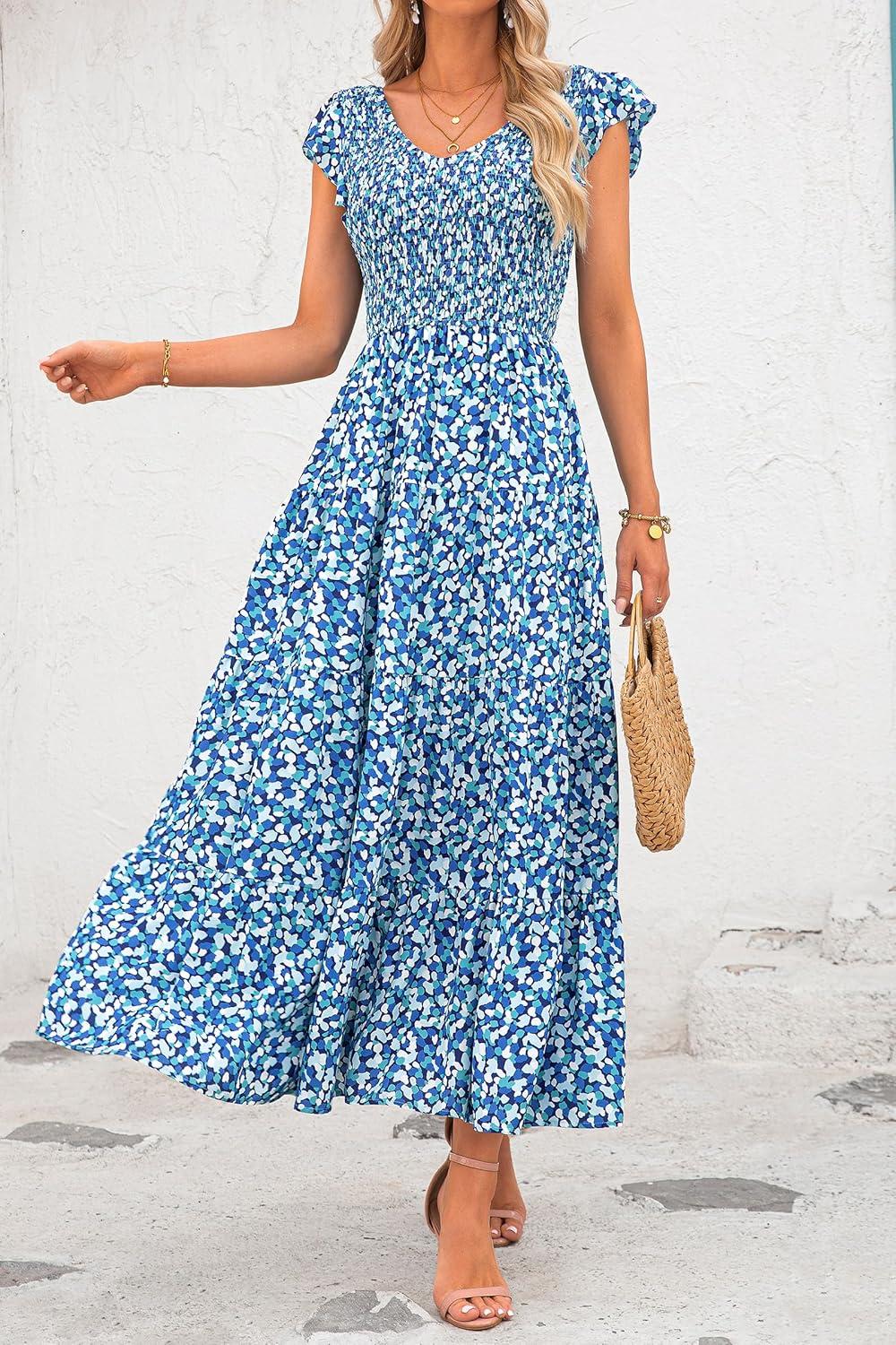 PRETTYGARDEN Women's Summer Flowy Maxi Dress Casual Cap Sleeve V Neck Smocked Beach Sundress(Print Blue)