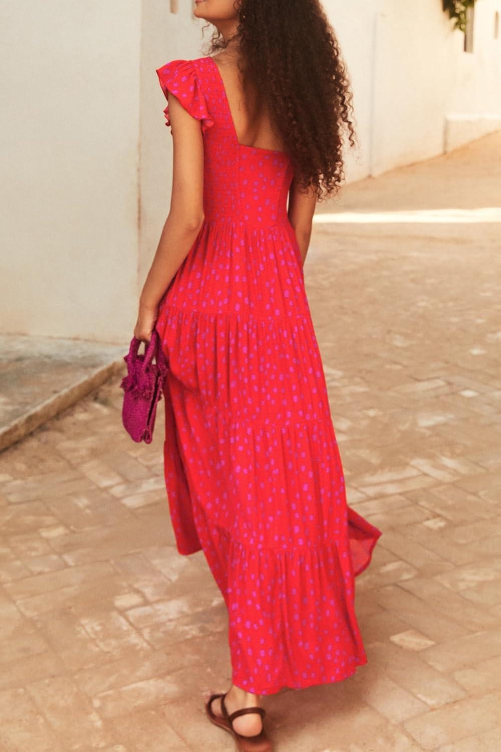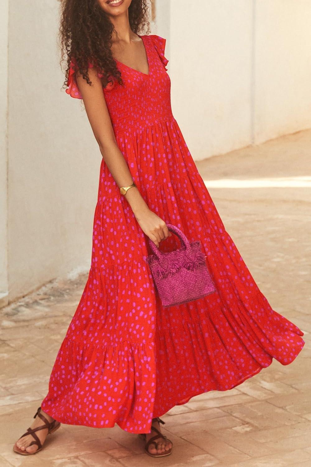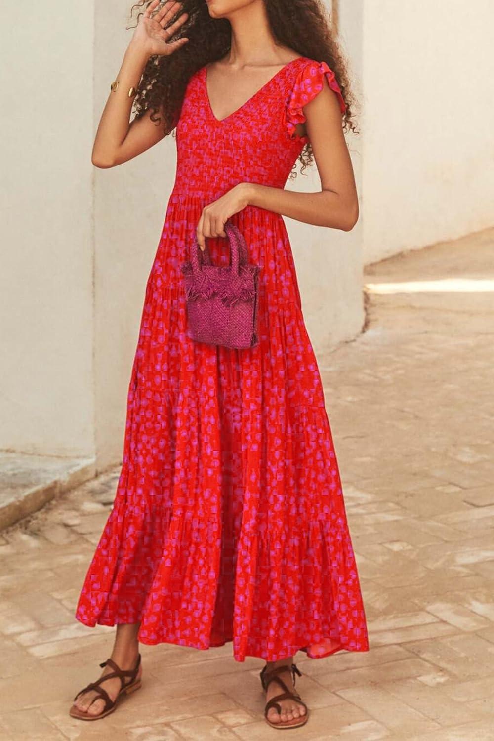 PRETTYGARDEN Women's Summer Flowy Maxi Dress Casual Cap Sleeve V Neck Smocked Beach Sundress(Print Red)