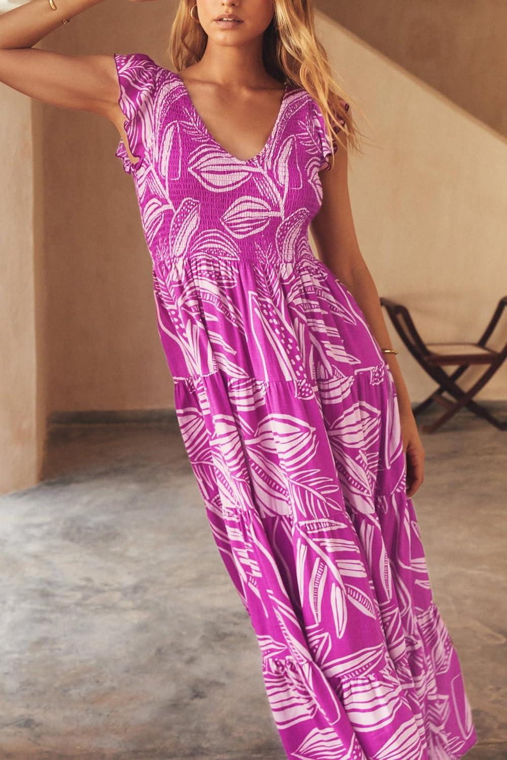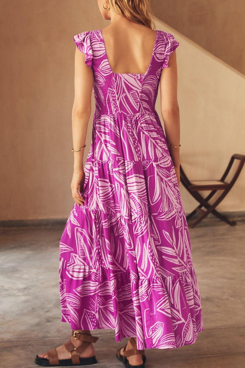 PRETTYGARDEN Women's Summer Flowy Maxi Dress Casual Cap Sleeve V Neck Smocked Beach Sundress(Print Rose Purple)