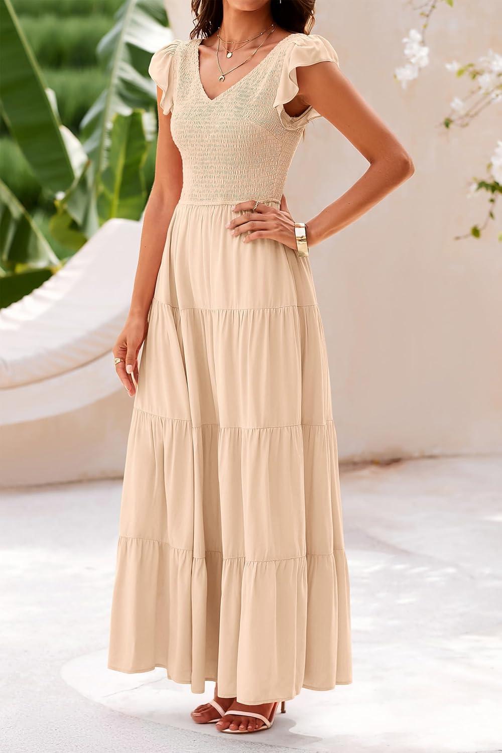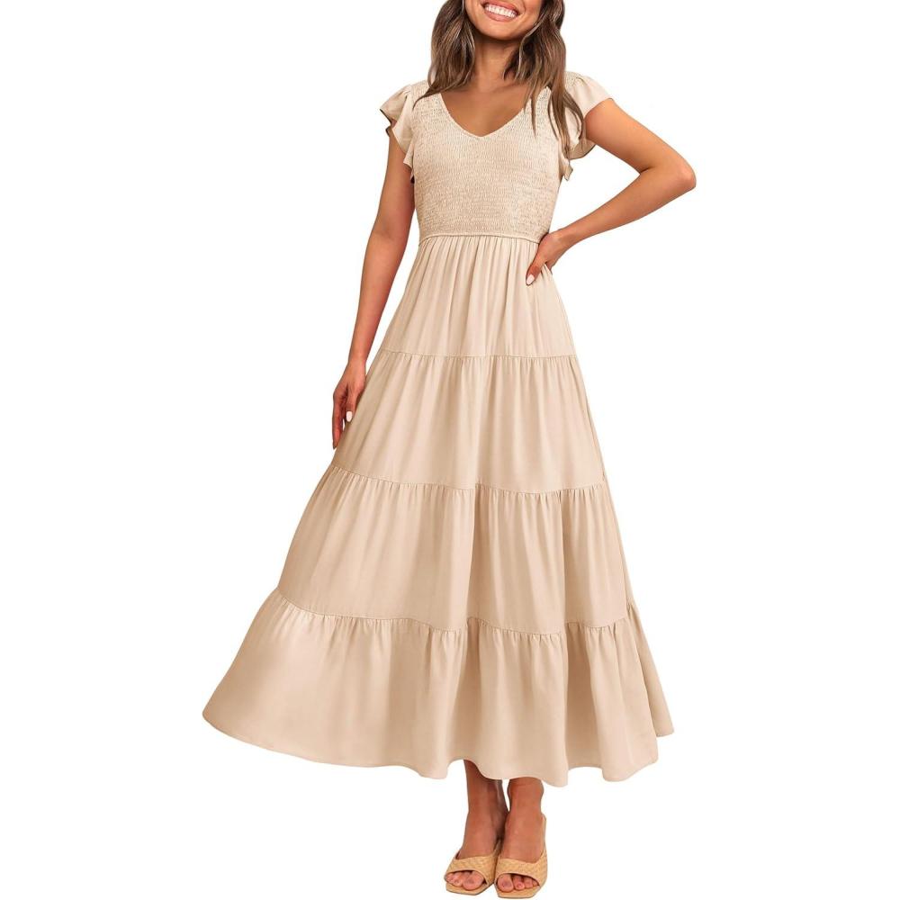 PRETTYGARDEN Women’s Summer Flowy Maxi Dress Casual Cap Sleeve V Neck Smocked Beach Sundress(Solid Beige)