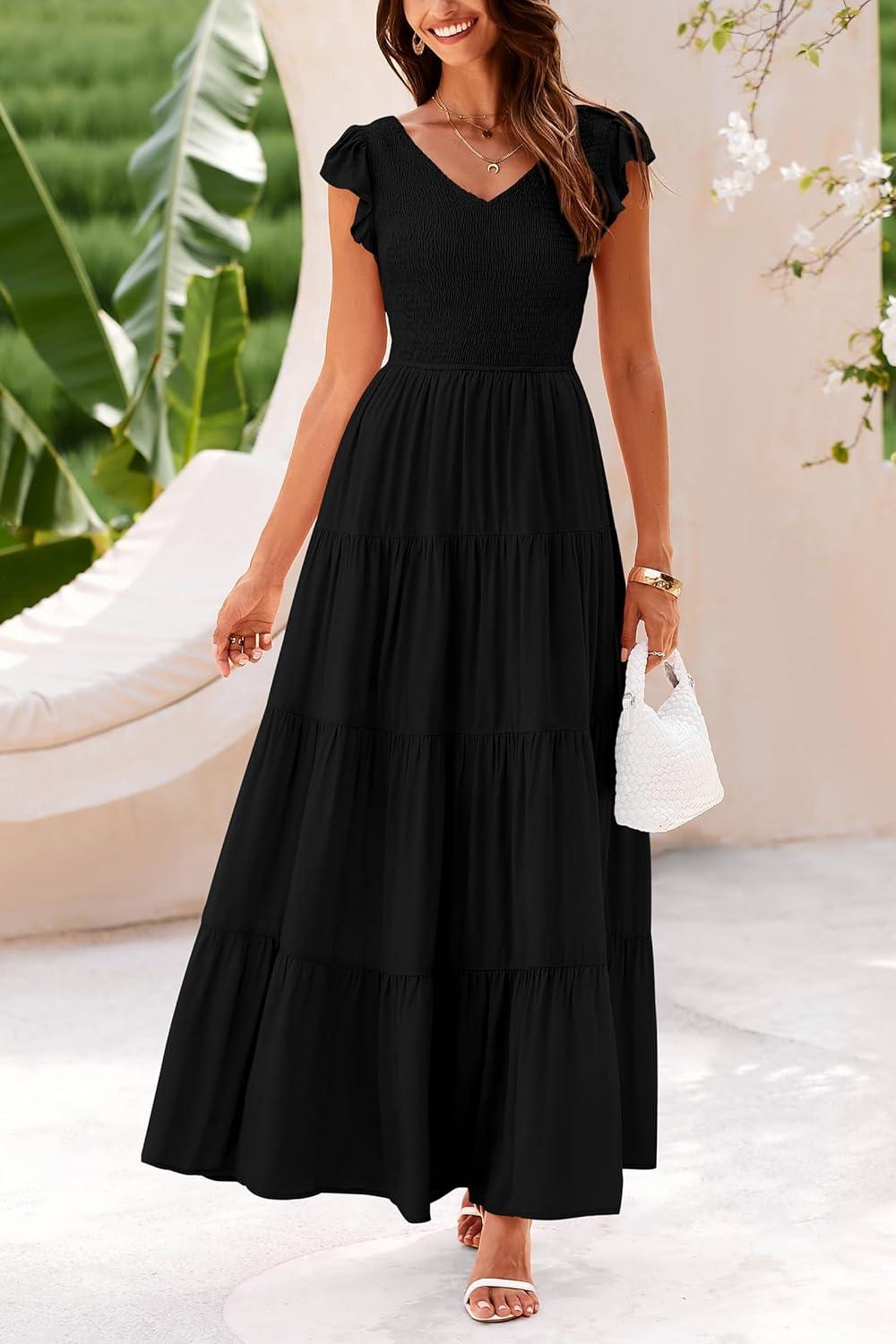 PRETTYGARDEN Women's Summer Flowy Maxi Dress Casual Cap Sleeve V Neck Smocked Beach Sundress(Solid Black)