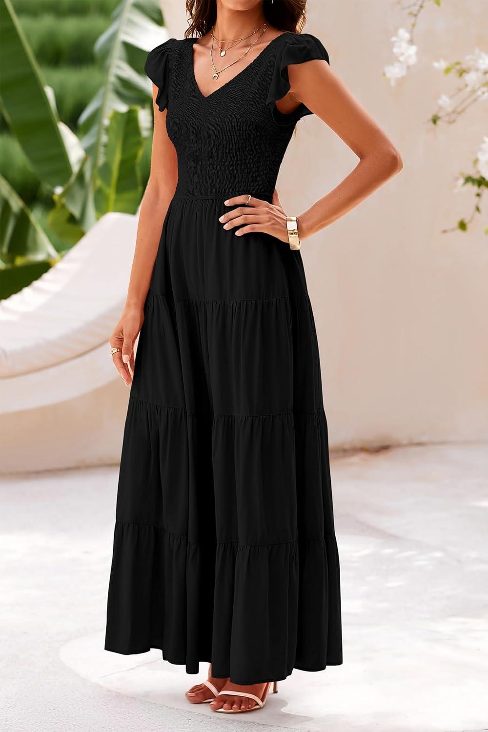 PRETTYGARDEN Women’s Summer Flowy Maxi Dress Casual Cap Sleeve V Neck Smocked Beach Sundress(Solid Black)