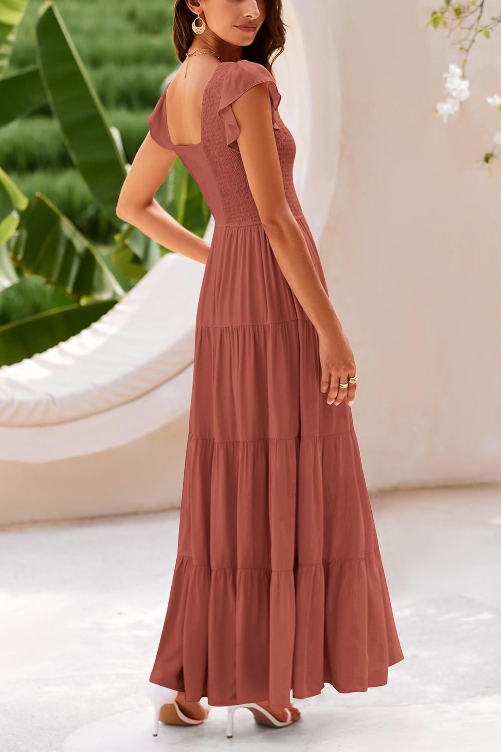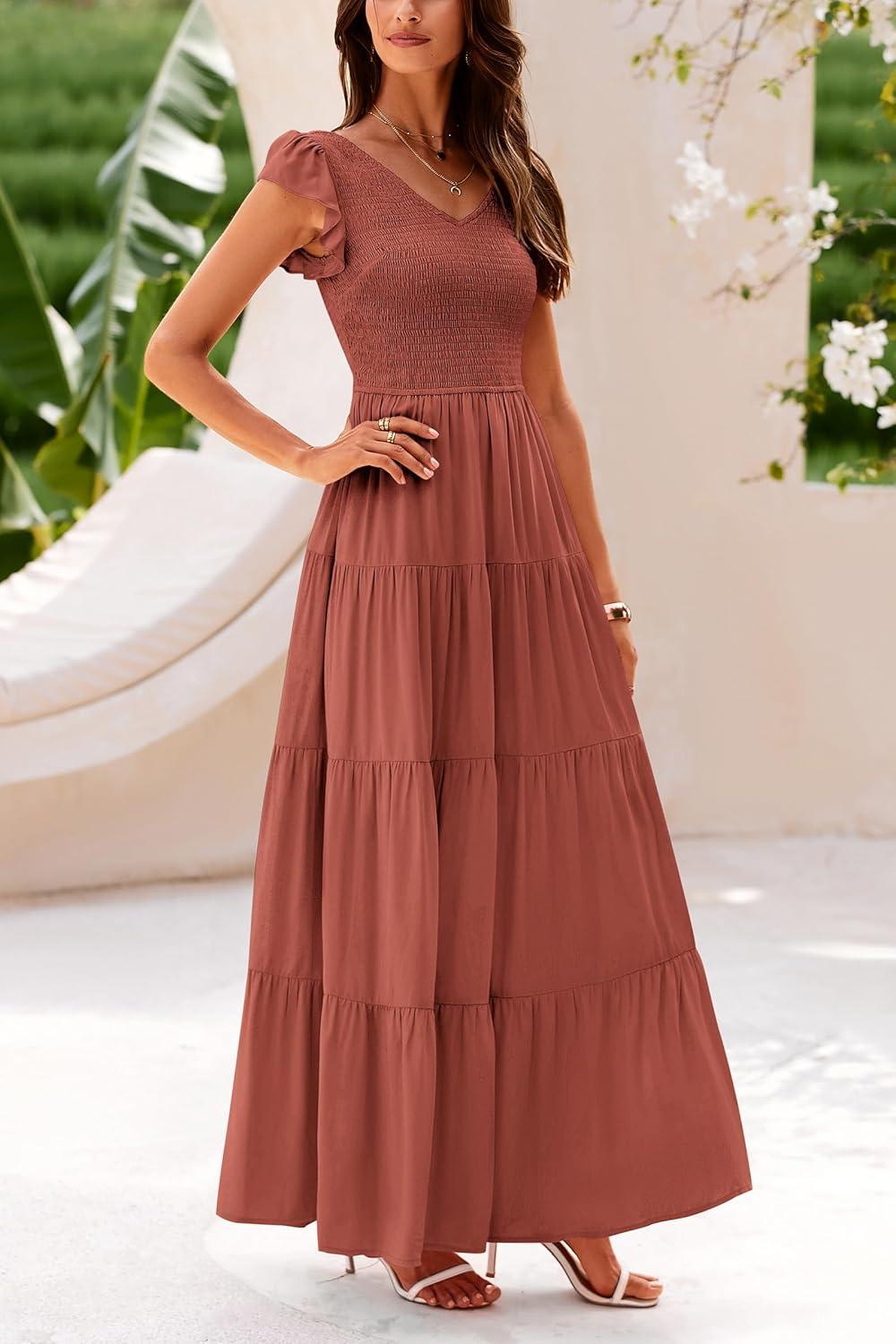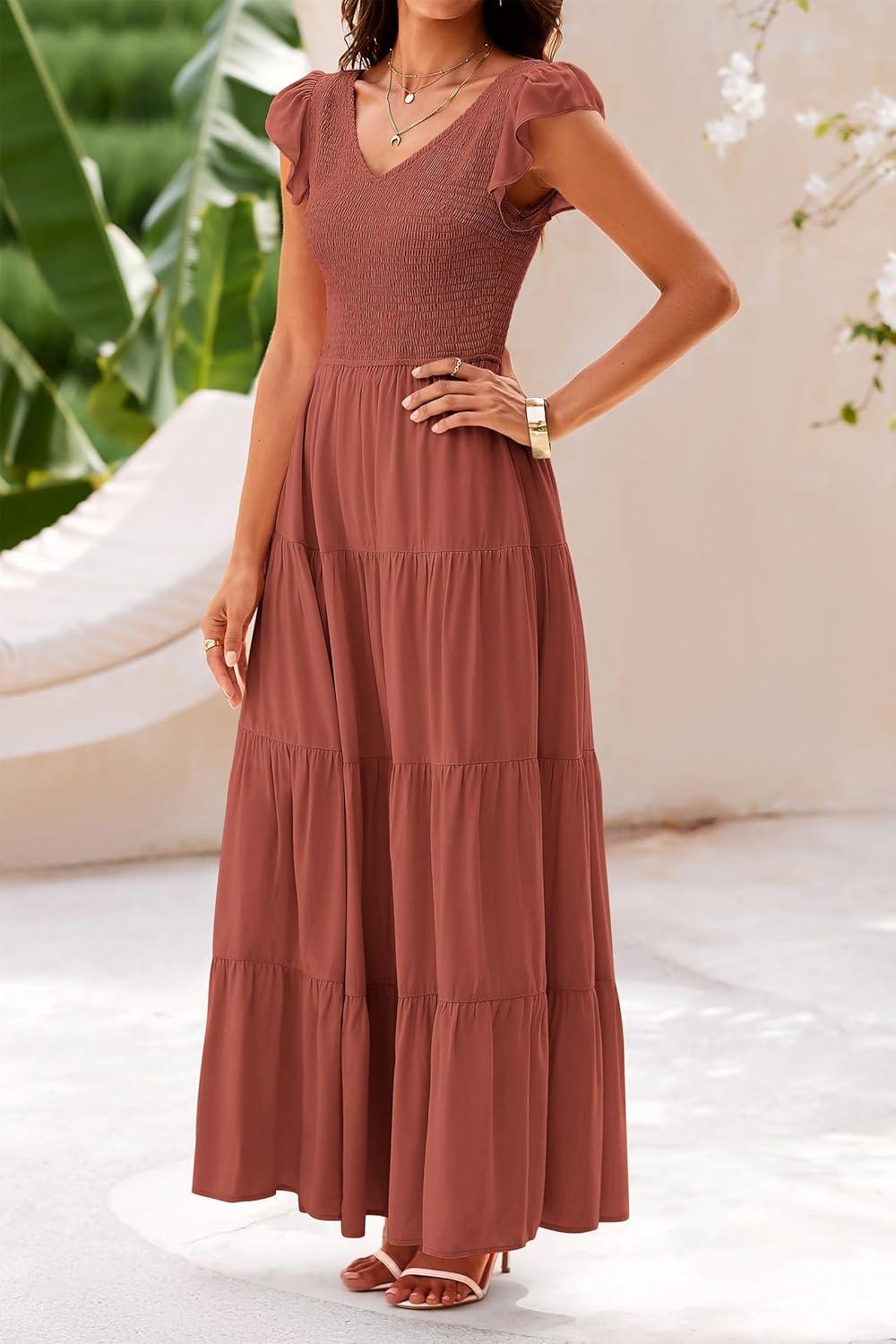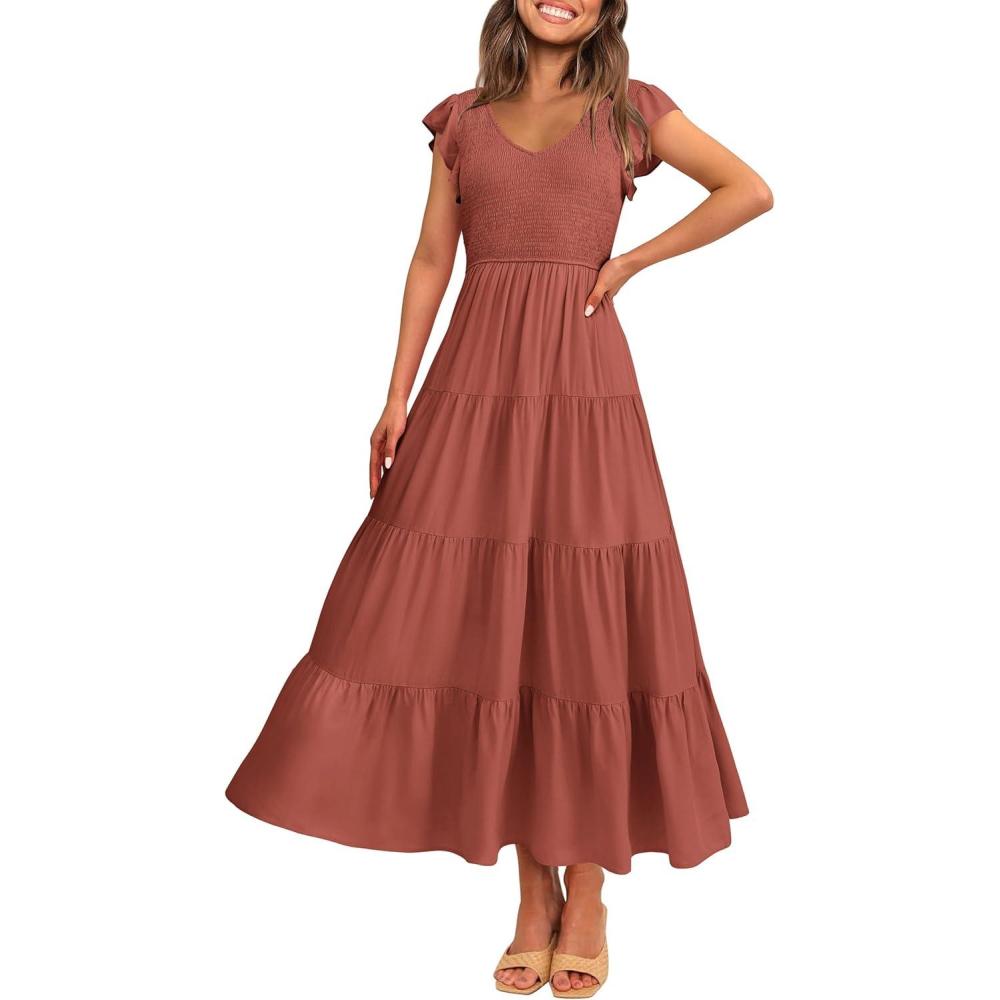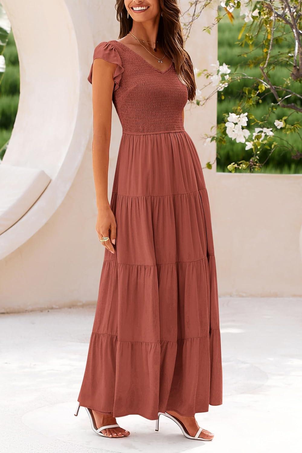 PRETTYGARDEN Women’s Summer Flowy Maxi Dress Casual Cap Sleeve V Neck Smocked Beach Sundress(Solid Brick Red)