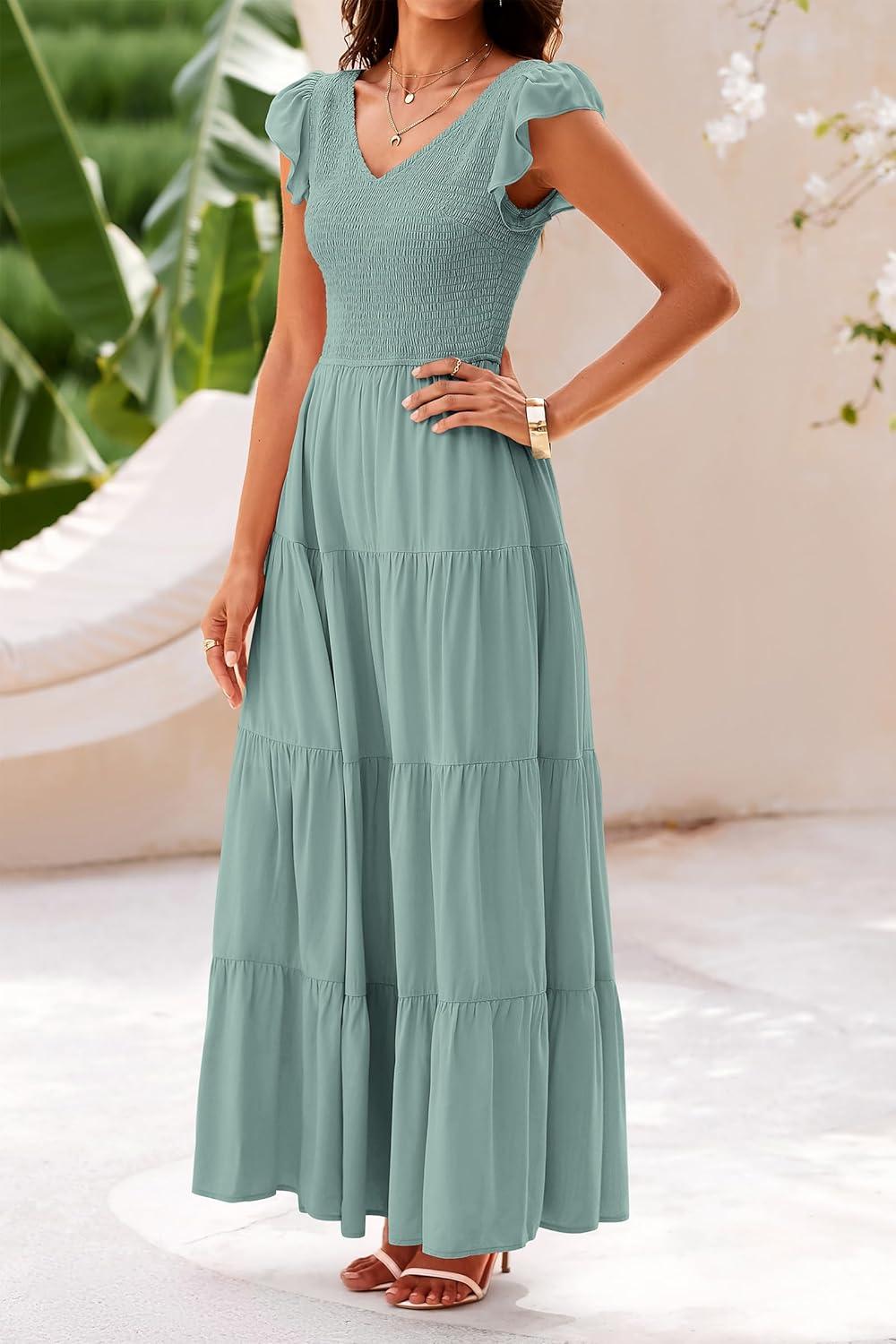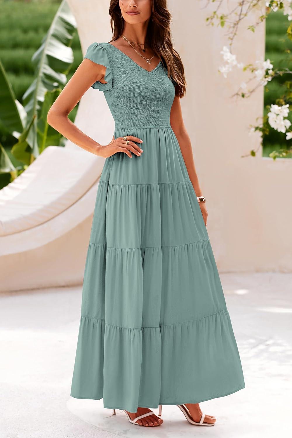 PRETTYGARDEN Women's Summer Flowy Maxi Dress Casual Cap Sleeve V Neck Smocked Beach Sundress(Solid Grey Green)