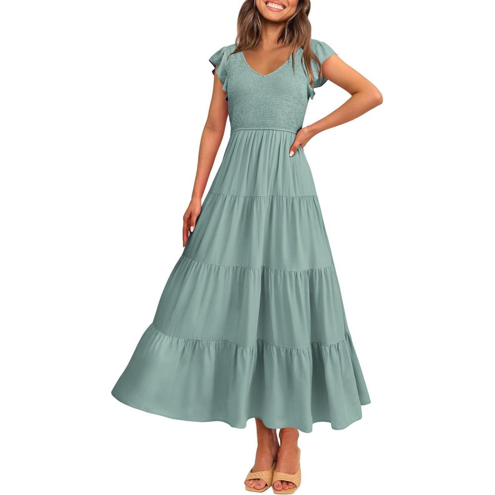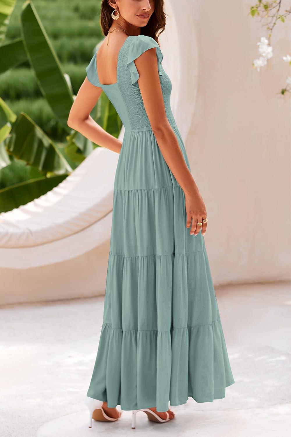 PRETTYGARDEN Women’s Summer Flowy Maxi Dress Casual Cap Sleeve V Neck Smocked Beach Sundress(Solid Grey Green)