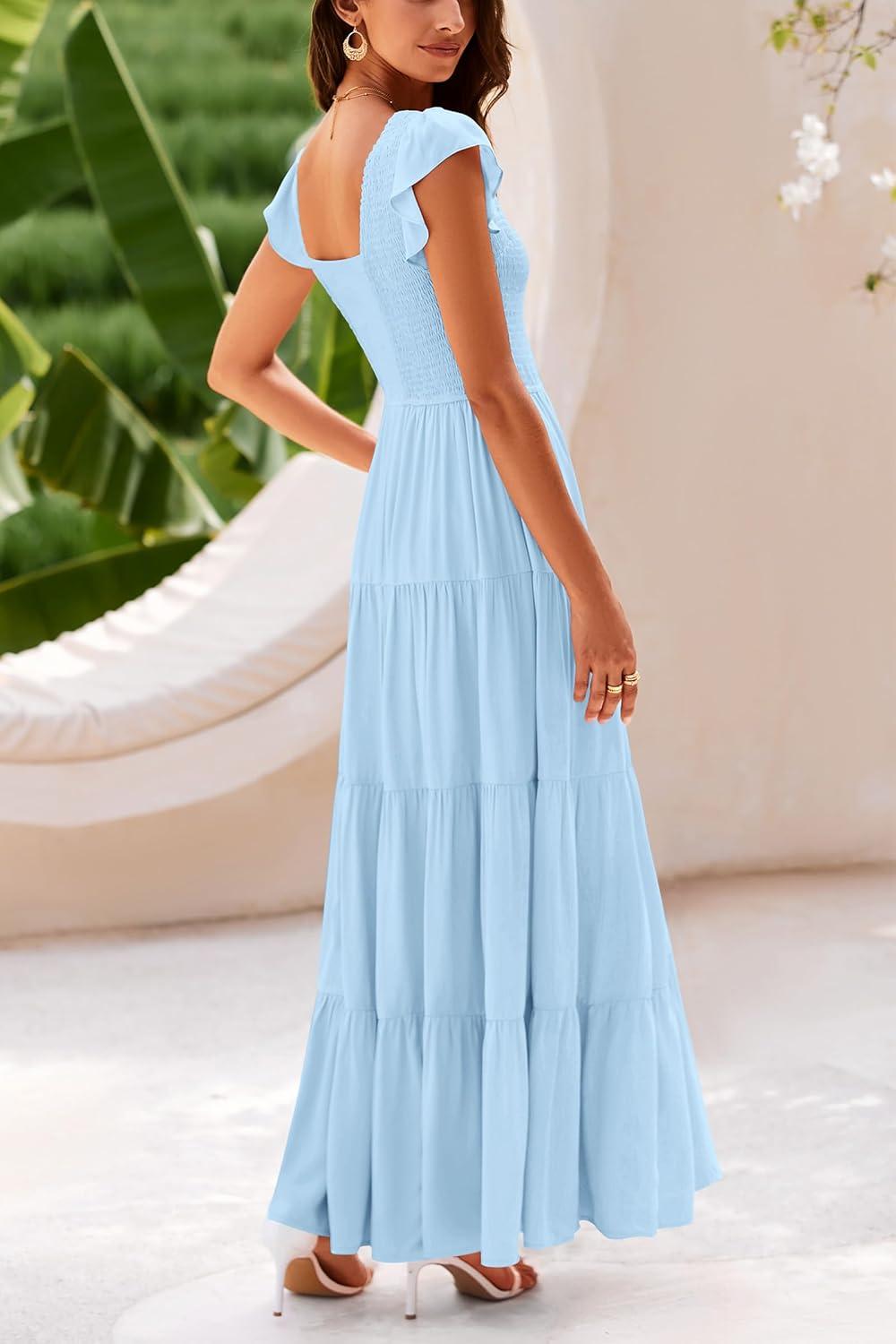 PRETTYGARDEN Women’s Summer Flowy Maxi Dress Casual Cap Sleeve V Neck Smocked Beach Sundress(Solid Light Blue)