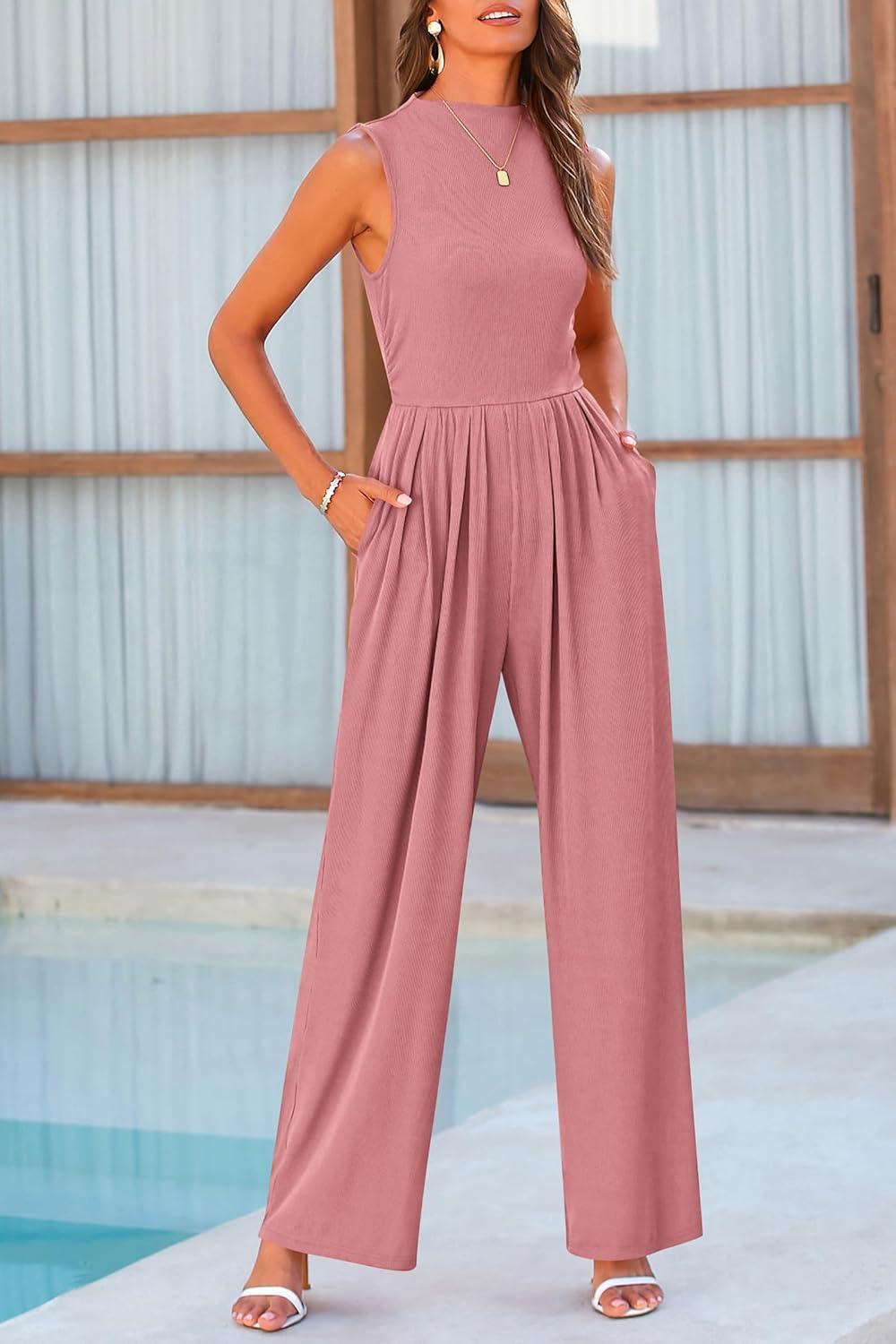 PRETTYGARDEN Womens Summer Jumpsuits Dressy Casual One Piece Outfits Sleeveless Mock Neck Wide Leg Pants Rompers with Pockets(Dusty Pink)