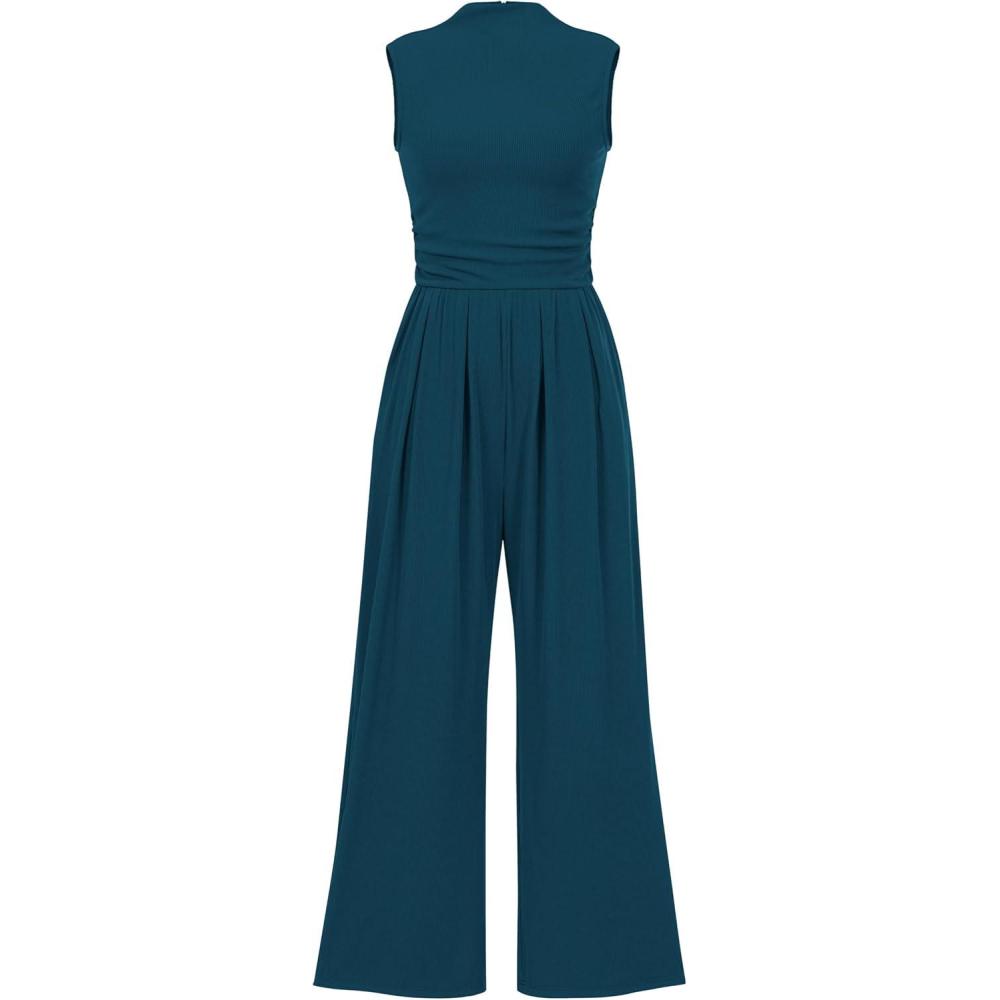 PRETTYGARDEN Womens Summer Jumpsuits Dressy Casual One Piece Outfits Sleeveless Mock Neck Wide Leg Pants Rompers with Pockets(Lake Blue)