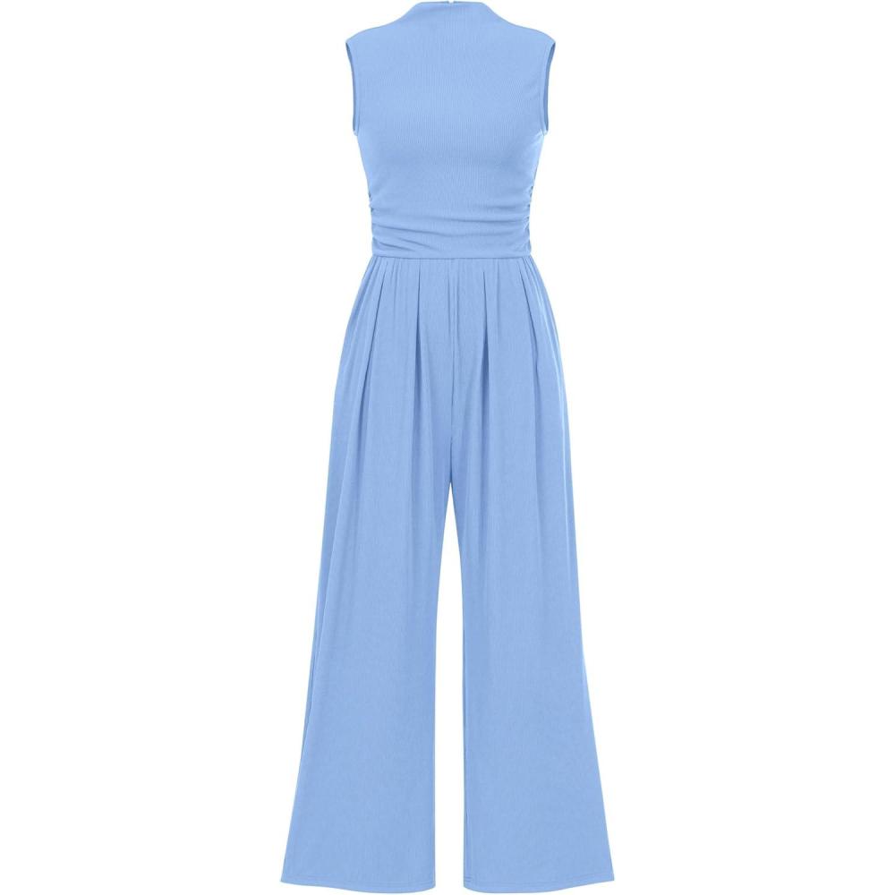 PRETTYGARDEN Womens Summer Jumpsuits Dressy Casual One Piece Outfits Sleeveless Mock Neck Wide Leg Pants Rompers with Pockets(Lake Blue)