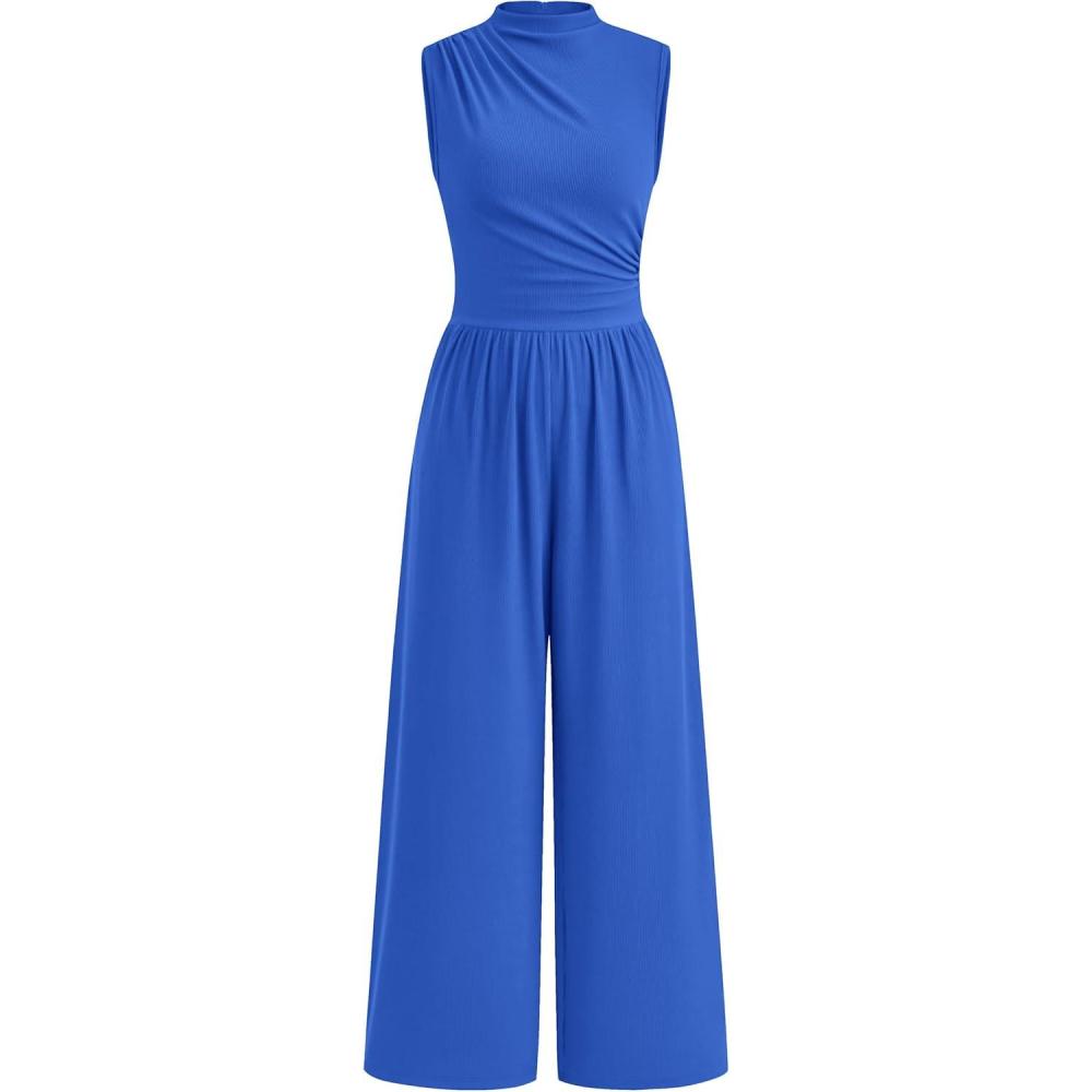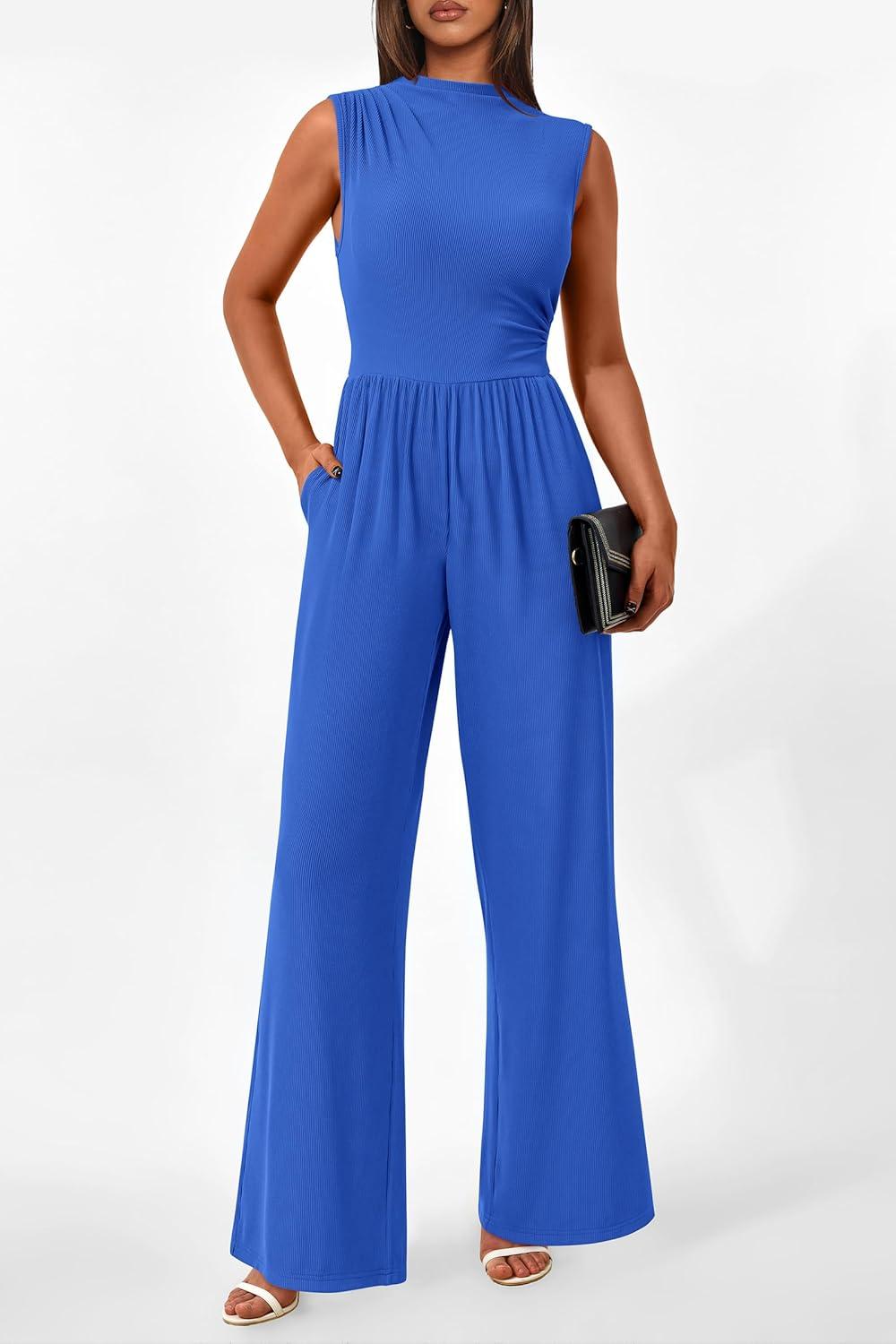 PRETTYGARDEN Womens Summer Jumpsuits Dressy Casual One Piece Outfits Sleeveless Mock Neck Wide Leg Pants Rompers with Pockets(Style2-blue)