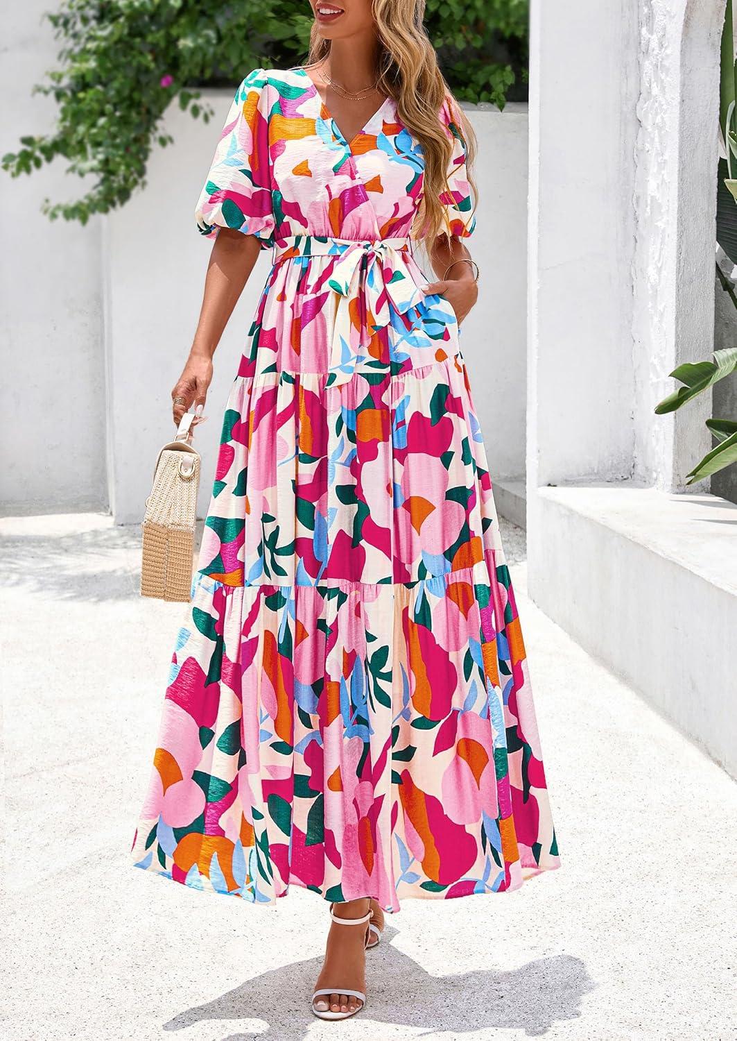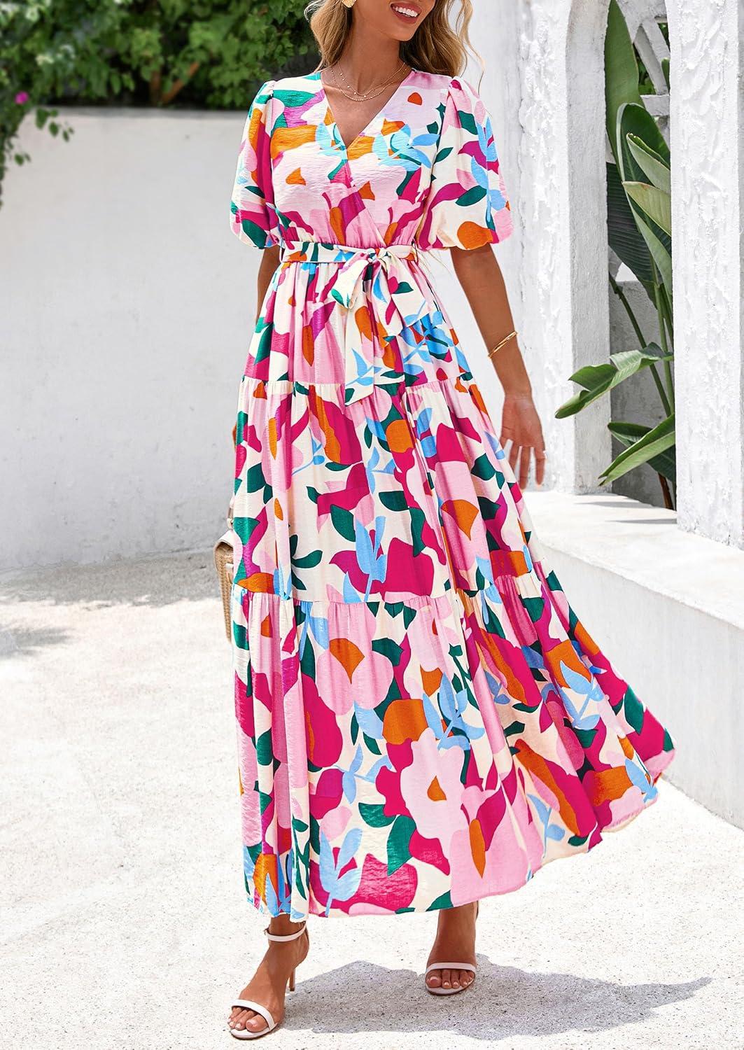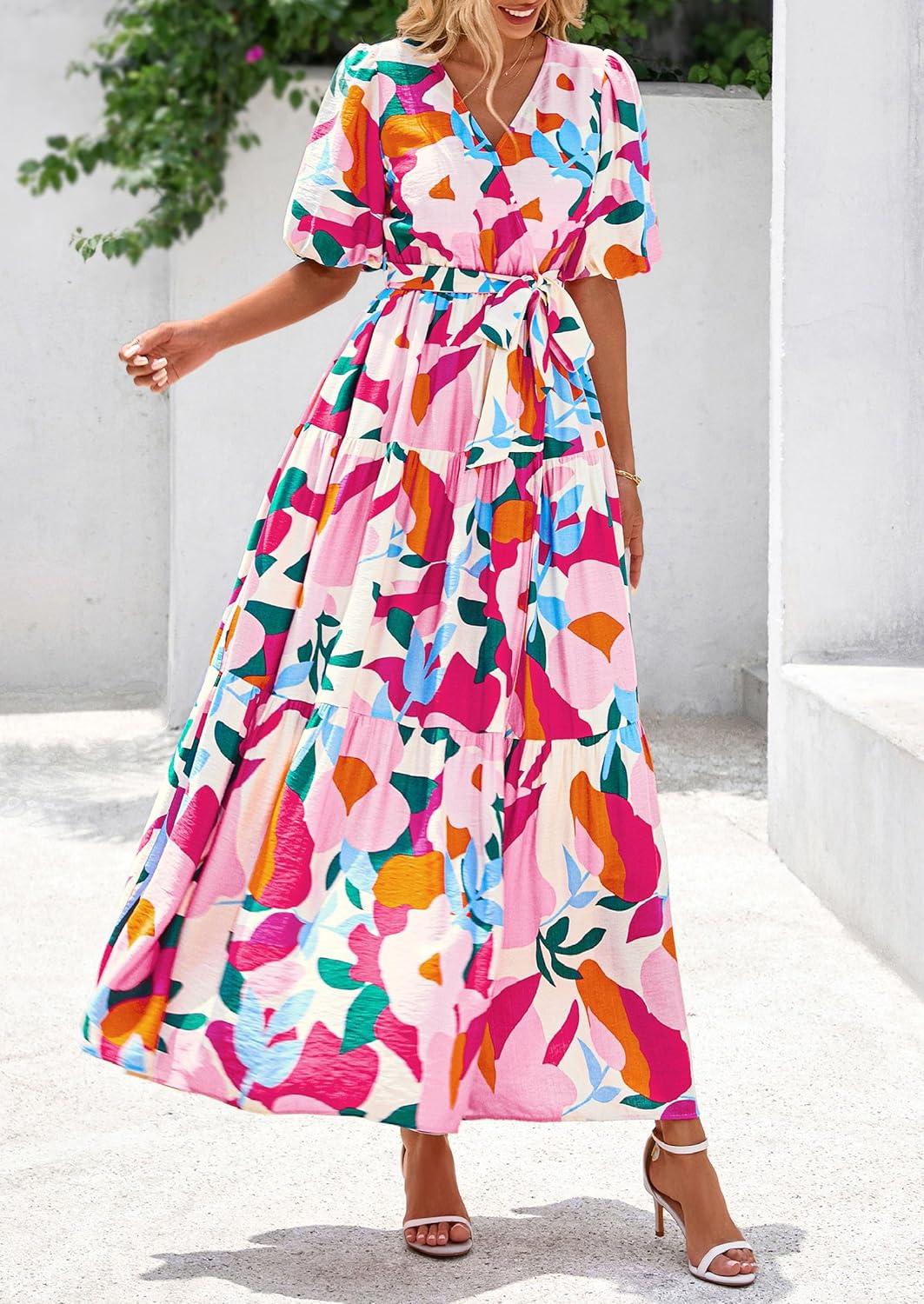 PRETTYGARDEN Women's Summer Maxi Dress 2025 Resort Wear Boho Floral V Neck Puff Short Sleeve Ruffle Flowy Beach Long Dresses(Apricot Rose Red Flower)