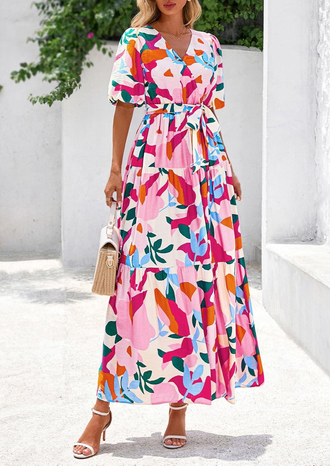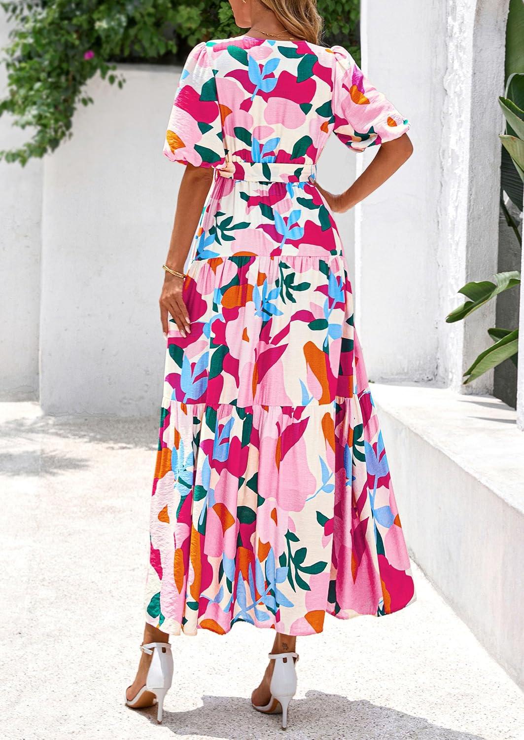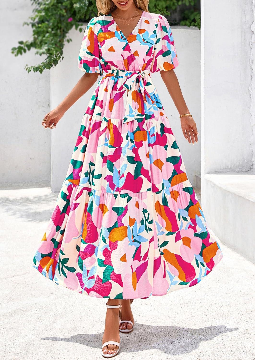 PRETTYGARDEN Women's Summer Maxi Dress 2025 Resort Wear Boho Floral V Neck Puff Short Sleeve Ruffle Flowy Beach Long Dresses(Apricot Rose Red Flower)