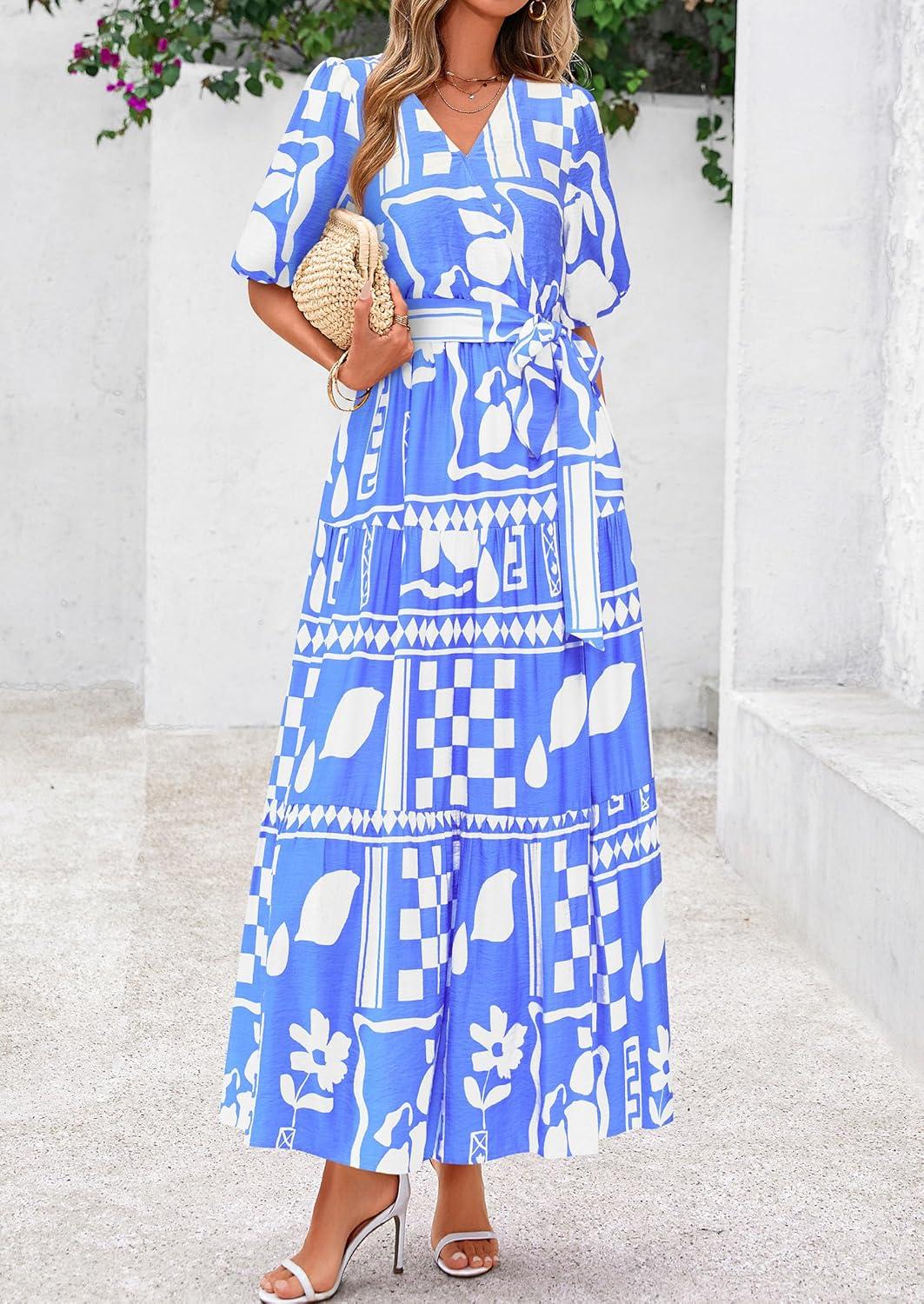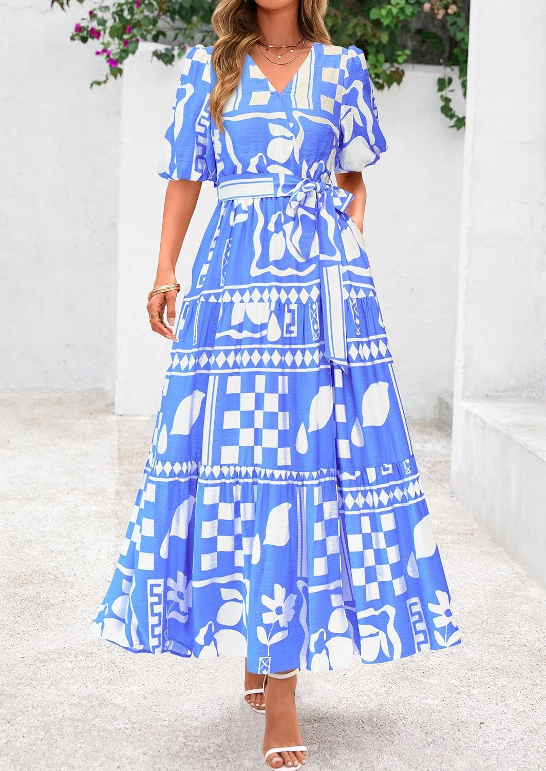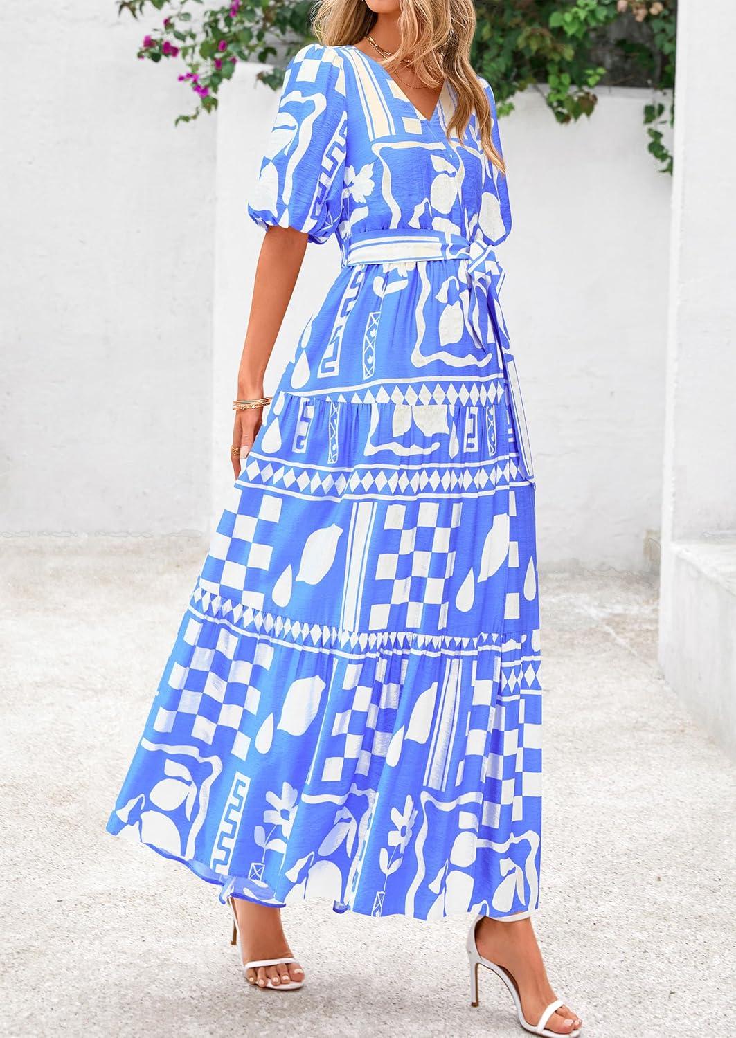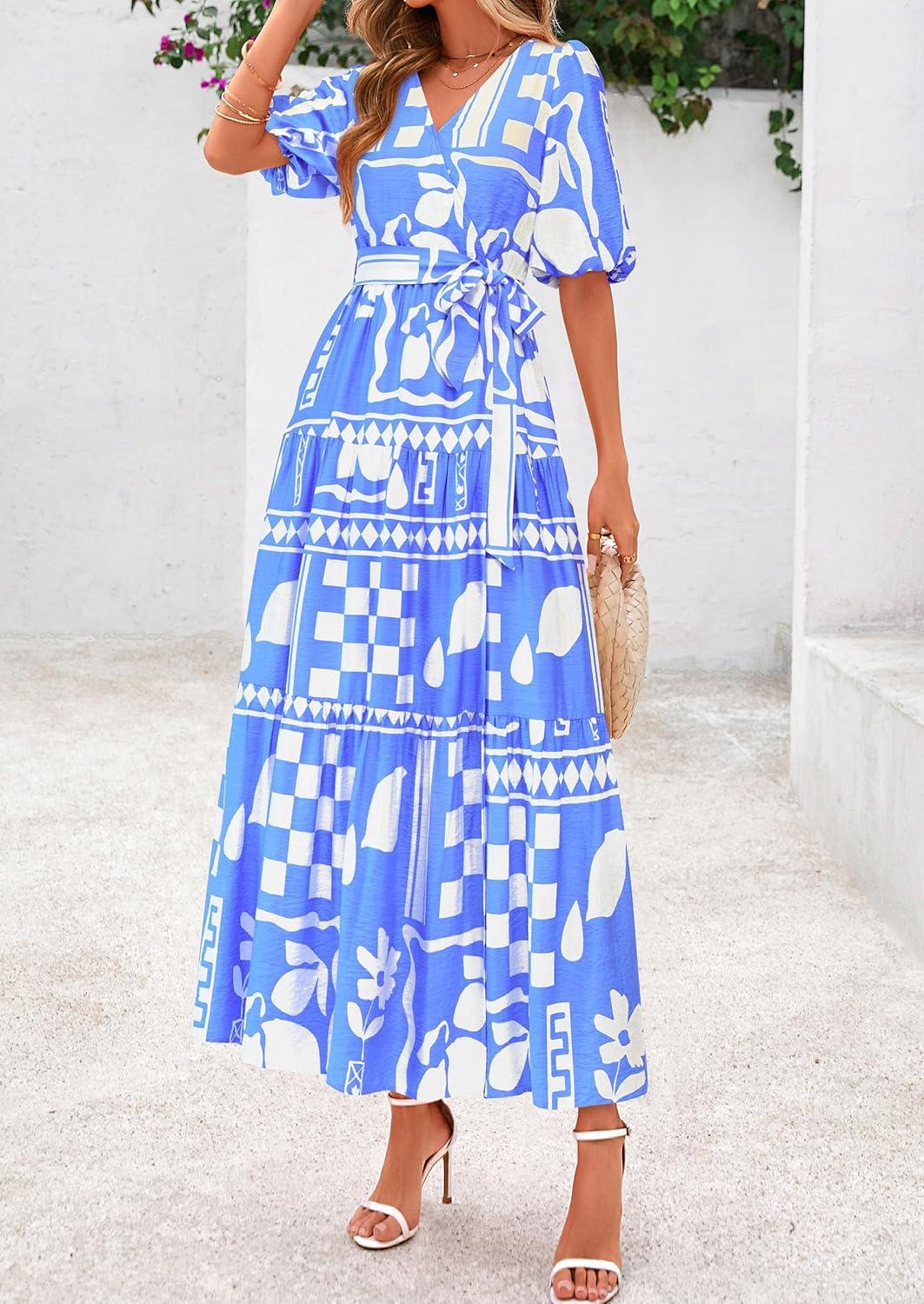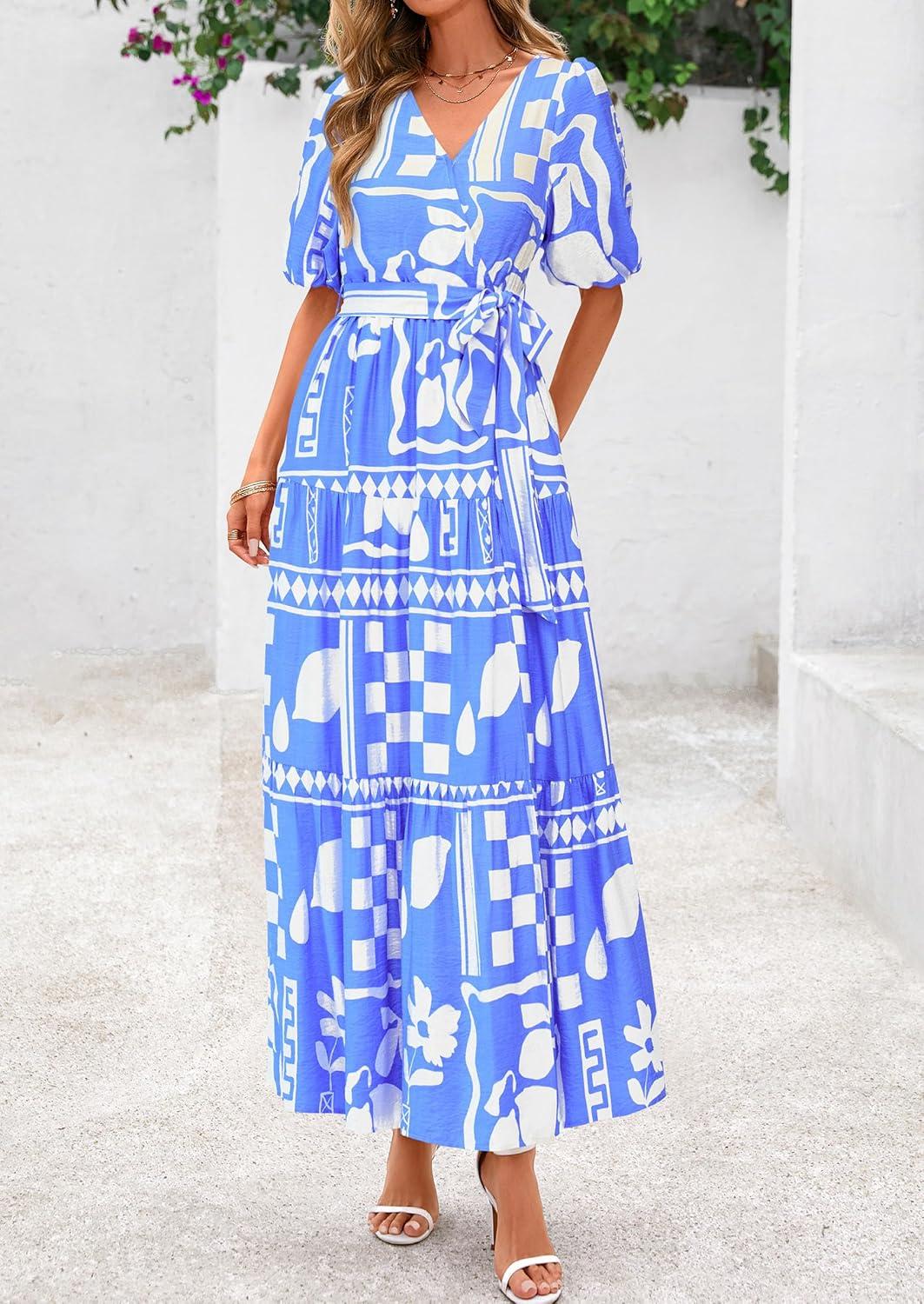 PRETTYGARDEN Women’s Summer Maxi Dress 2025 Resort Wear Boho Floral V Neck Puff Short Sleeve Ruffle Flowy Beach Long Dresses(Blue Flower)