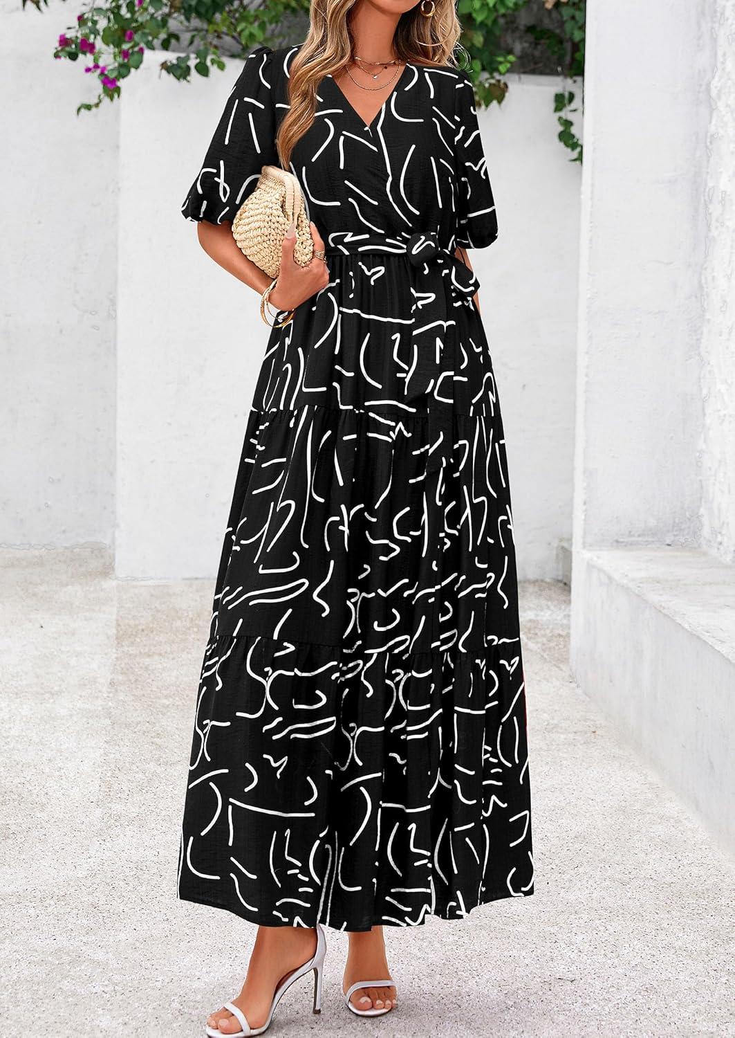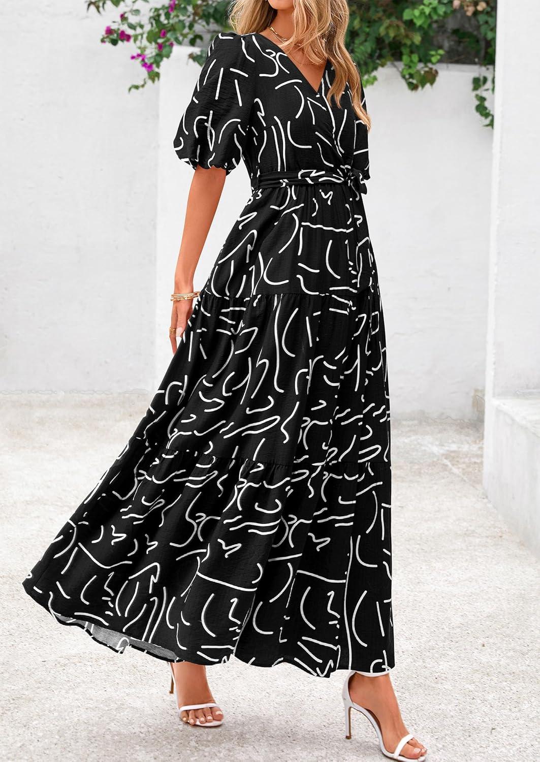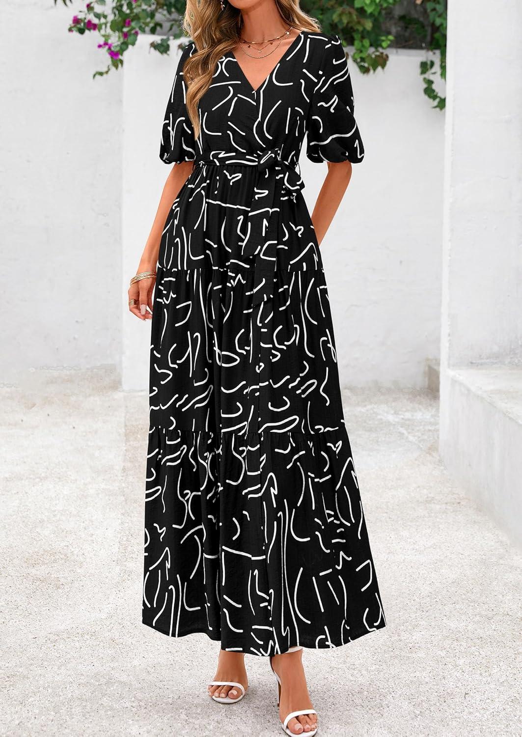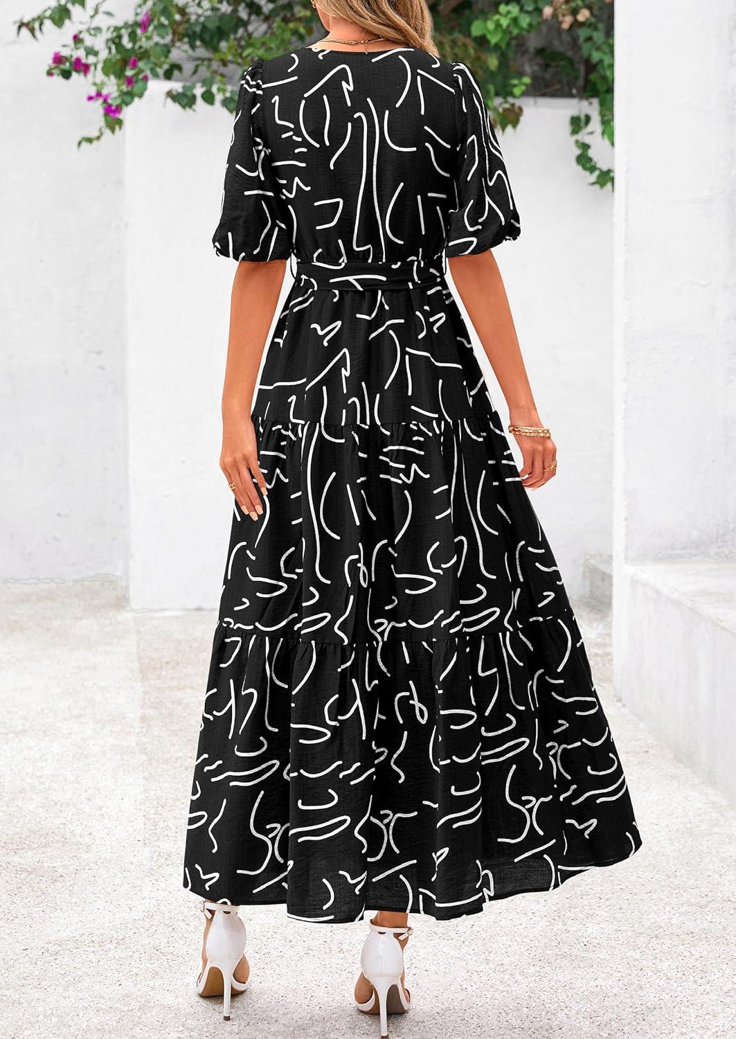 PRETTYGARDEN Women’s Summer Maxi Dress 2025 Resort Wear Boho Floral V Neck Puff Short Sleeve Ruffle Flowy Beach Long Dresses(Floral Black)