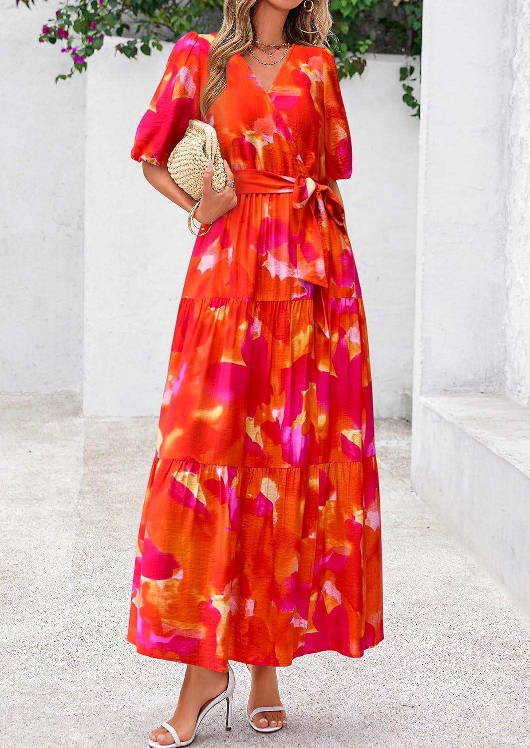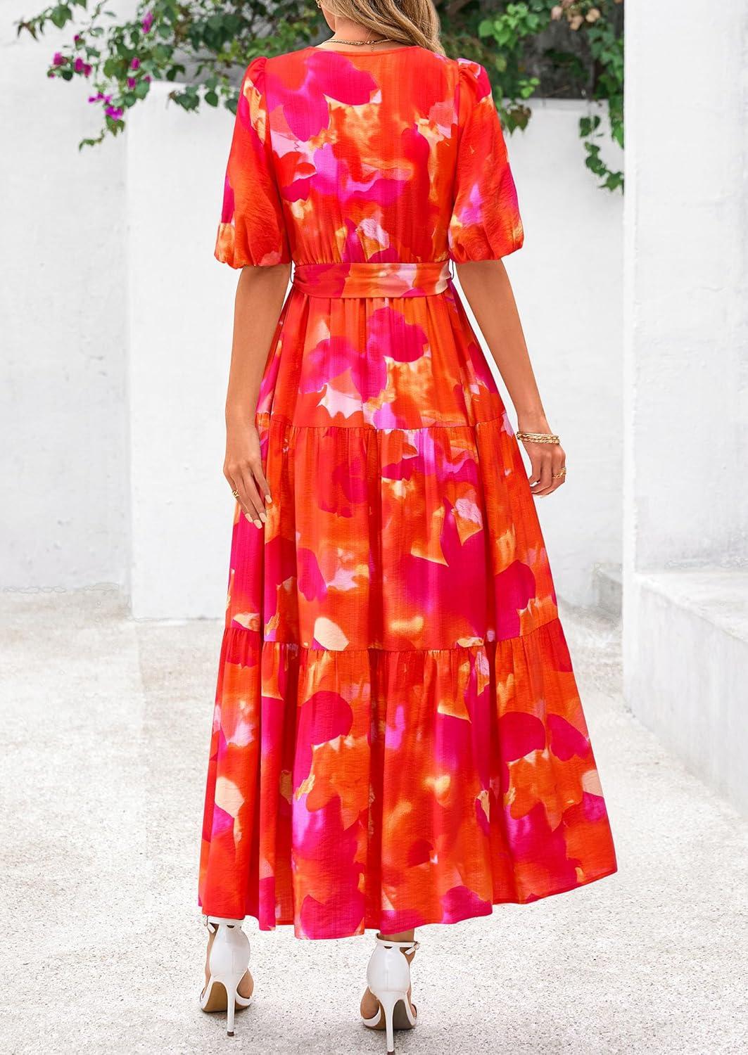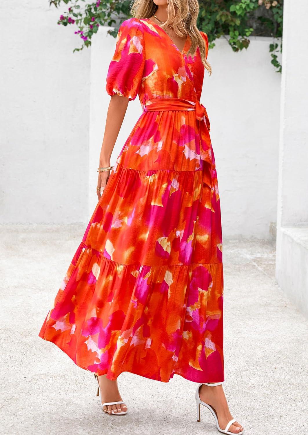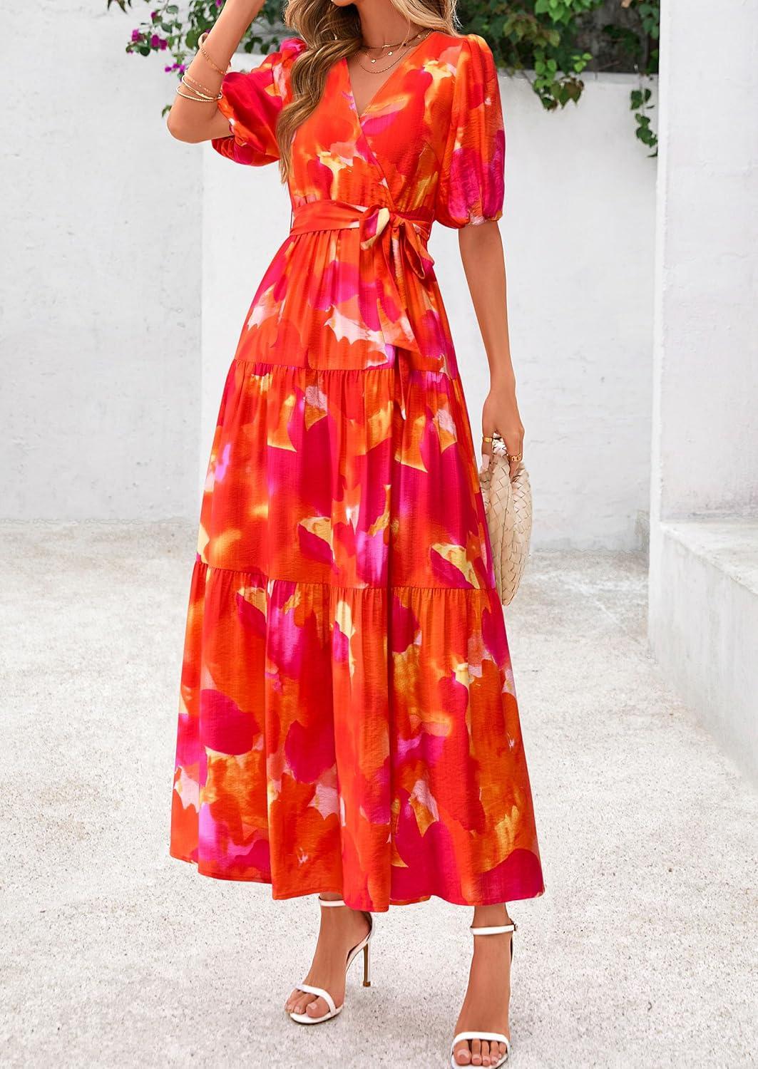 PRETTYGARDEN Women’s Summer Maxi Dress 2025 Resort Wear Boho Floral V Neck Puff Short Sleeve Ruffle Flowy Beach Long Dresses(Floral Orange)