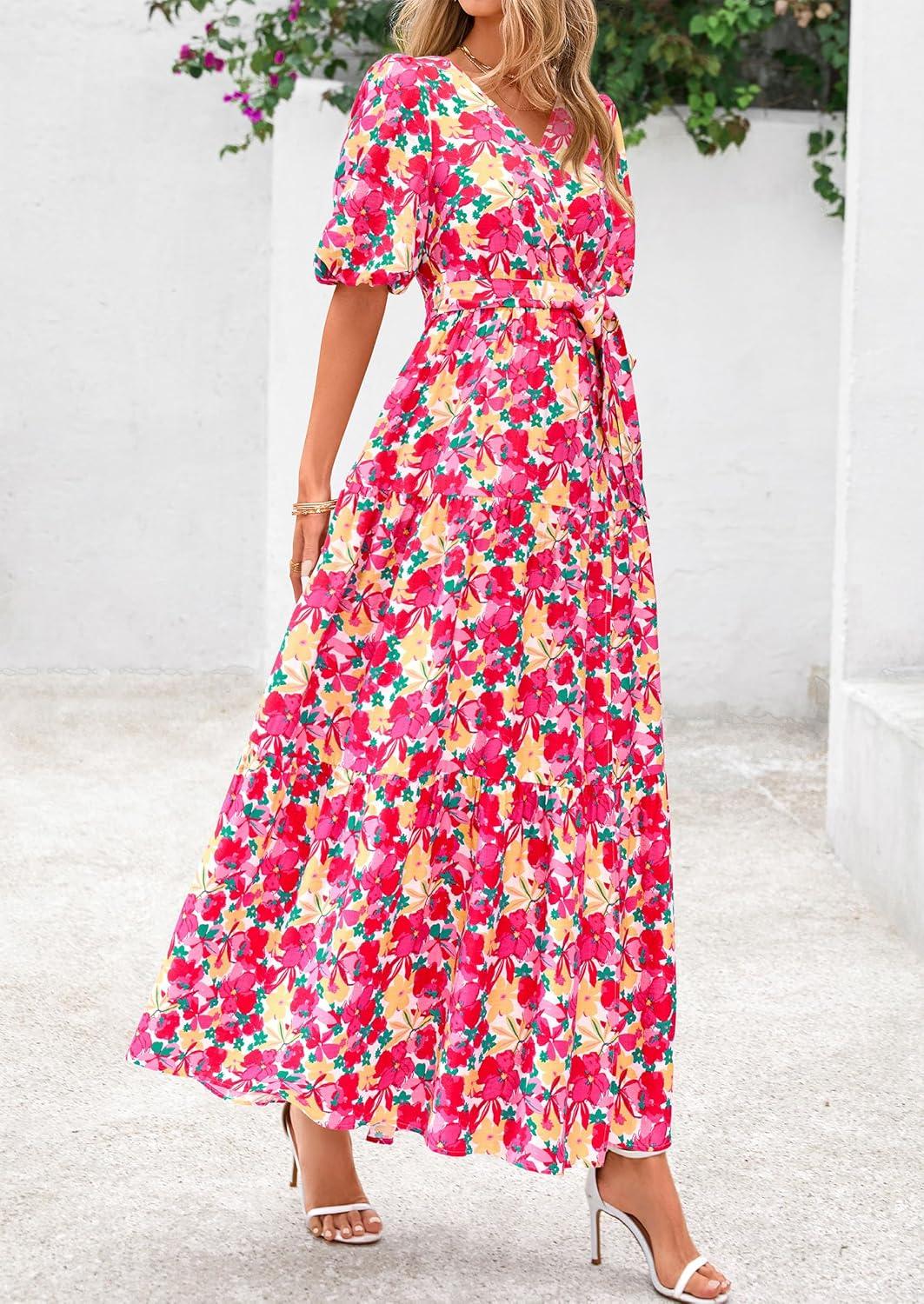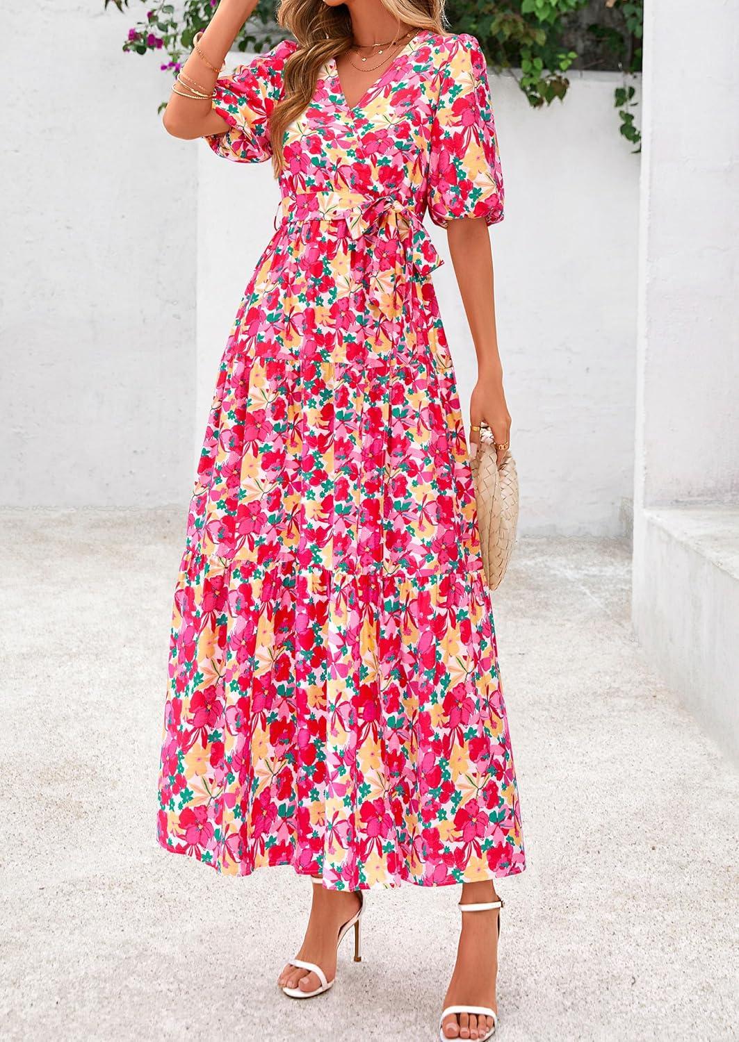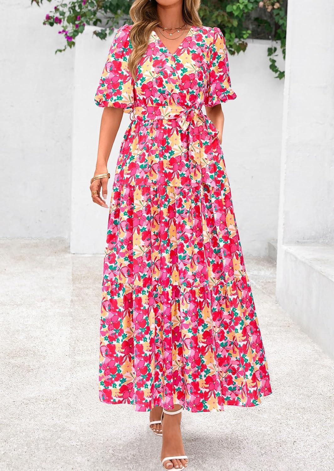PRETTYGARDEN Women’s Summer Maxi Dress 2025 Resort Wear Boho Floral V Neck Puff Short Sleeve Ruffle Flowy Beach Long Dresses(Floral Pink Yellow)