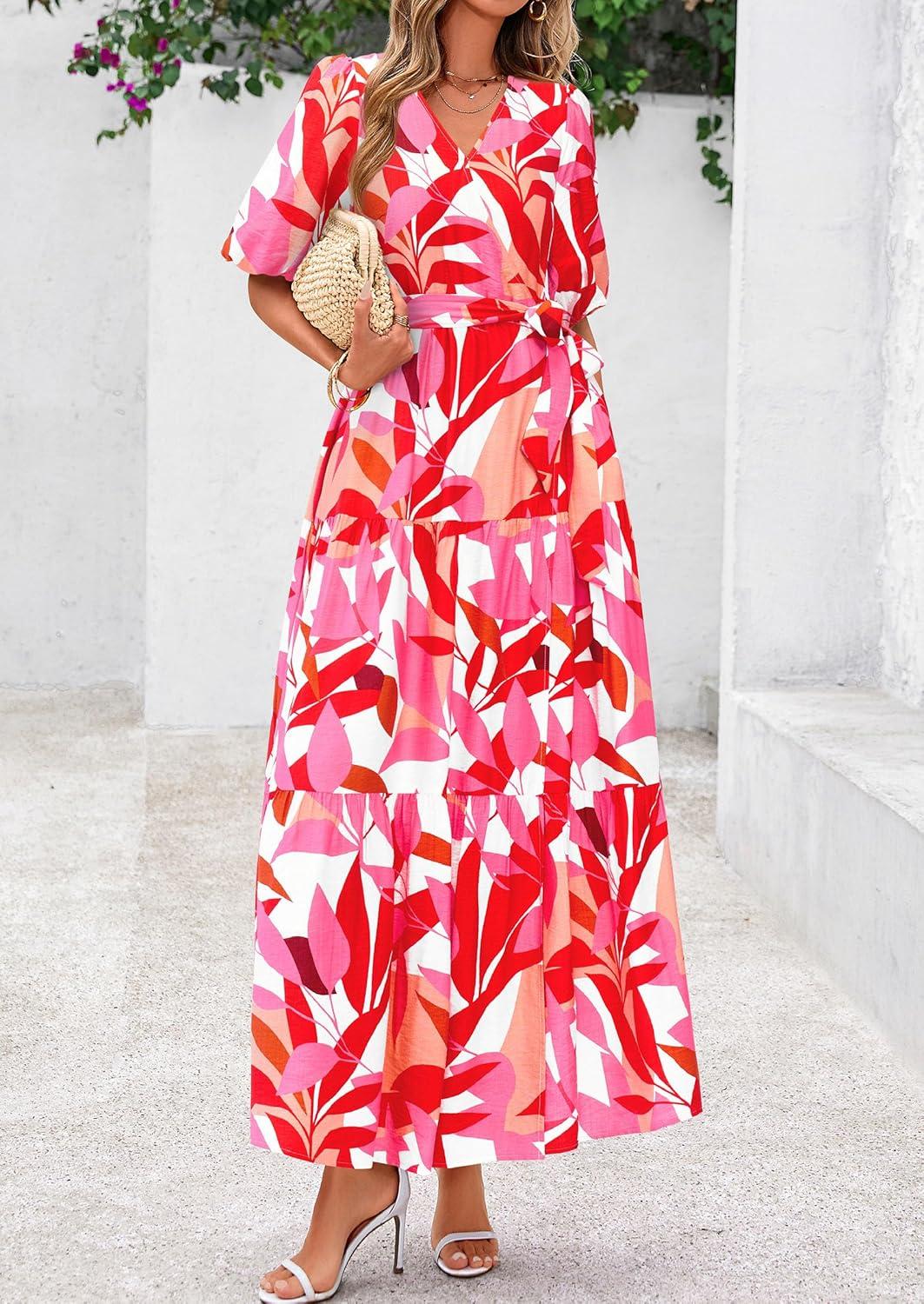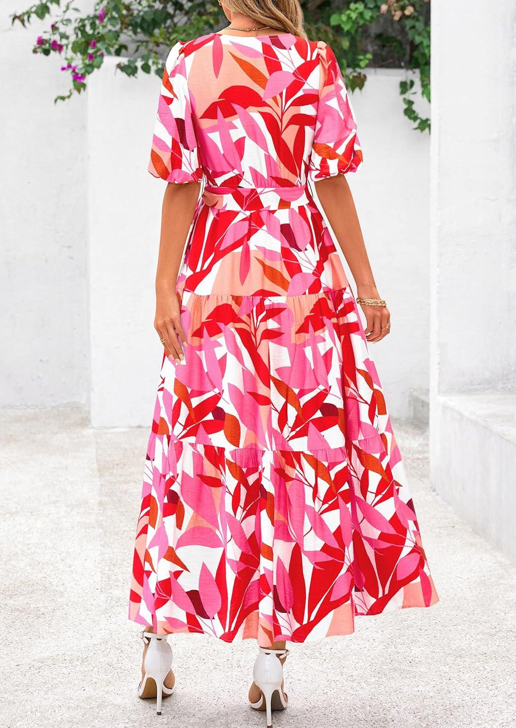 PRETTYGARDEN Women’s Summer Maxi Dress 2025 Resort Wear Boho Floral V Neck Puff Short Sleeve Ruffle Flowy Beach Long Dresses(Floral White Rose Red)