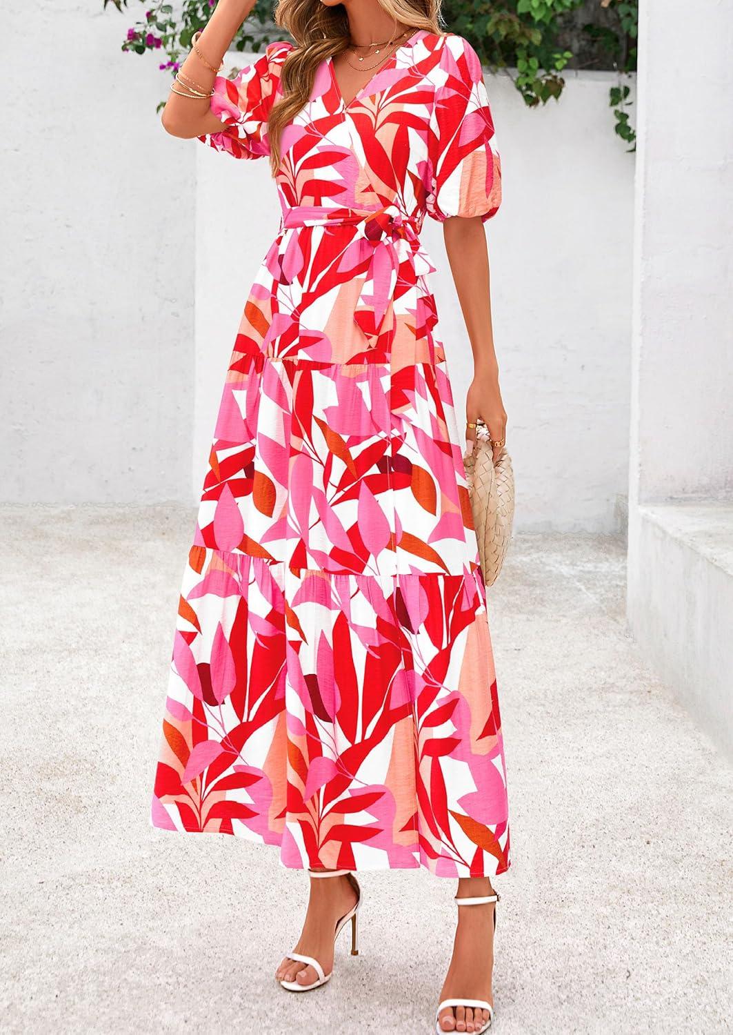 PRETTYGARDEN Women’s Summer Maxi Dress 2025 Resort Wear Boho Floral V Neck Puff Short Sleeve Ruffle Flowy Beach Long Dresses(Floral Pink Yellow)
