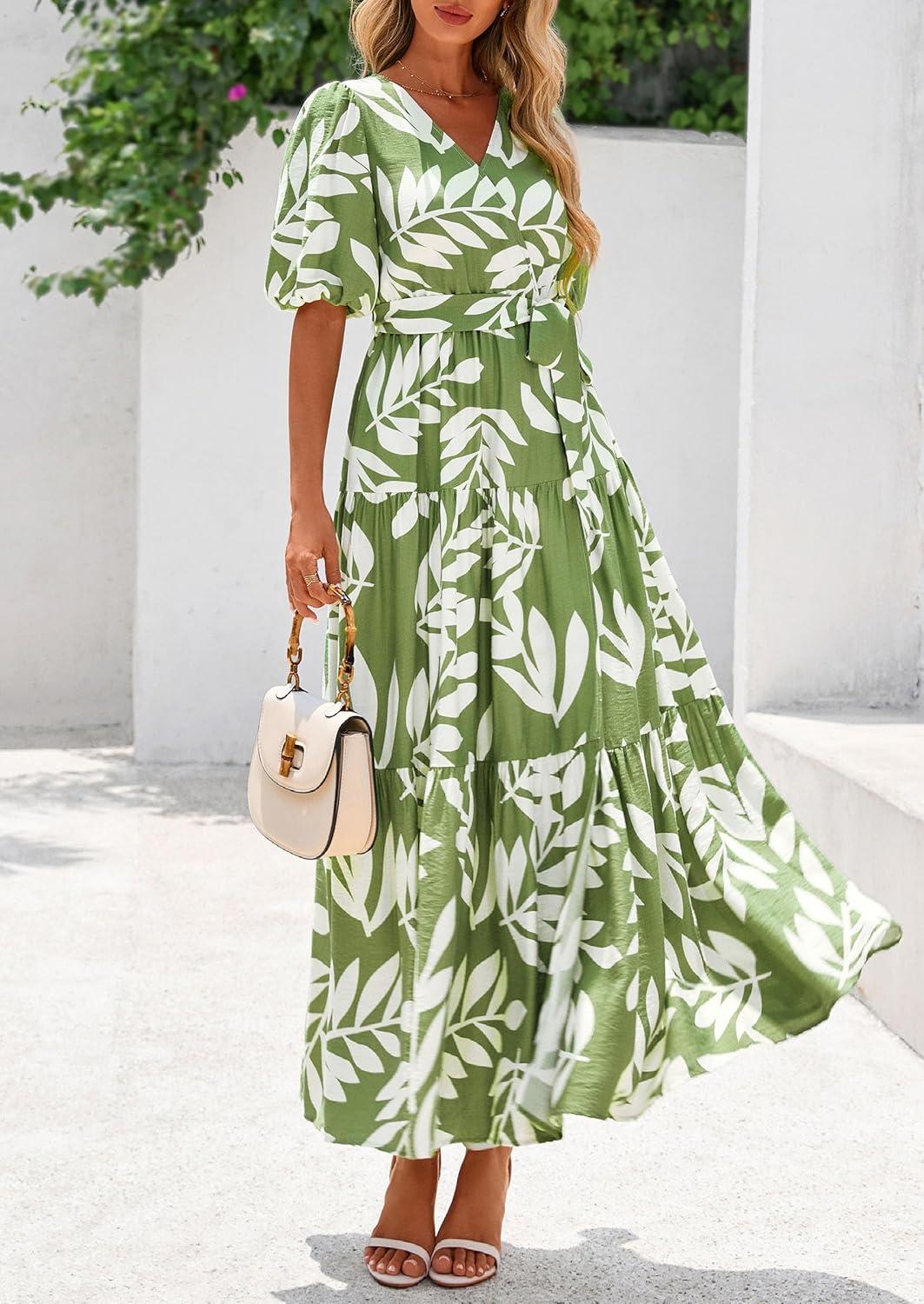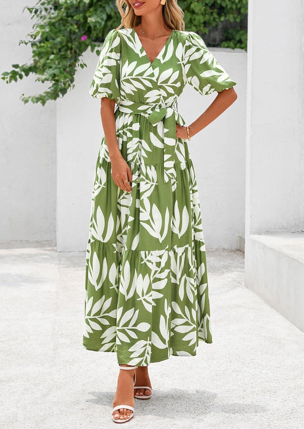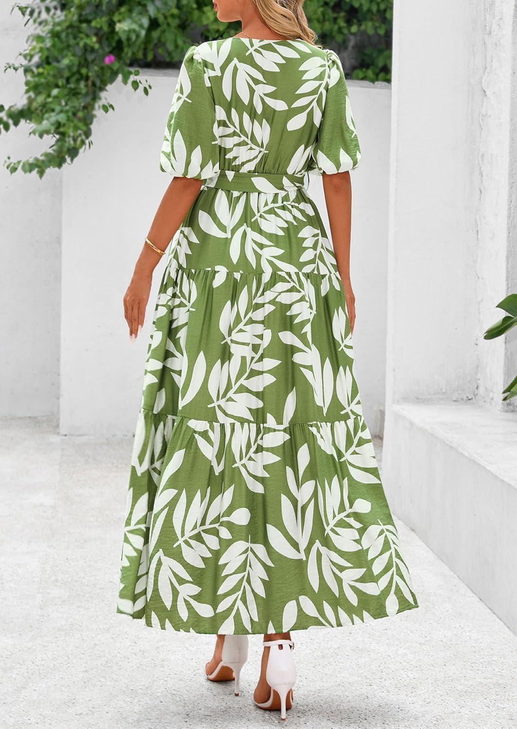 PRETTYGARDEN Women's Summer Maxi Dress 2025 Resort Wear Boho Floral V Neck Puff Short Sleeve Ruffle Flowy Beach Long Dresses(Leaves Light Green)