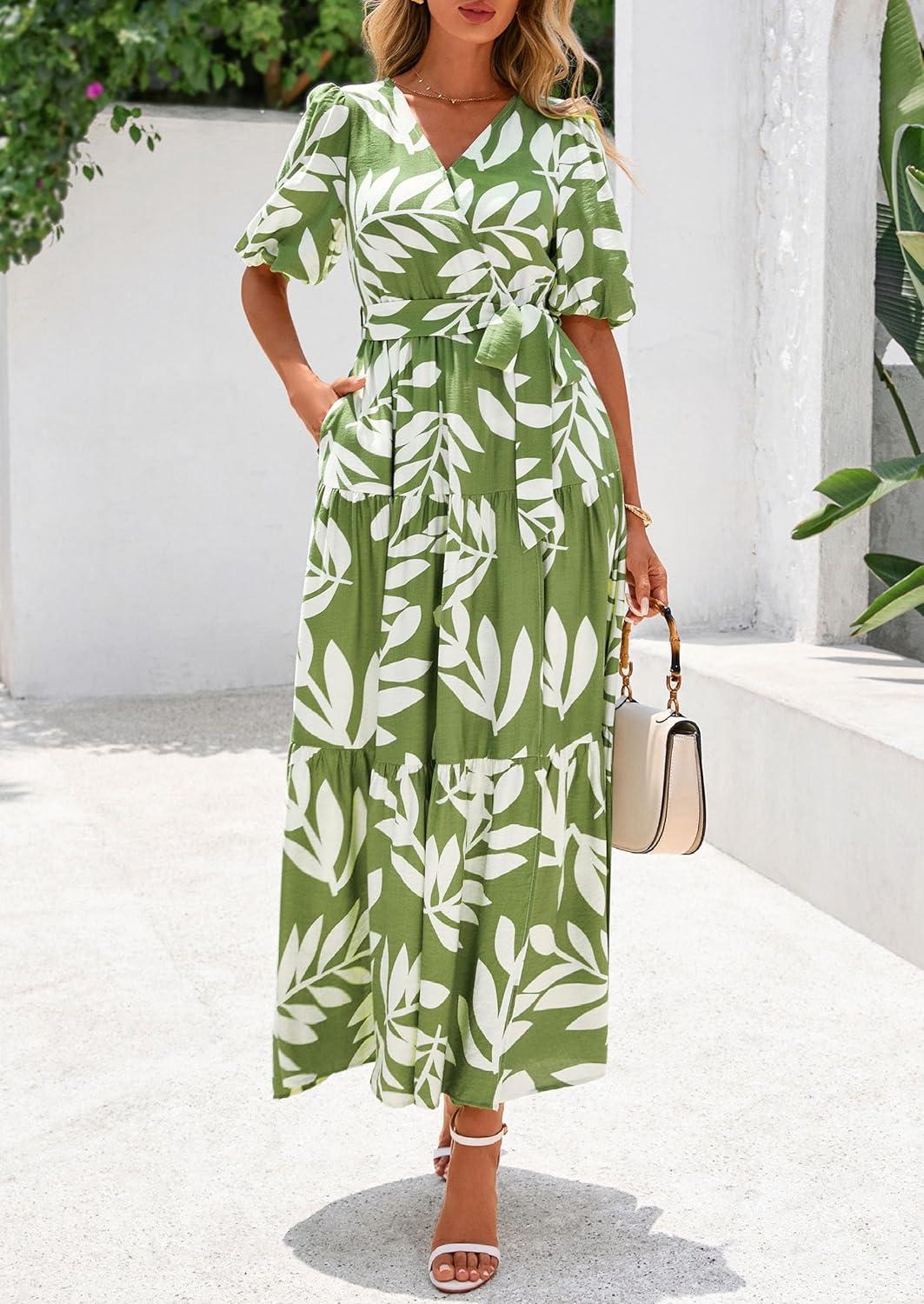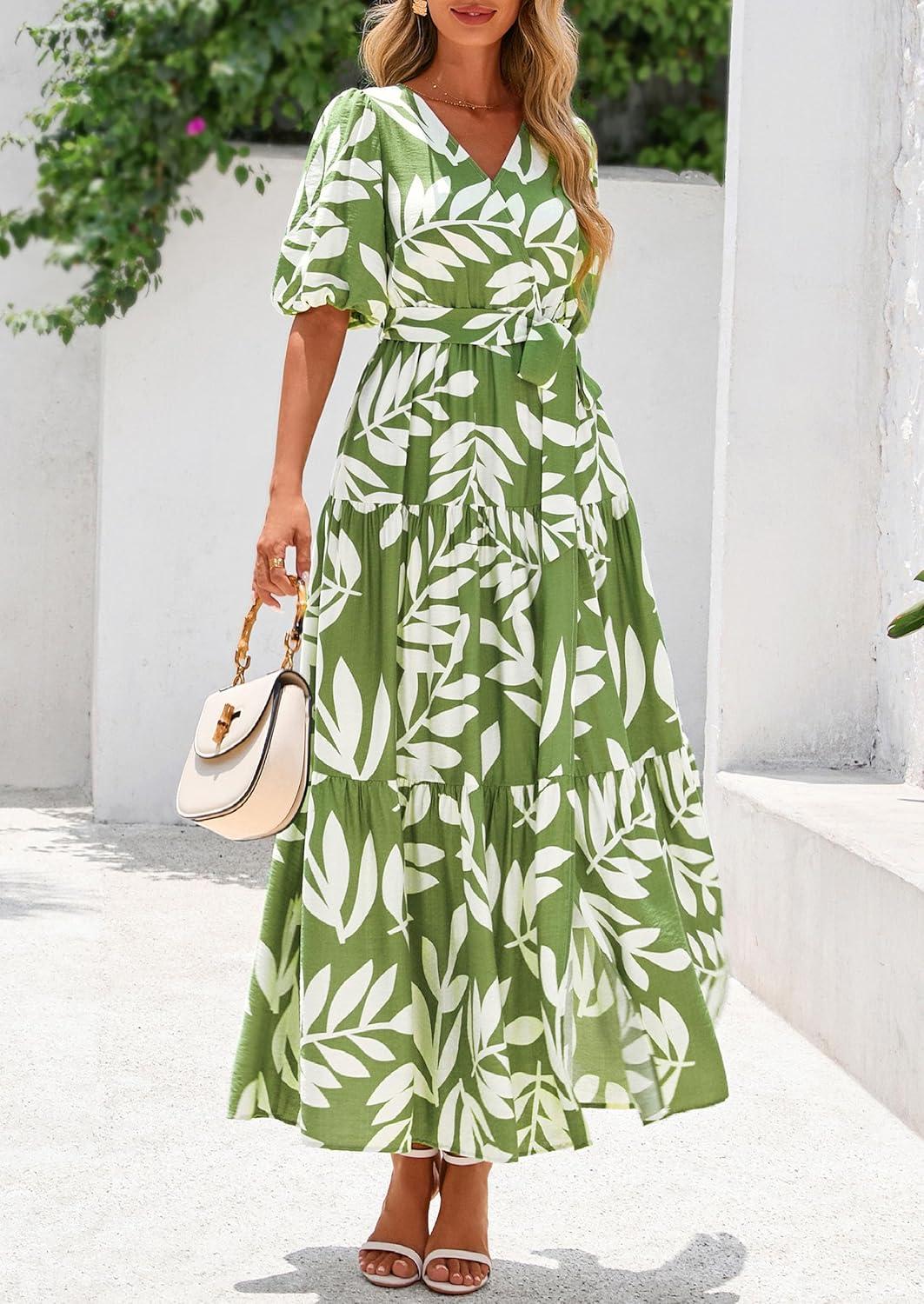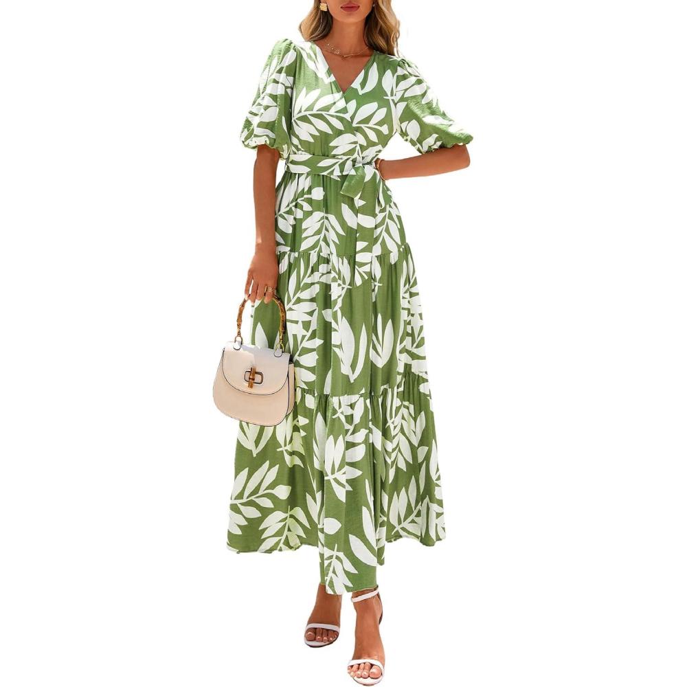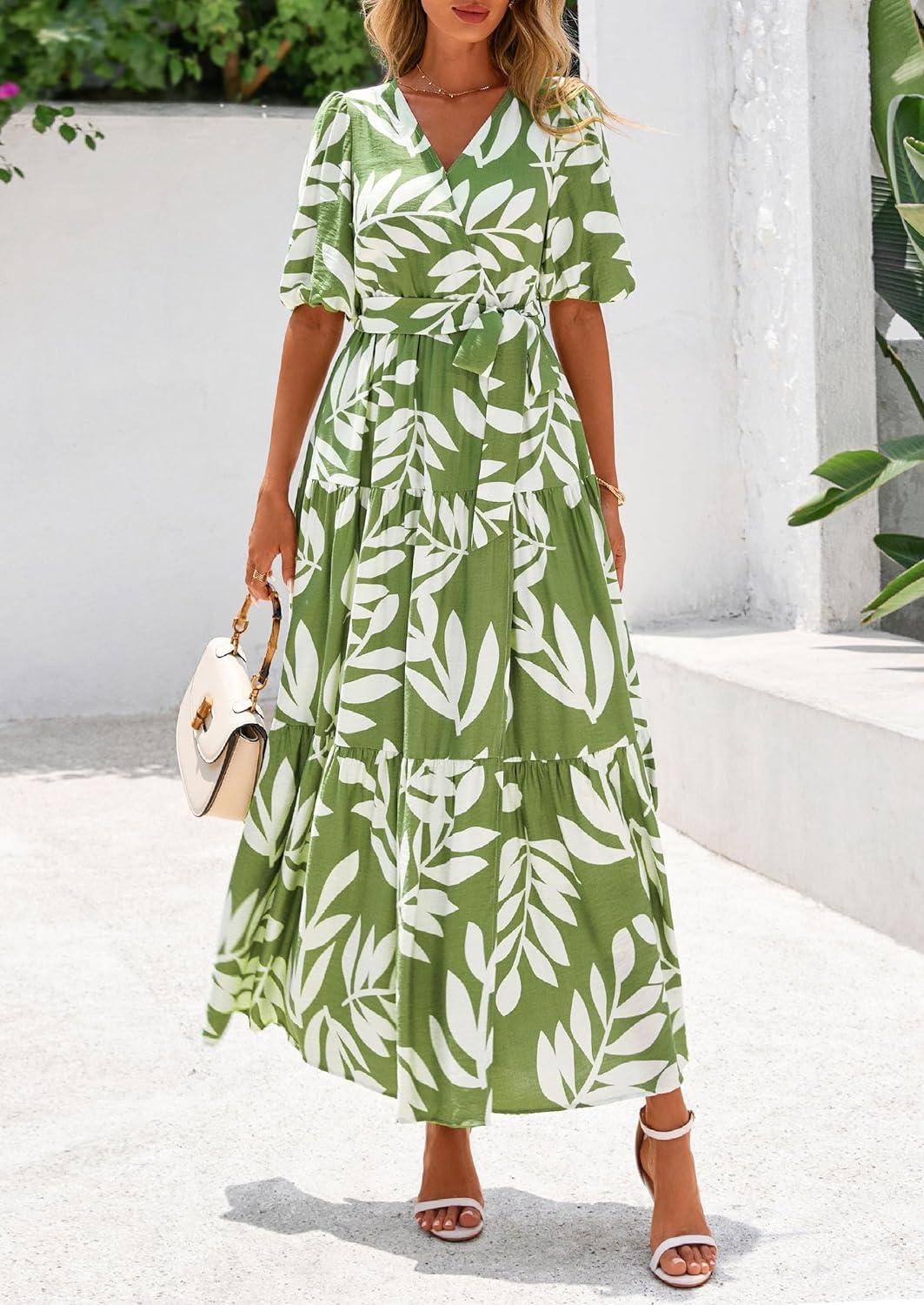 PRETTYGARDEN Women's Summer Maxi Dress 2025 Resort Wear Boho Floral V Neck Puff Short Sleeve Ruffle Flowy Beach Long Dresses(Leaves Light Green)