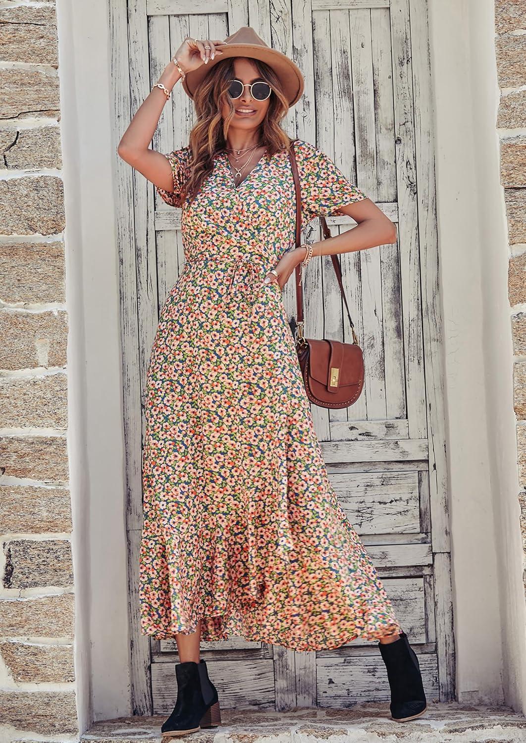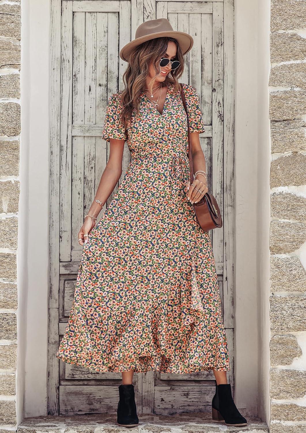 PRETTYGARDEN Women’s Summer Maxi Dress Casual Wrap Floral Boho Short Sleeve V Neck Split Ruffle Beach Long Dresses(Blue Orange Floral)
