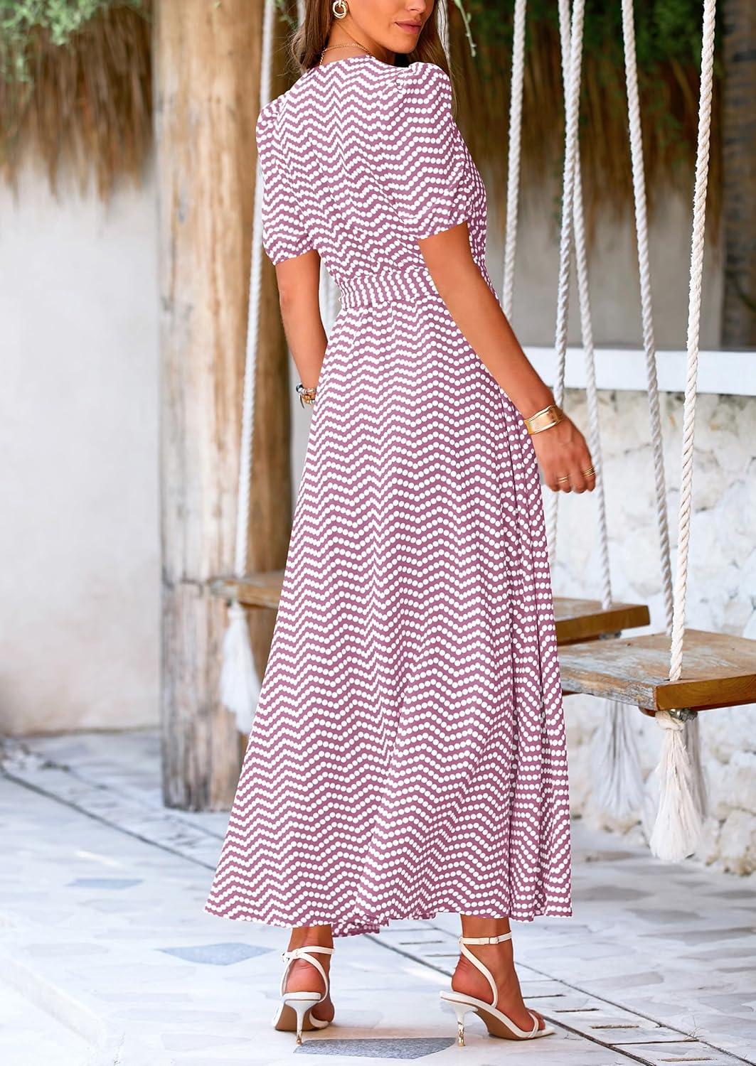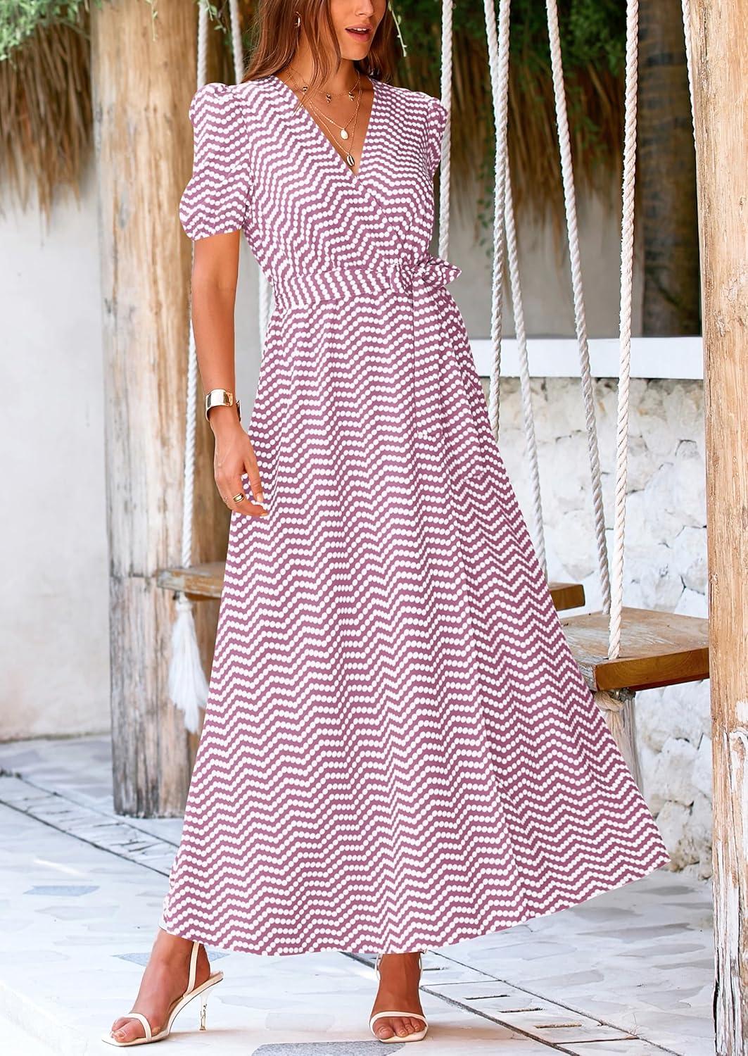 PRETTYGARDEN Women's Summer Maxi Dress Casual Wrap Floral Boho Short Sleeve V Neck Split Ruffle Beach Long Dresses(Dot Pink White)