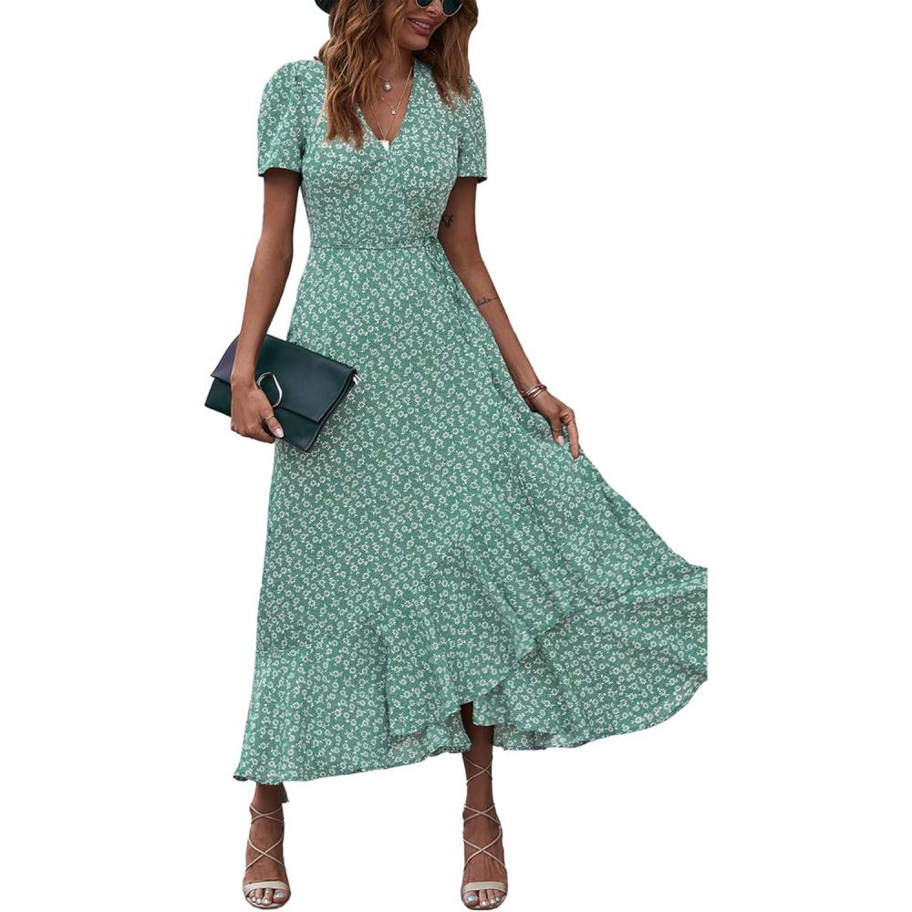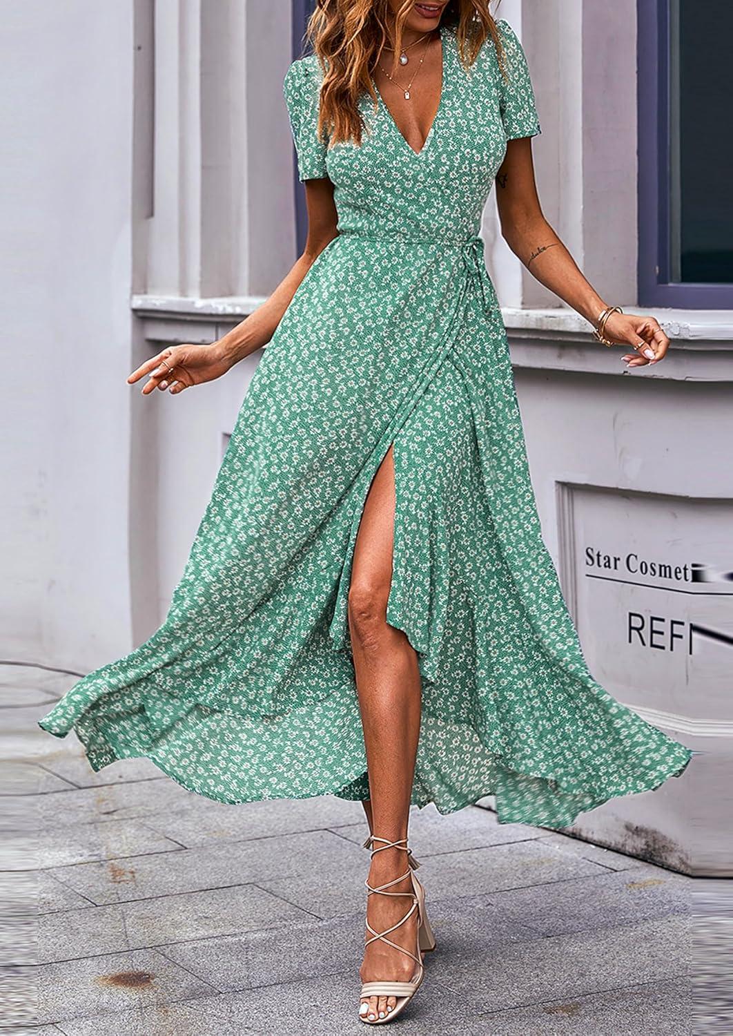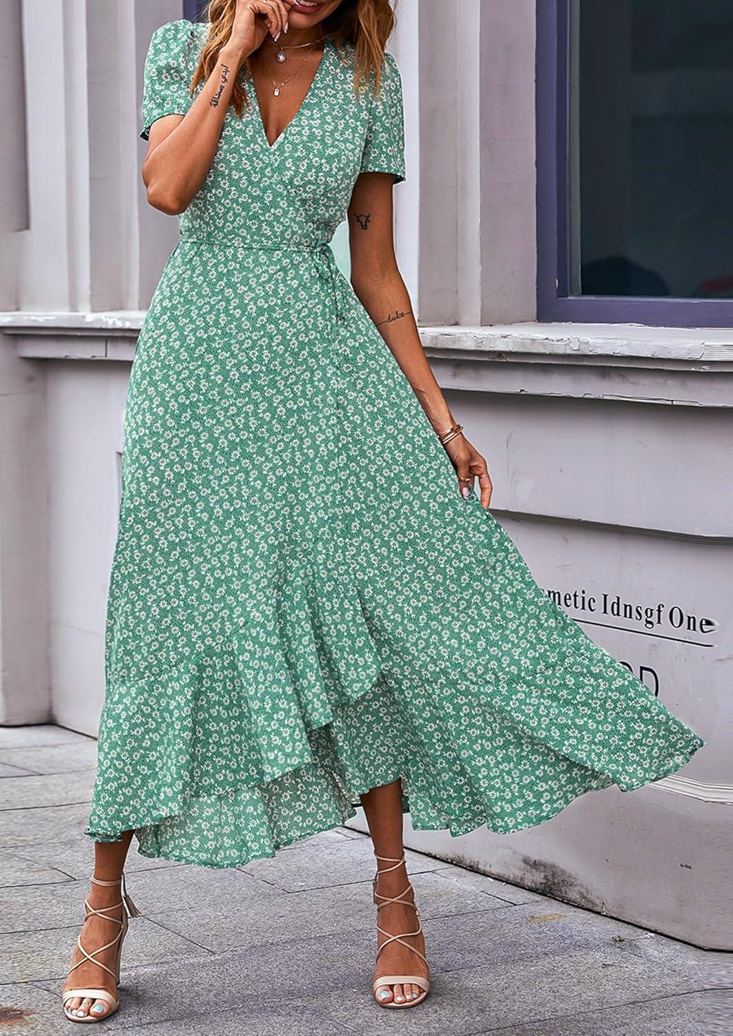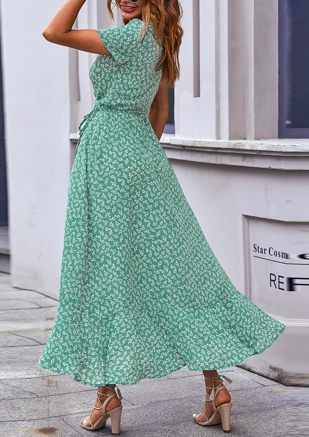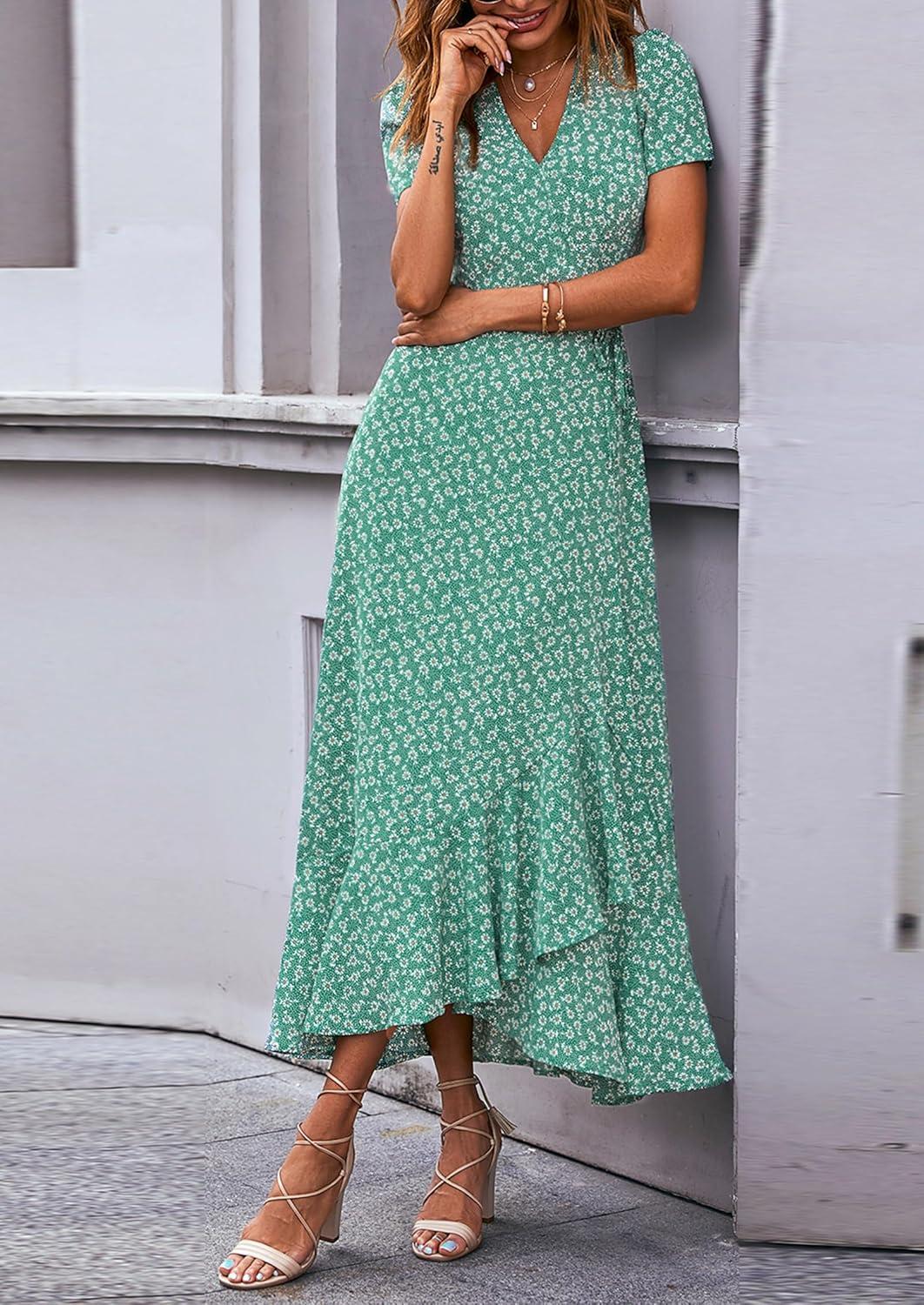 PRETTYGARDEN Women's Summer Maxi Dress Casual Wrap Floral Boho Short Sleeve V Neck Split Ruffle Beach Long Dresses(Green)
