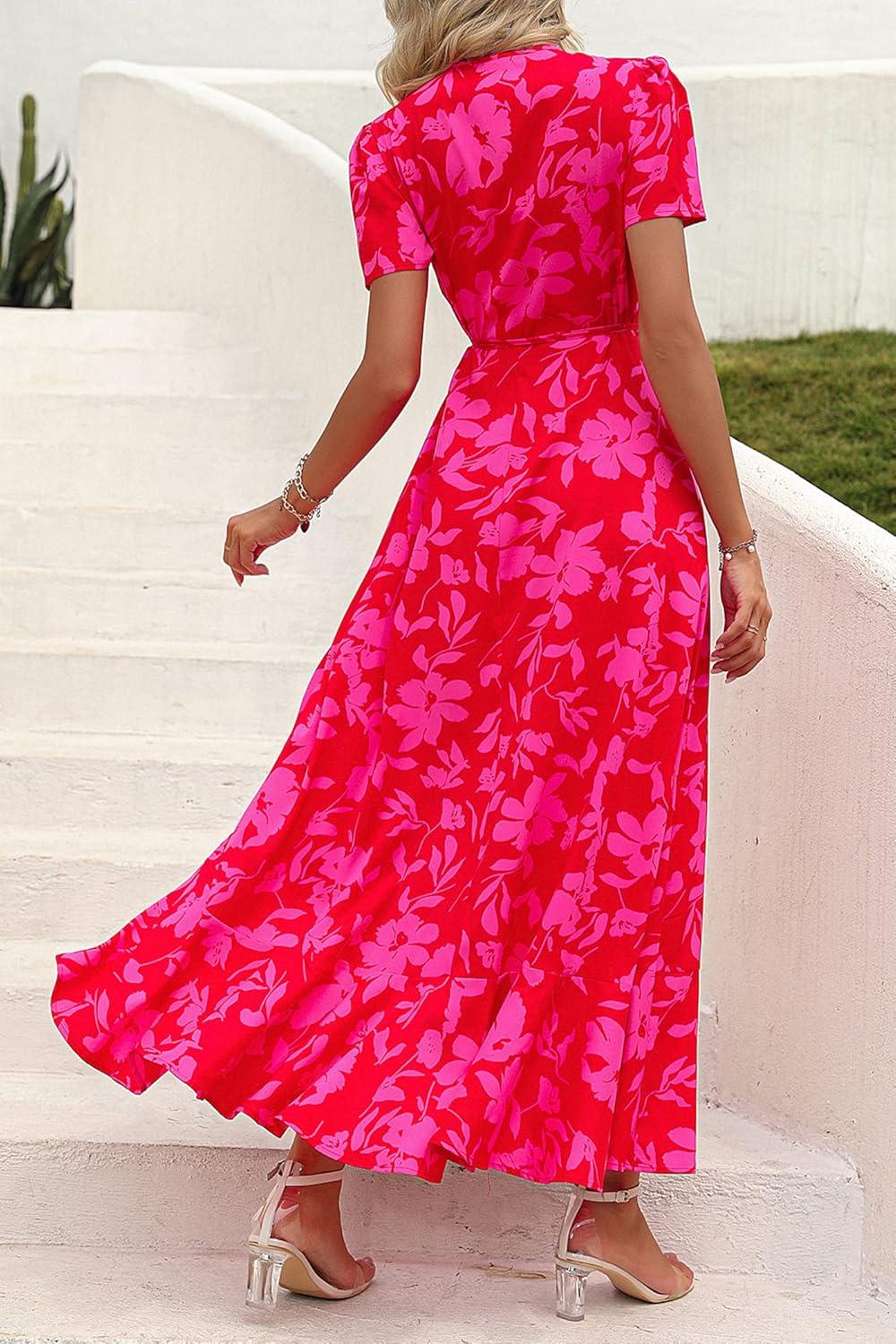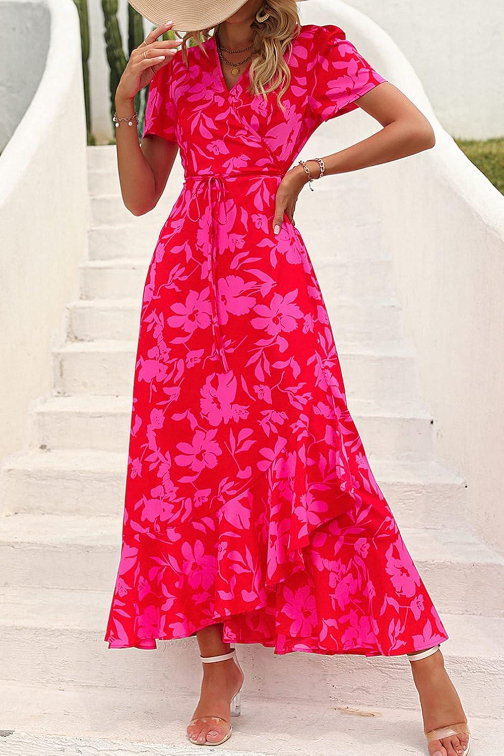 PRETTYGARDEN Women's Summer Maxi Dress Casual Wrap Floral Boho Short Sleeve V Neck Split Ruffle Beach Long Dresses(Red Floral)