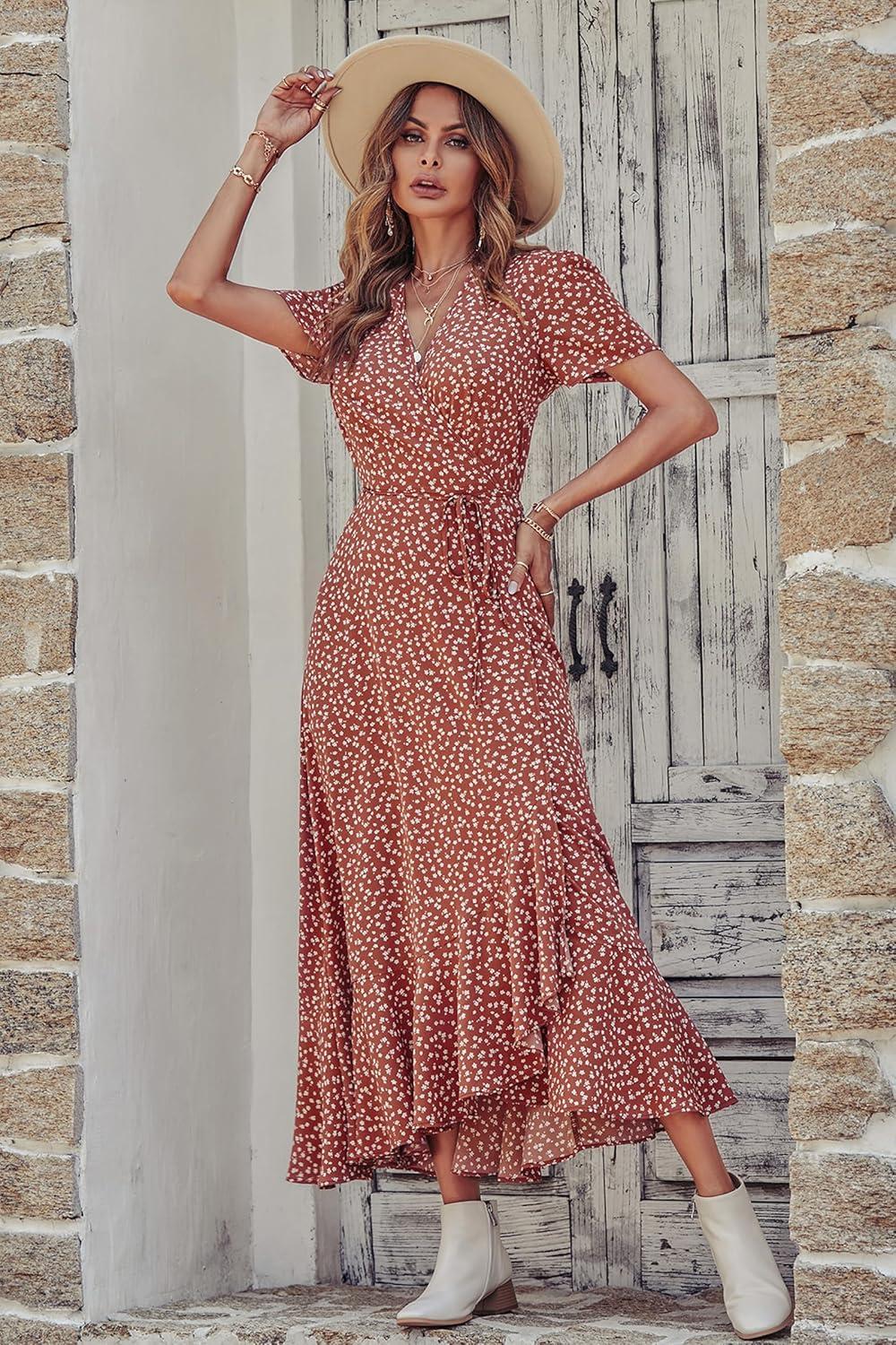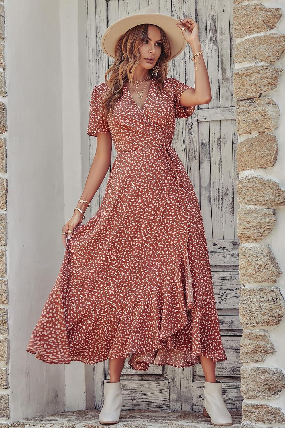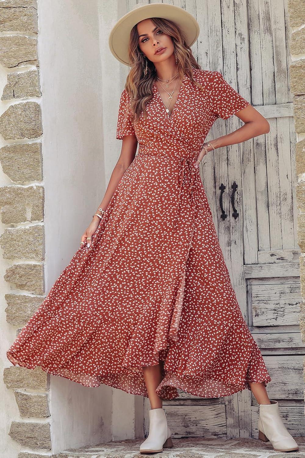 PRETTYGARDEN Women’s Summer Maxi Dress Casual Wrap Floral Boho Short Sleeve V Neck Split Ruffle Beach Long Dresses(Red Floral)