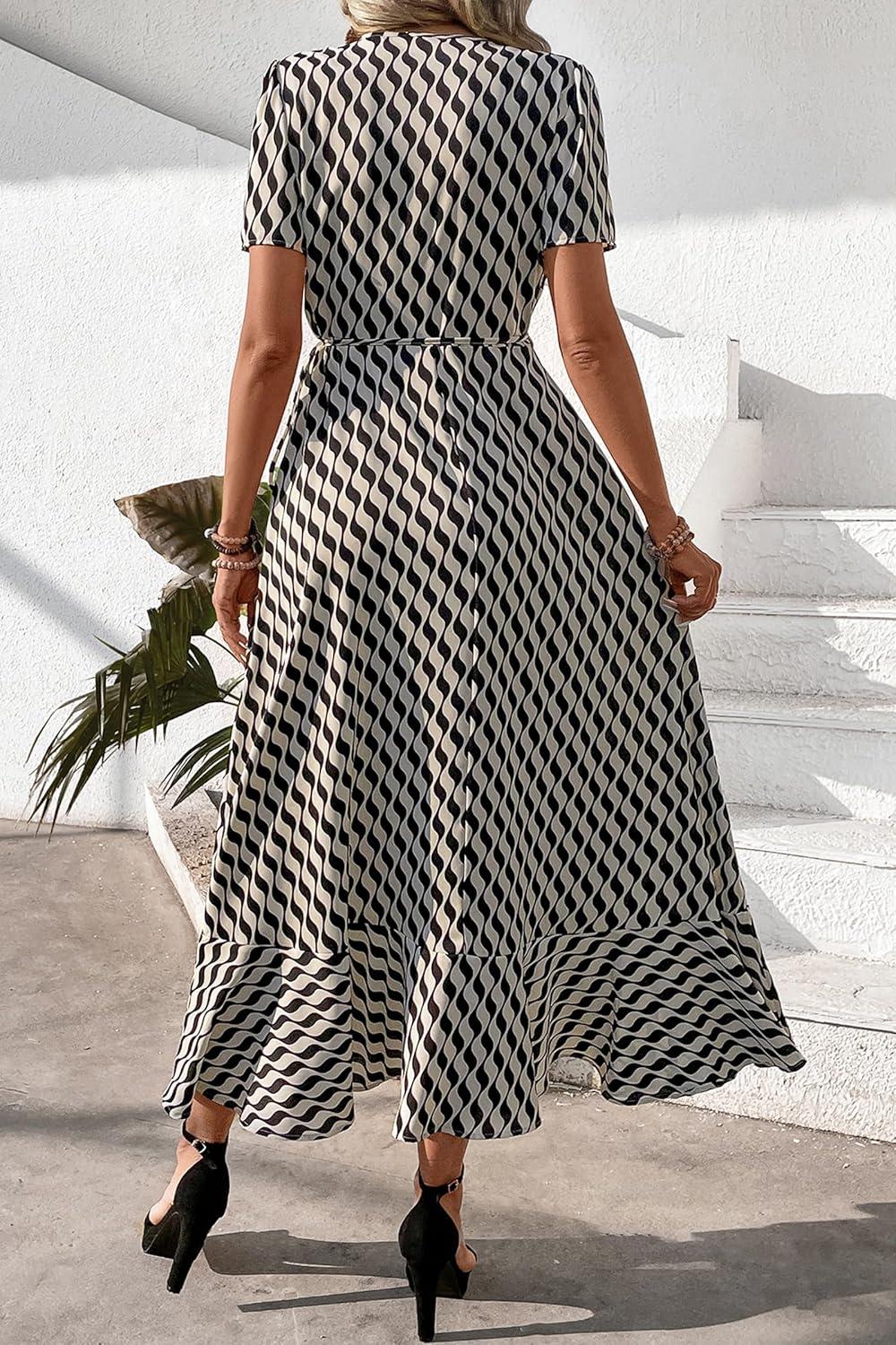 PRETTYGARDEN Women's Summer Maxi Dress Casual Wrap Floral Boho Short Sleeve V Neck Split Ruffle Beach Long Dresses(White Wave)