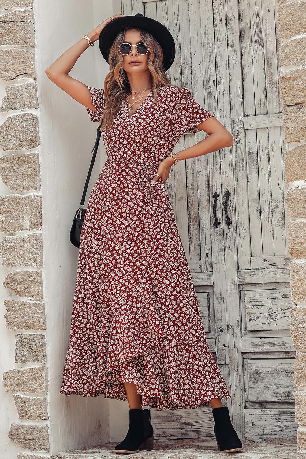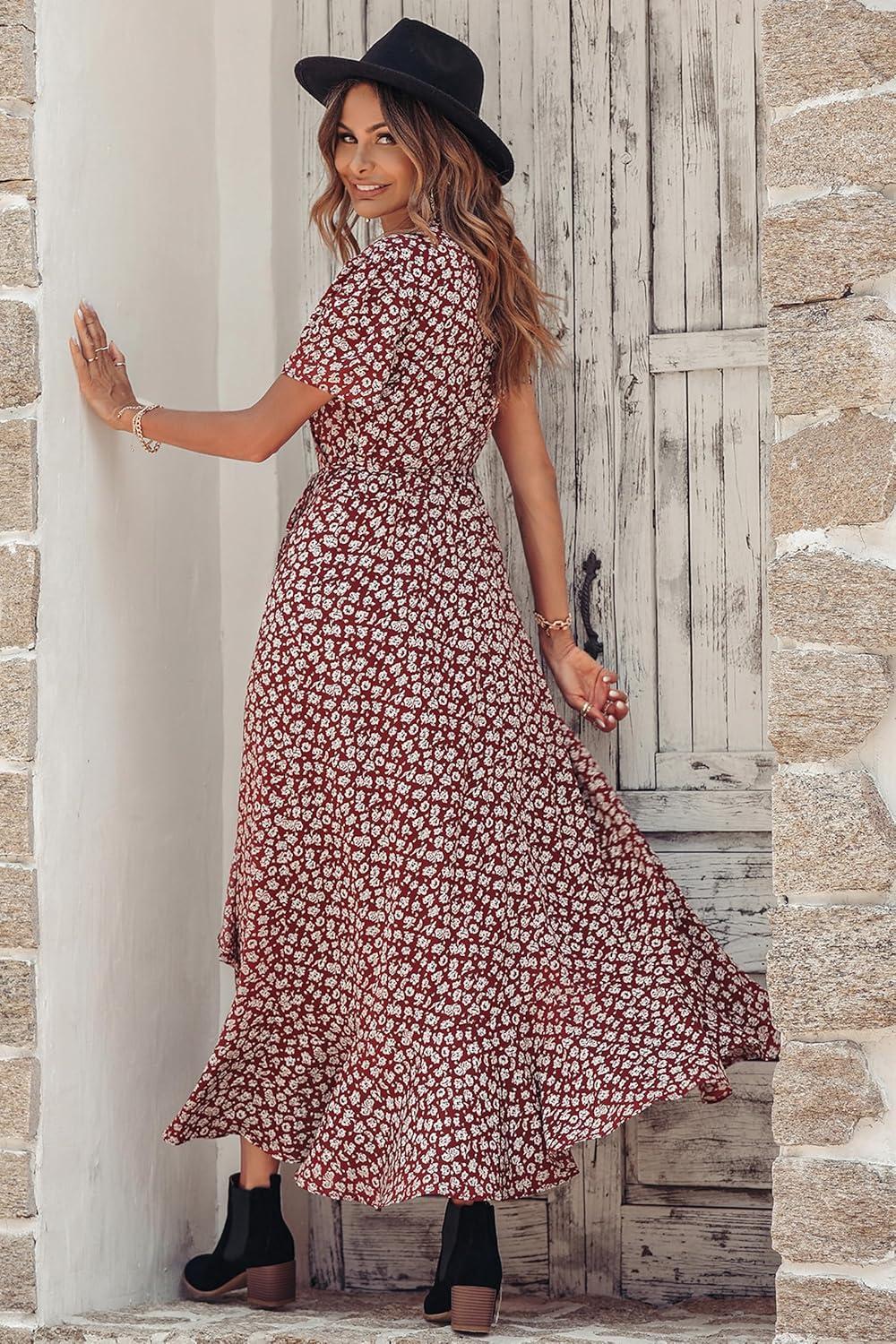 PRETTYGARDEN Women’s Summer Maxi Dress Casual Wrap Floral Boho Short Sleeve V Neck Split Ruffle Beach Long Dresses(Wine Red Floral)