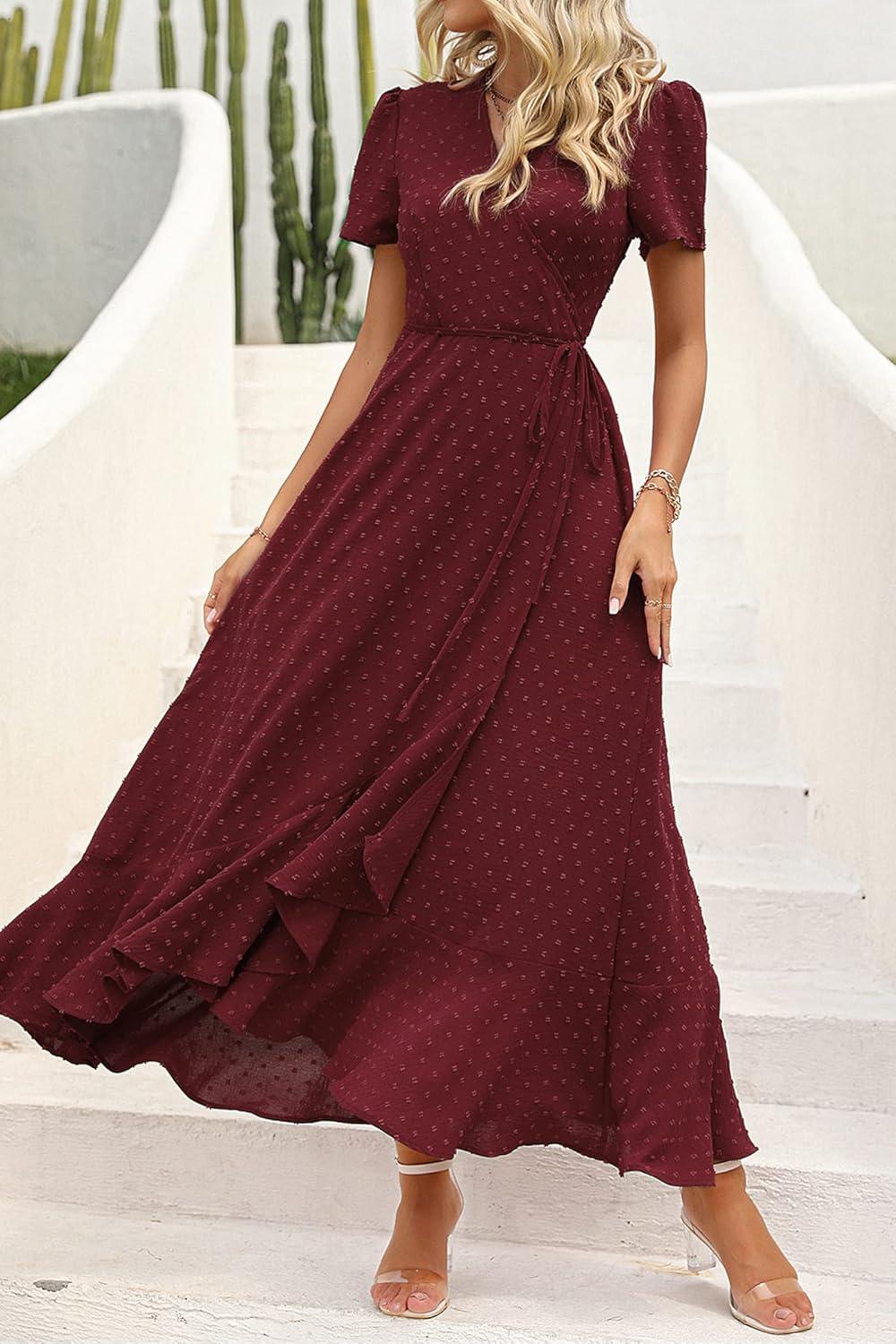 PRETTYGARDEN Women's Summer Maxi Dress Casual Wrap Floral Boho Short Sleeve V Neck Split Ruffle Beach Long Dresses(Z_wine Red)