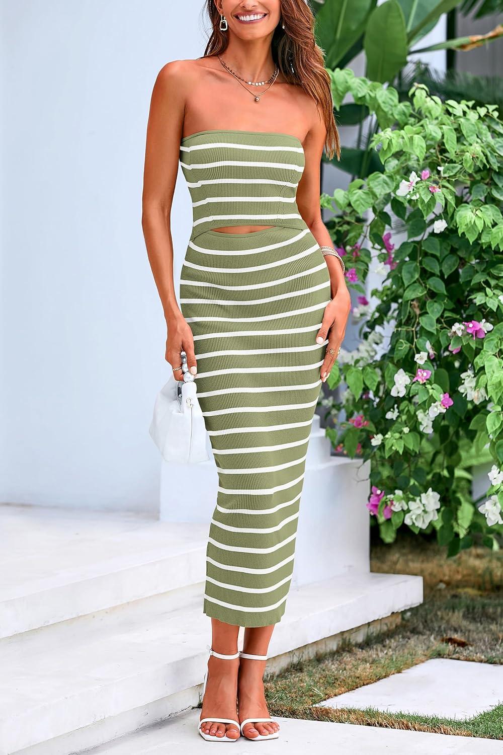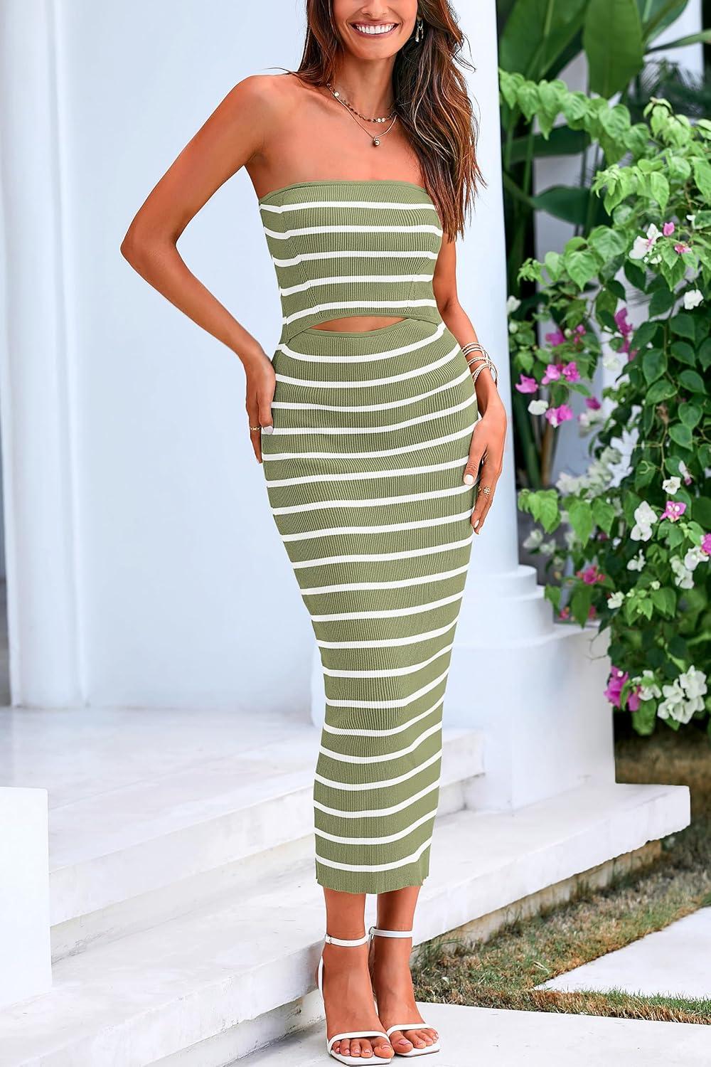 PRETTYGARDEN Women’s Summer Midi Bodycon Dress Strapless Cut Out Knit Tube Long Fitted Dresses(Striped Army Green White)