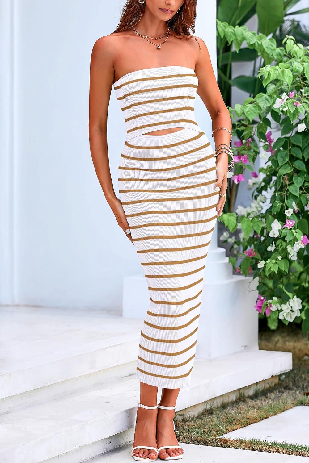 PRETTYGARDEN Women's Summer Midi Bodycon Dress Strapless Cut Out Knit Tube Long Fitted Dresses(Striped White Khaki)
