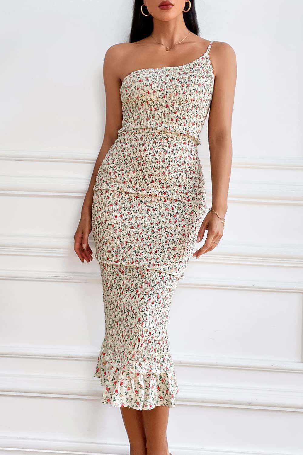 PRETTYGARDEN Women's Summer Midi Bodycon Dresses One Shoulder Strappy Tiered Ruffle Floral Boho Sun Dress(Beige Floral)