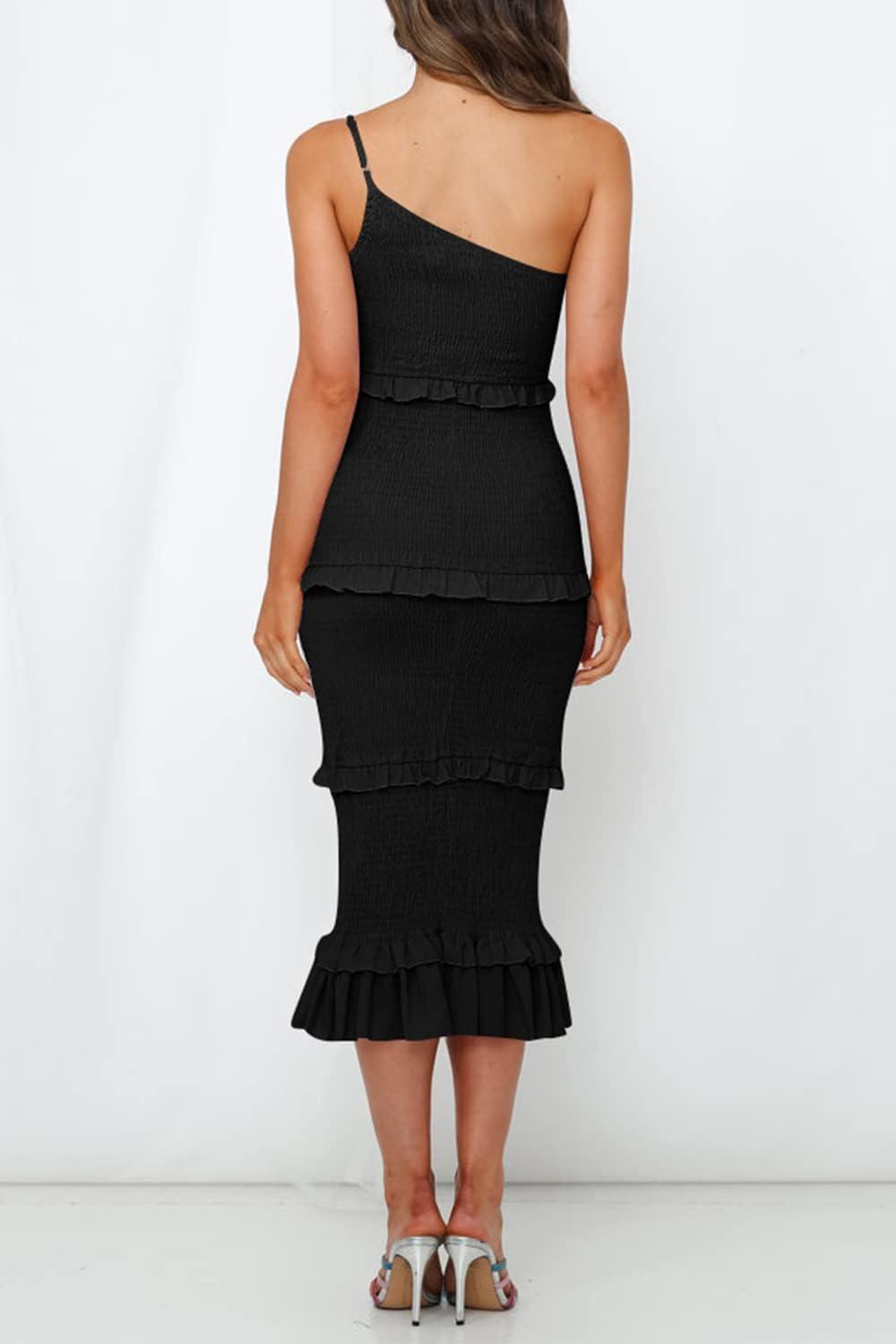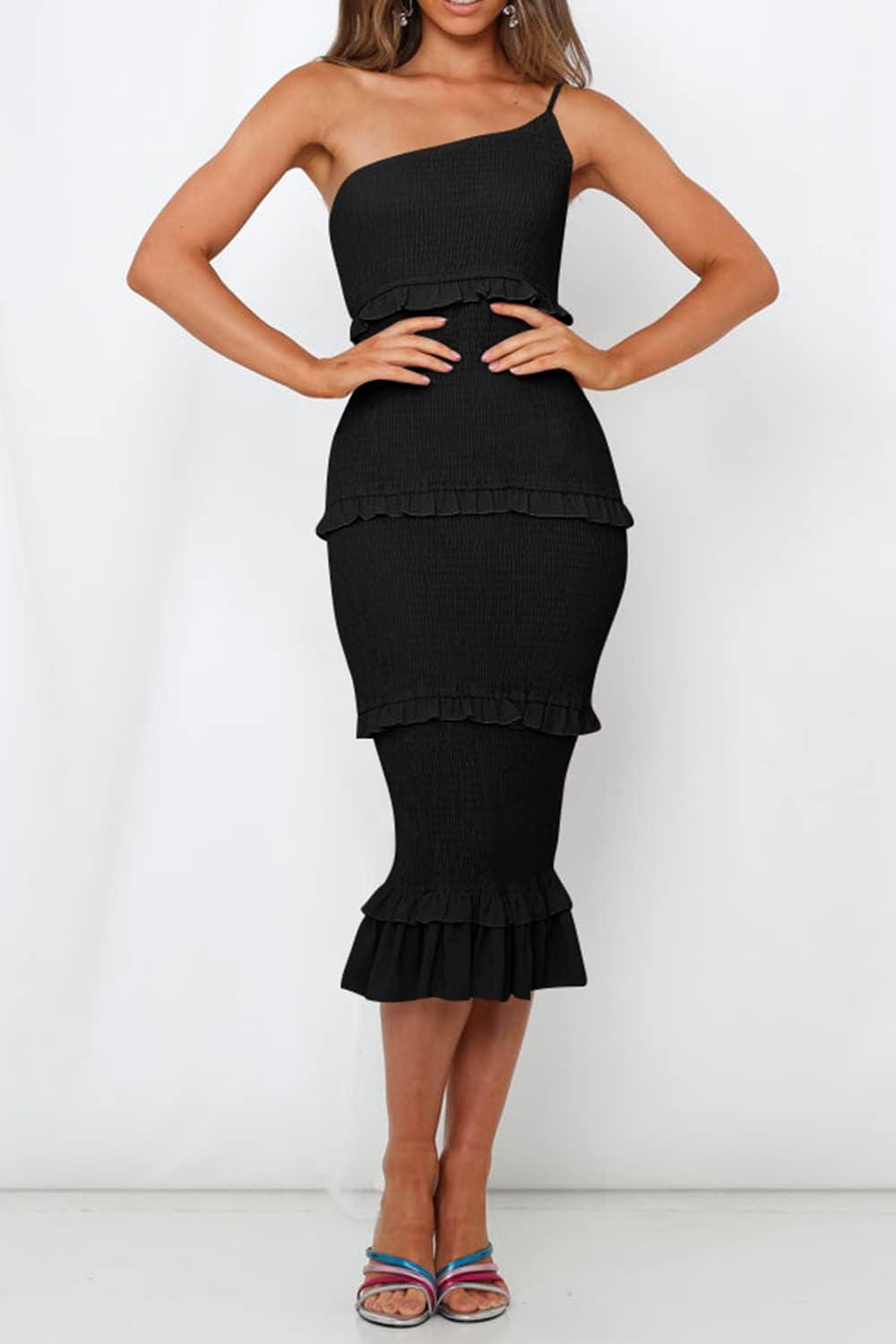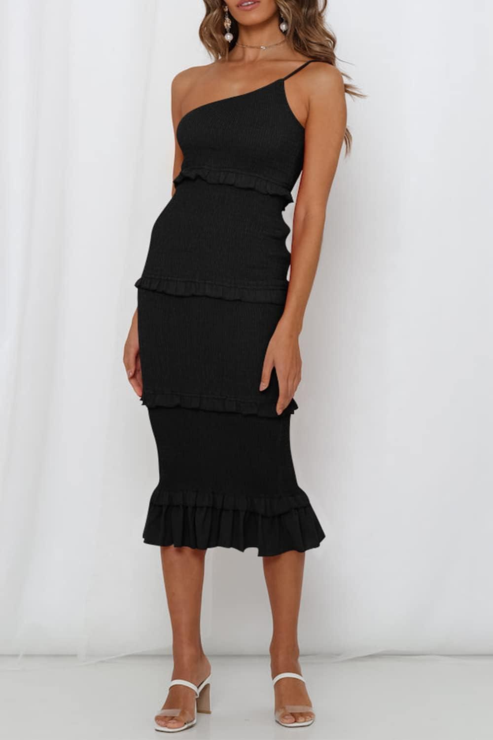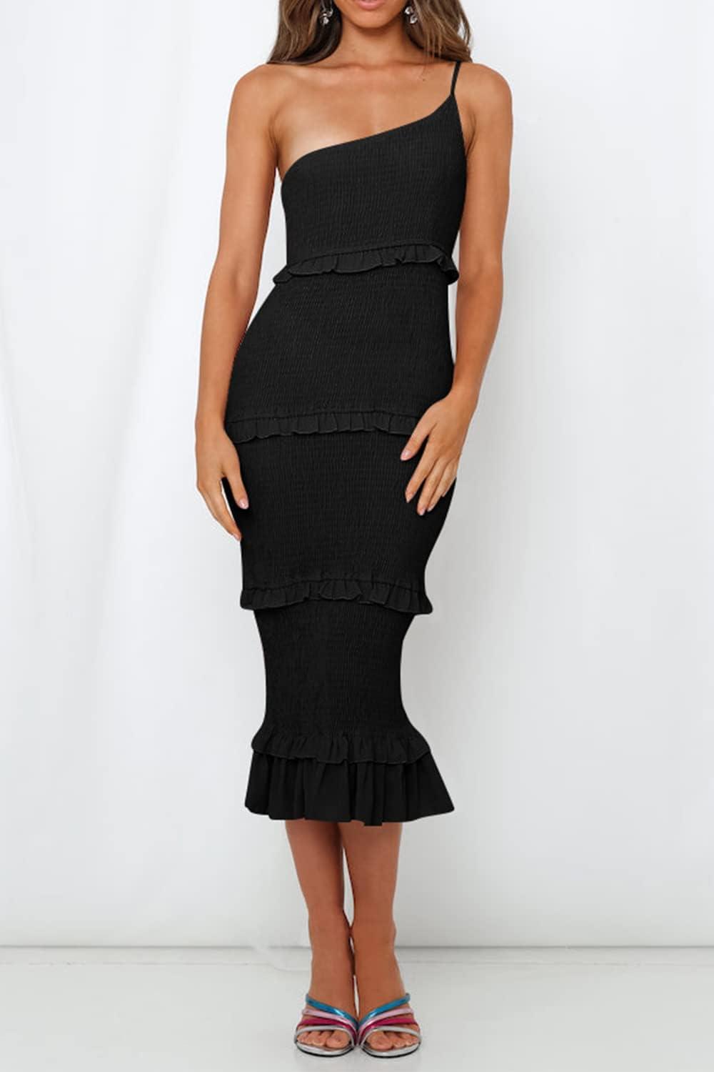 PRETTYGARDEN Women’s Summer Midi Bodycon Dresses One Shoulder Strappy Tiered Ruffle Floral Boho Sun Dress(Solid Black)