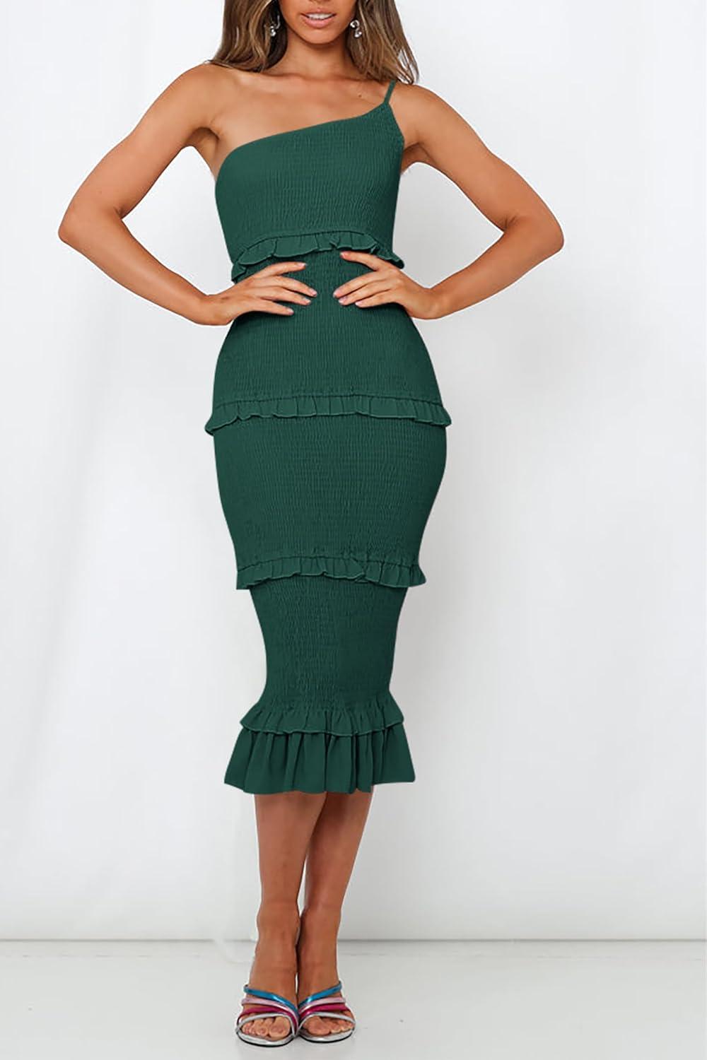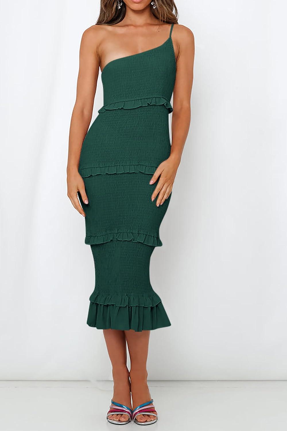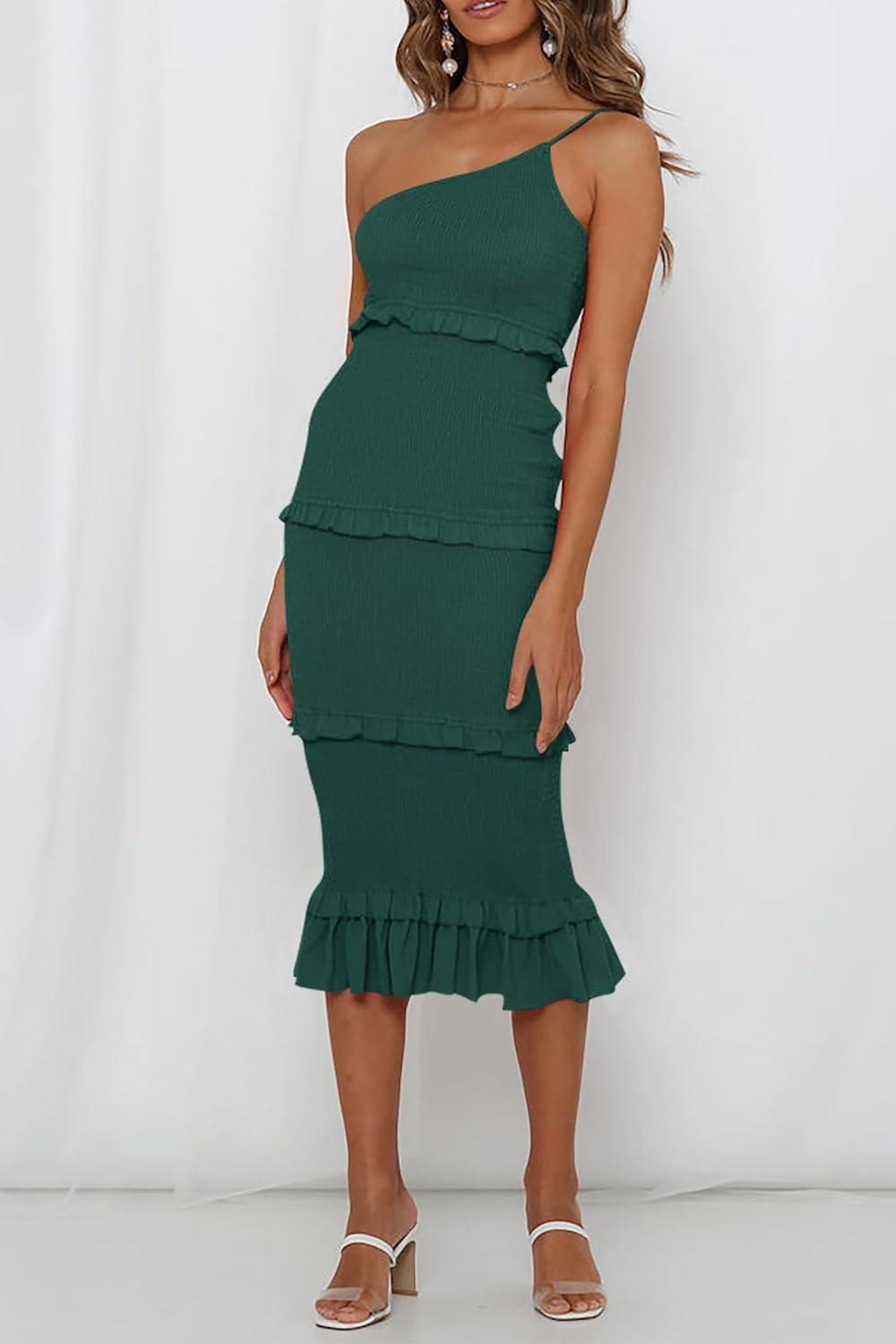 PRETTYGARDEN Women's Summer Midi Bodycon Dresses One Shoulder Strappy Tiered Ruffle Floral Boho Sun Dress(Solid Dark Green)