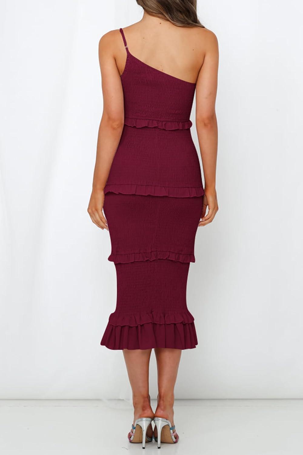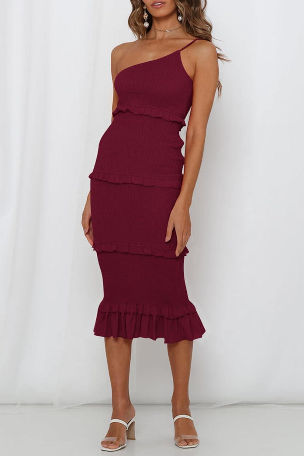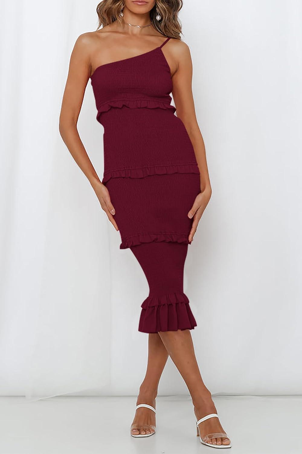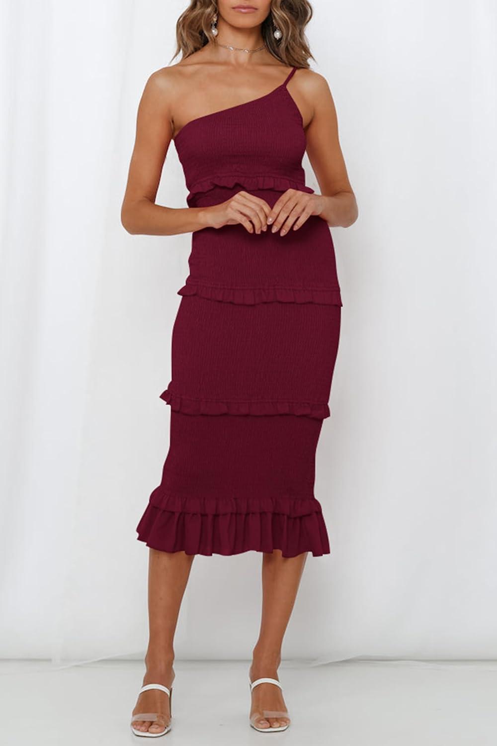 imagePRETTYGARDEN Womens Summer Midi Bodycon Dresses One Shoulder Strappy Tiered Ruffle Floral Boho Sun DressSolid Wine Red