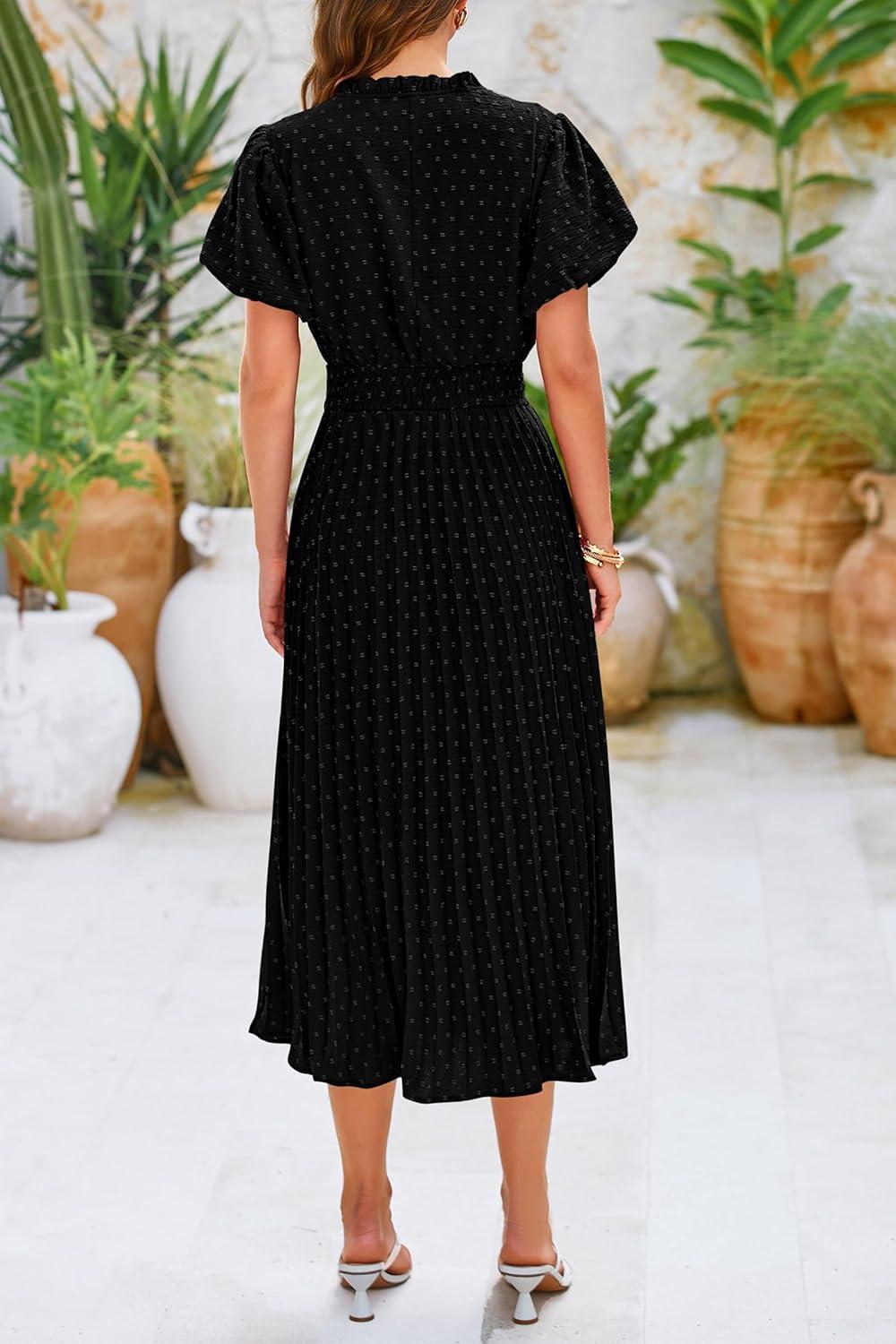 PRETTYGARDEN Womens Summer Midi Dresses Puff Short Sleeve V Neck Swiss Dot Pleated A Line Flowy Long Wedding Guest Dress(Black)