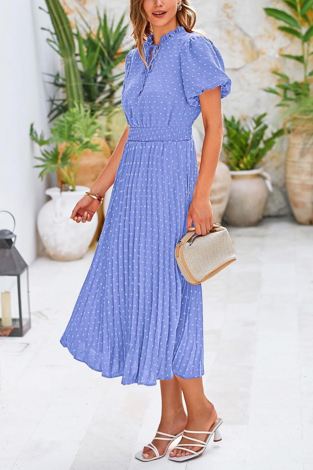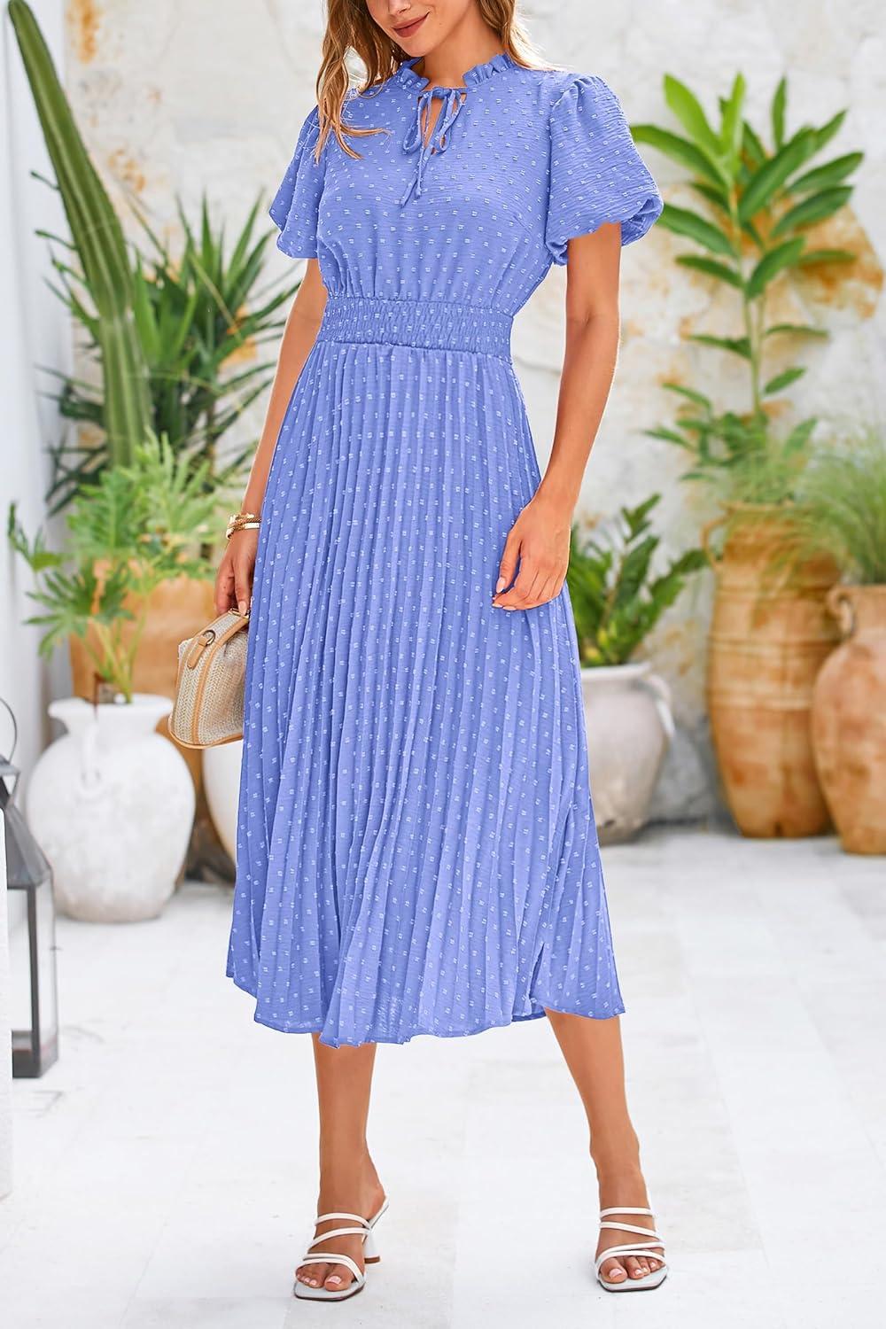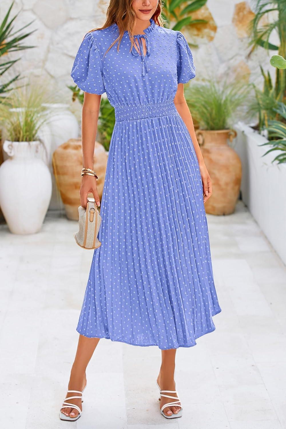 PRETTYGARDEN Womens Summer Midi Dresses Puff Short Sleeve V Neck Swiss Dot Pleated A Line Flowy Long Wedding Guest Dress(Light Blue)