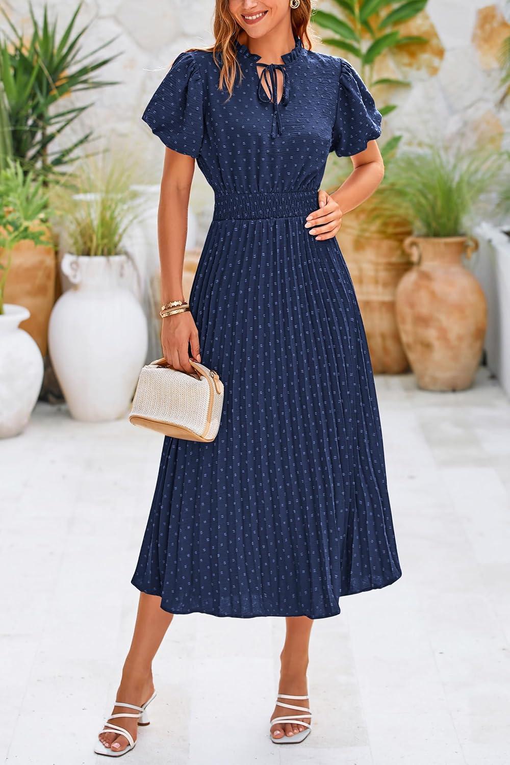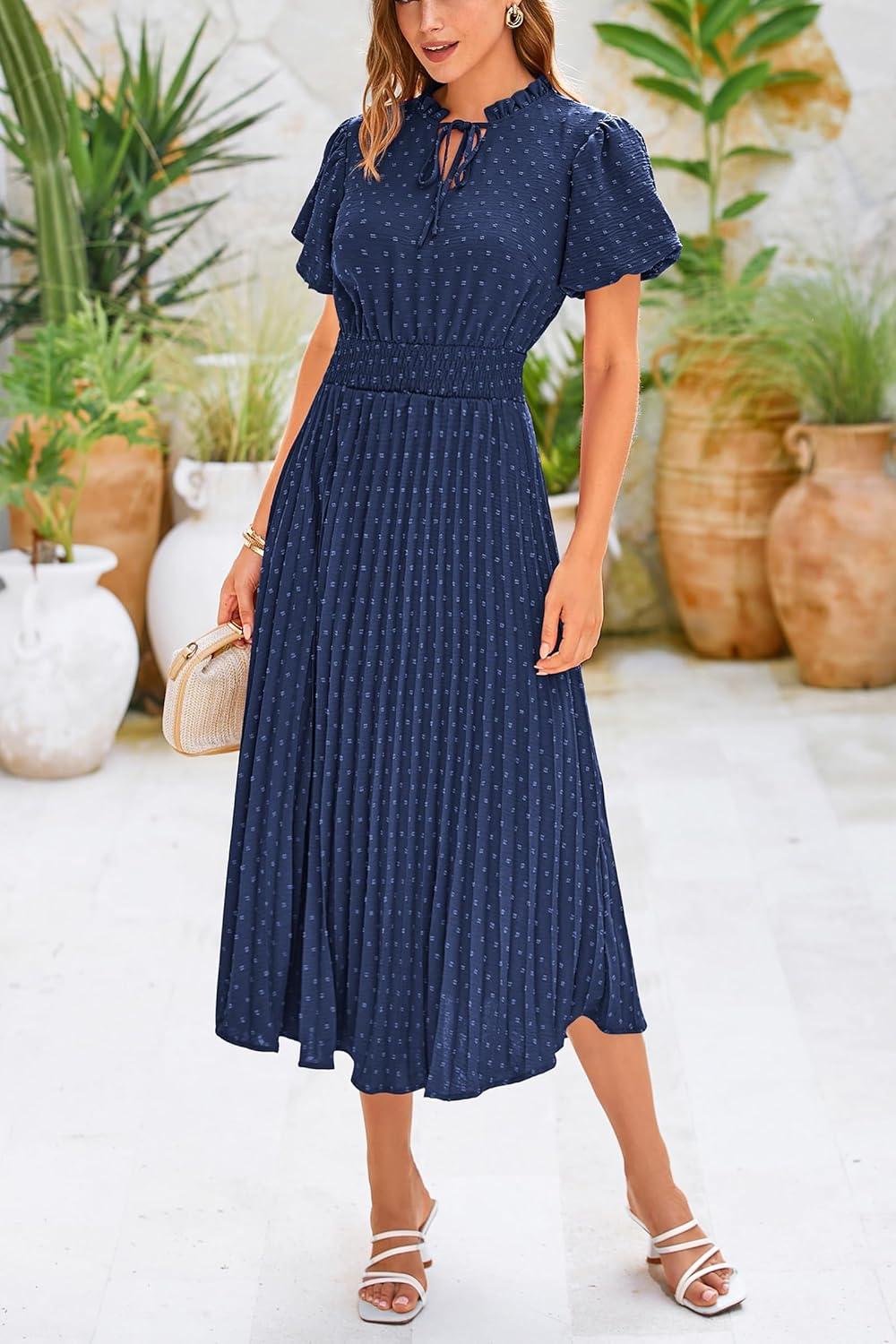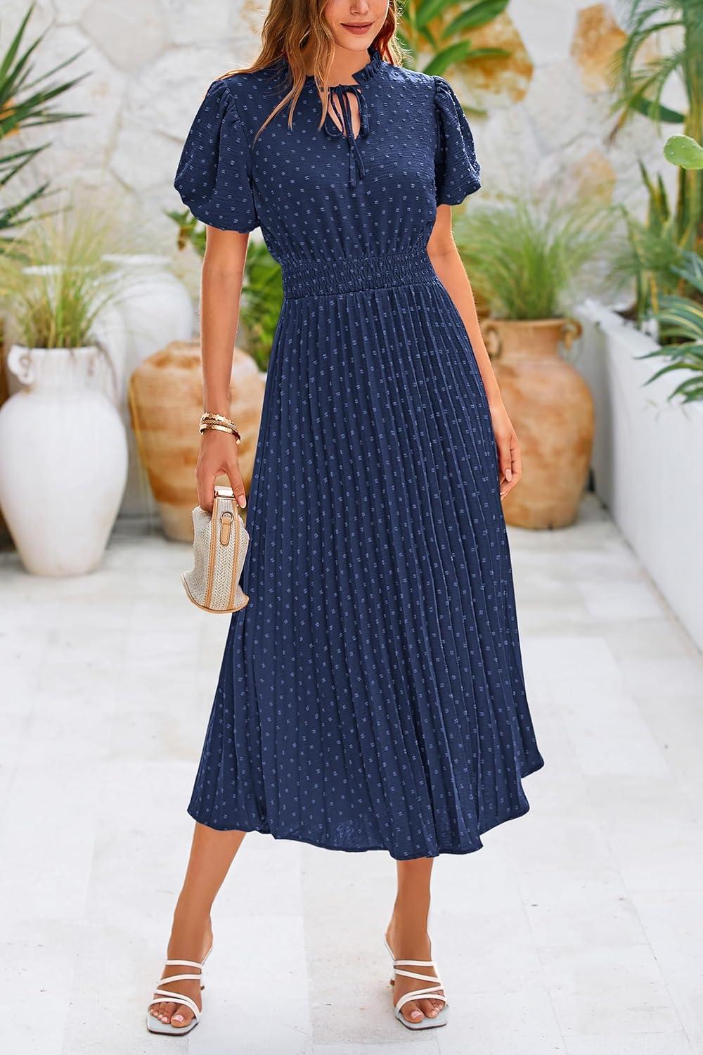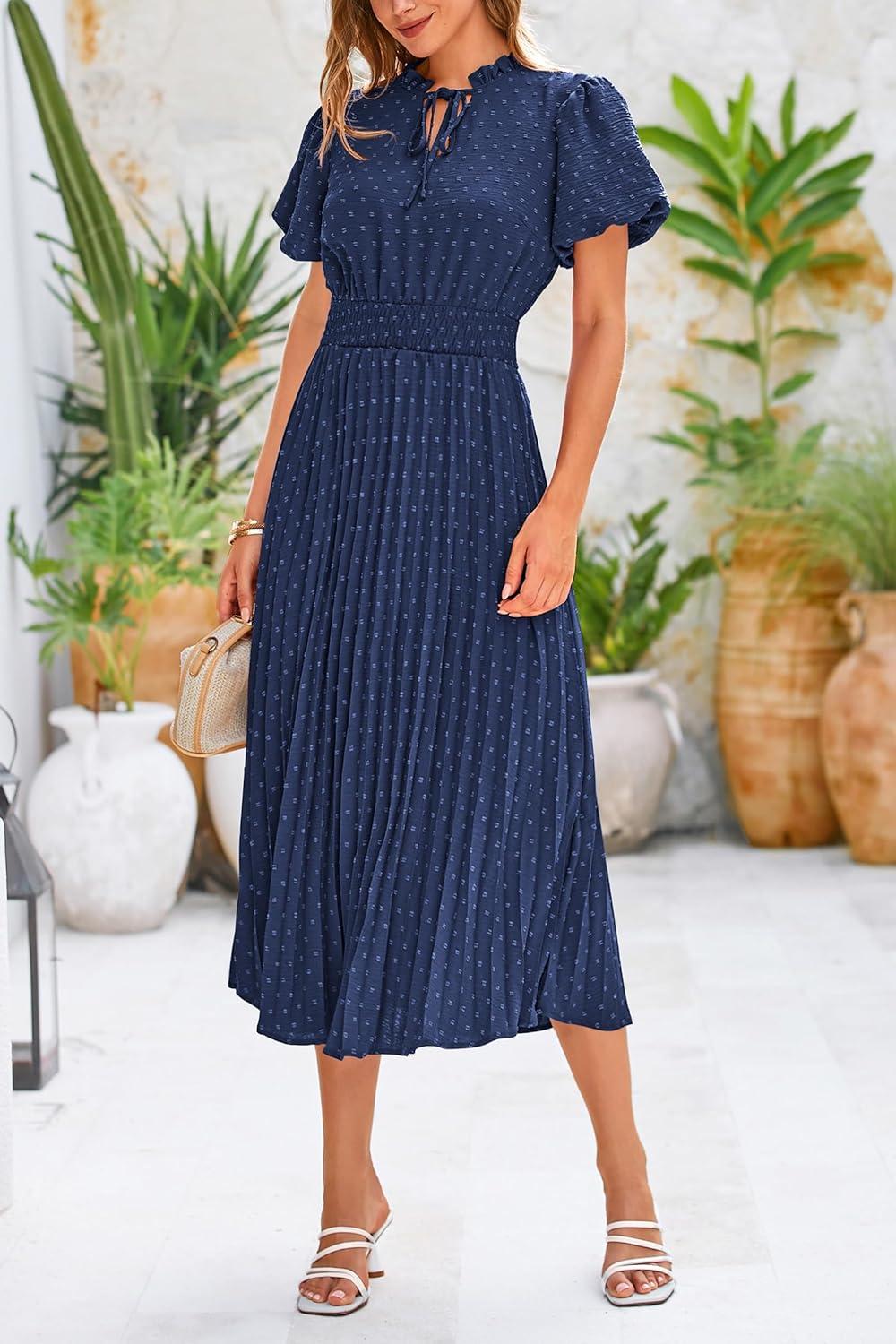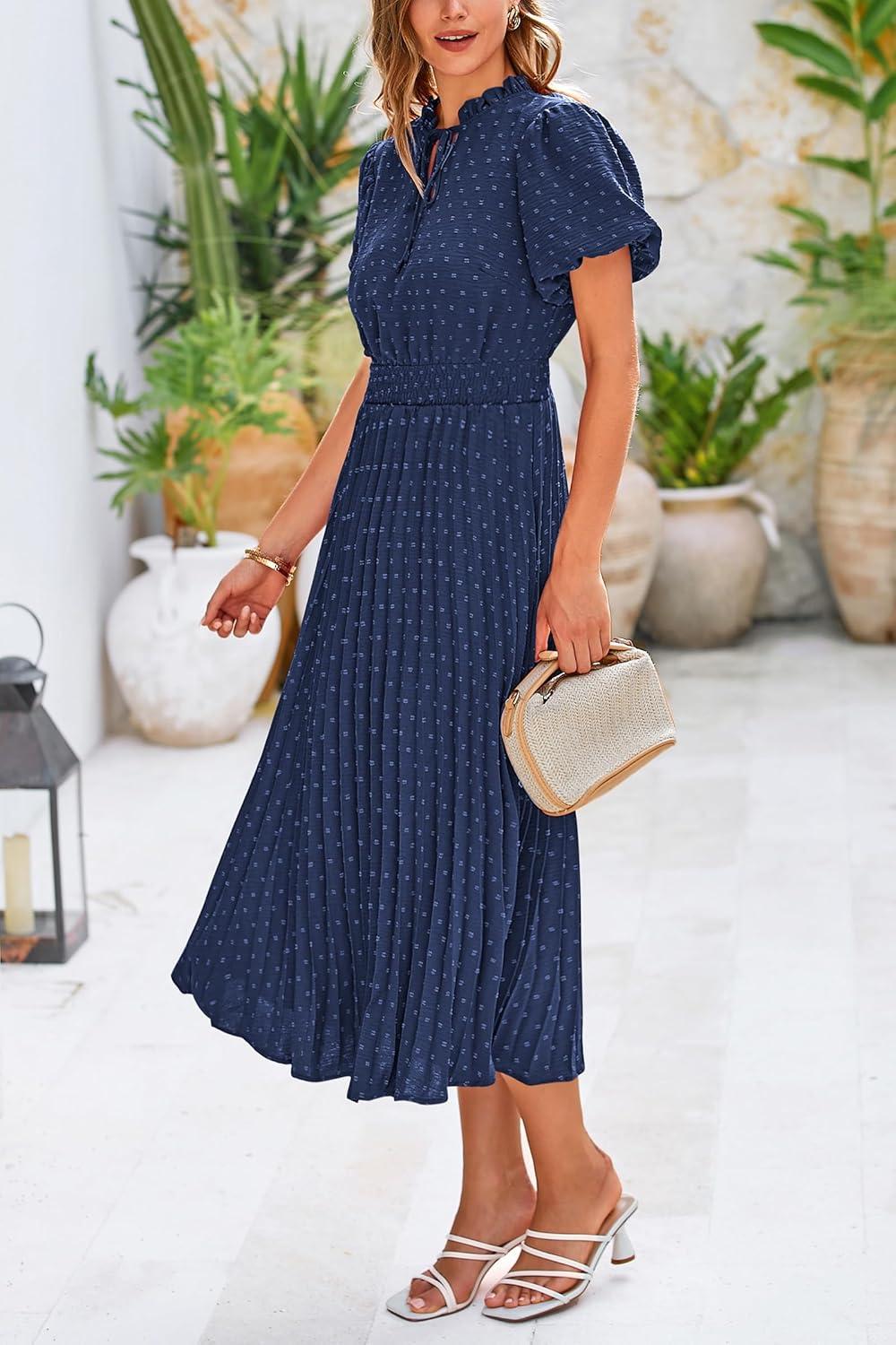 PRETTYGARDEN Womens Summer Midi Dresses Puff Short Sleeve V Neck Swiss Dot Pleated A Line Flowy Long Wedding Guest Dress(Navy)