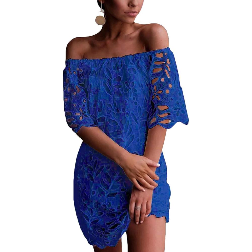 PRETTYGARDEN Women's Summer Off Shoulder Dresses Floral Lace Flare Short Sleeve Spring Vintage Elegant Mini Dress(Dark Blue)