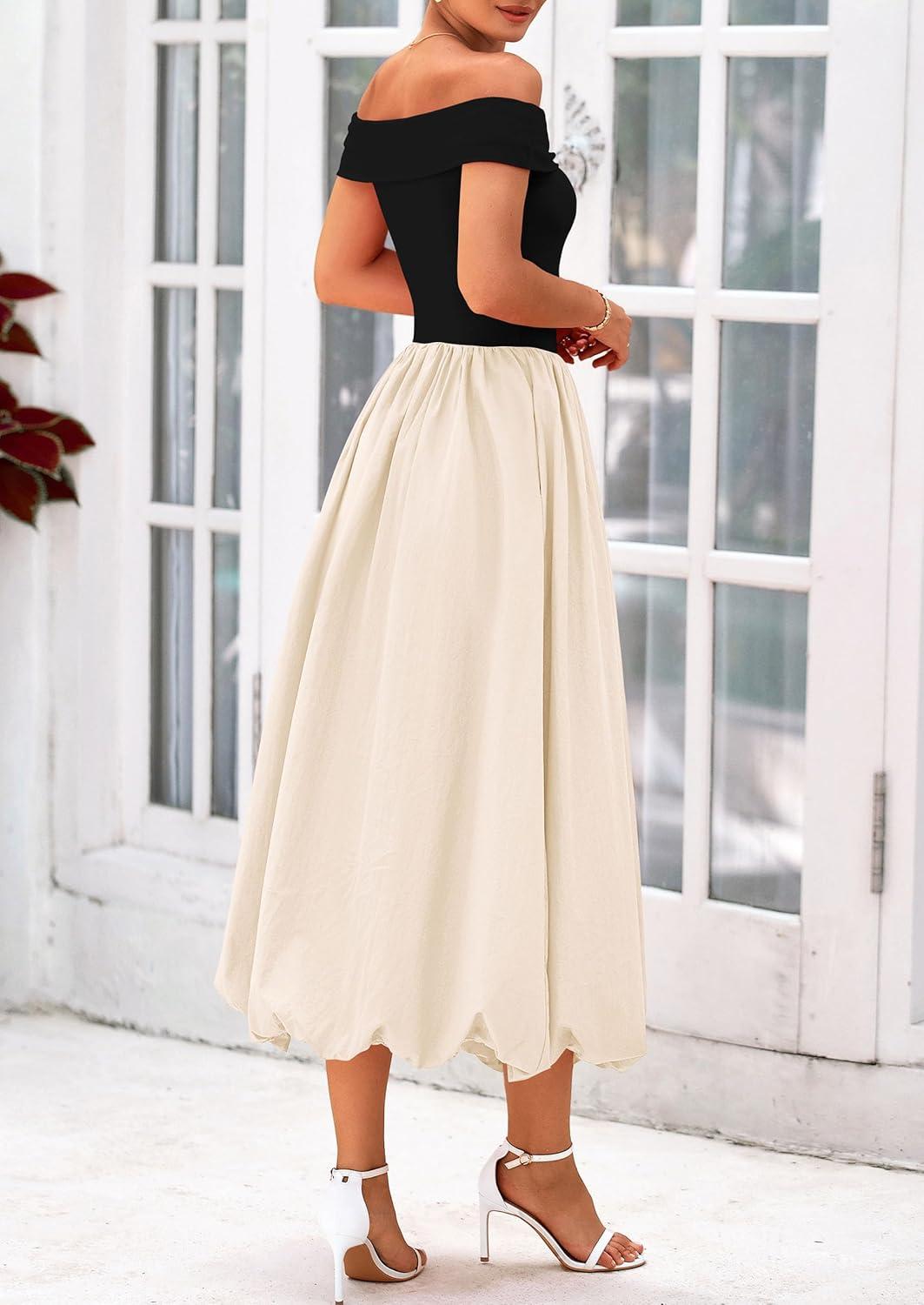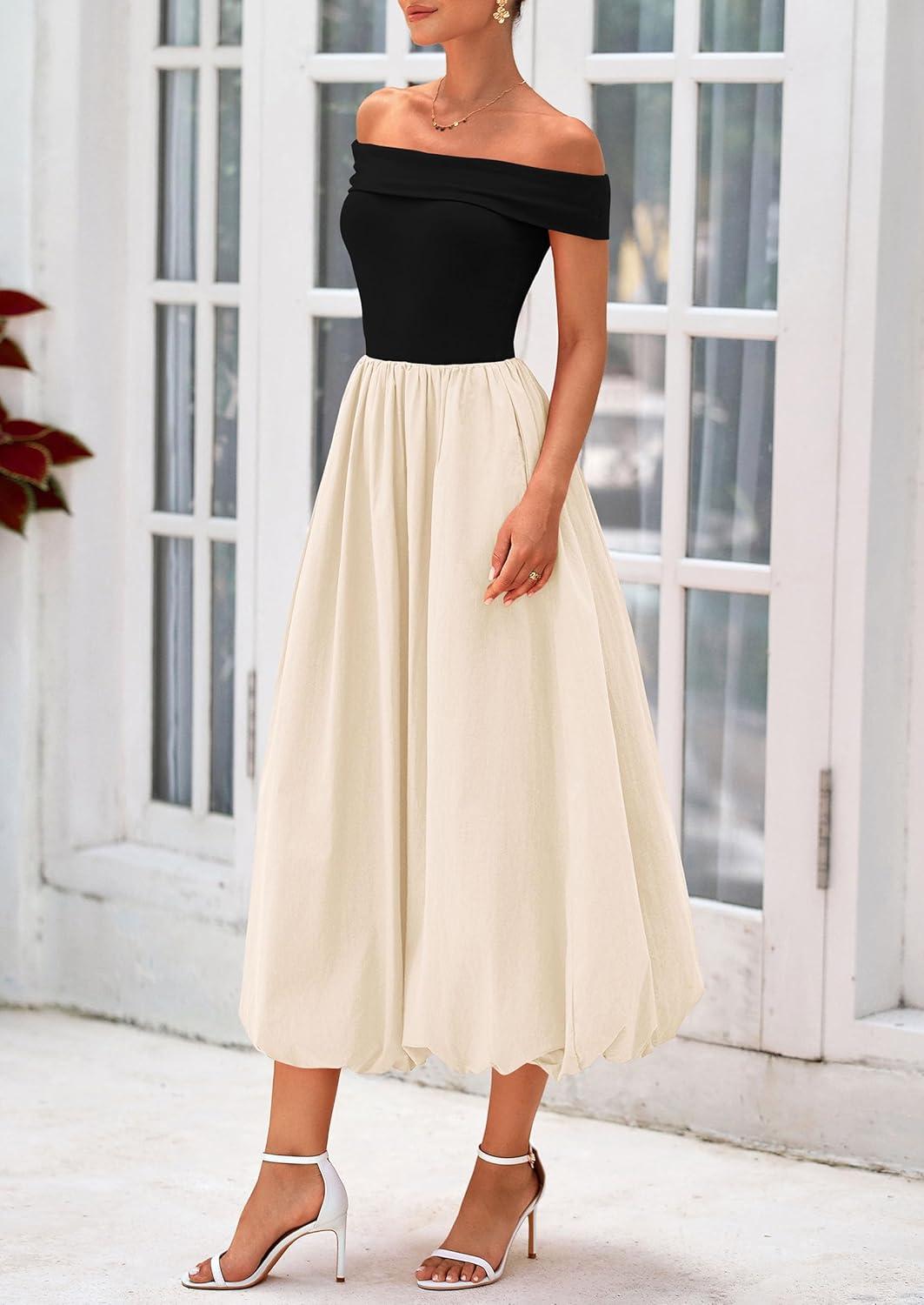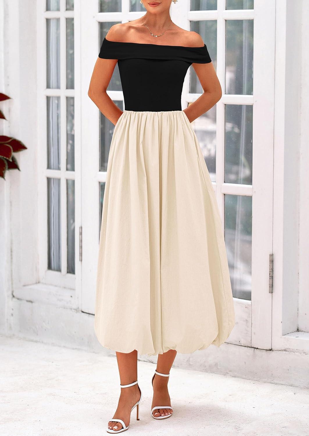 PRETTYGARDEN Womens Summer Off Shoulder Sleeveless Midi Dress Cocktail A Line Flowy Wedding Guest Dresses with Pockets(Black Apricot)