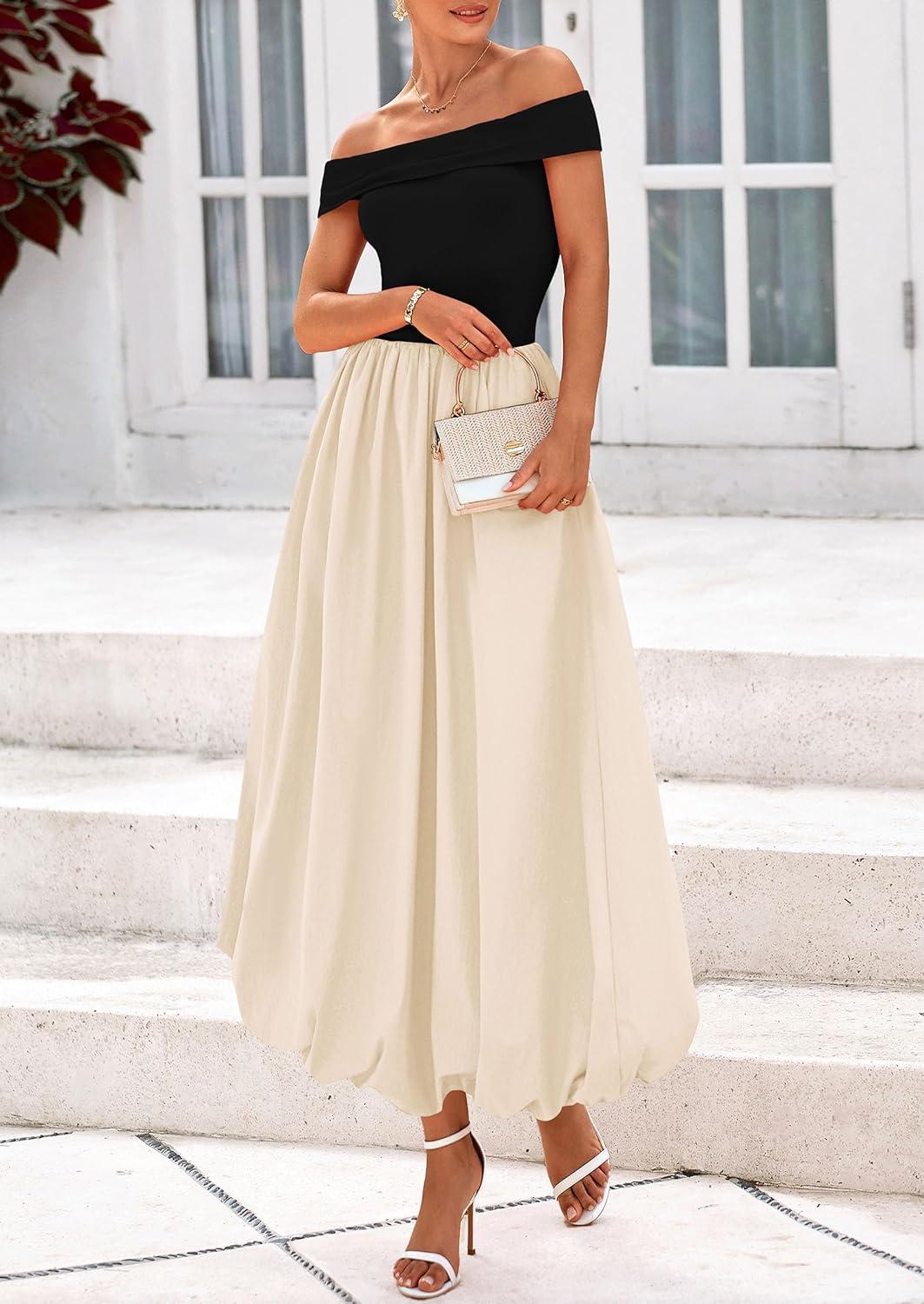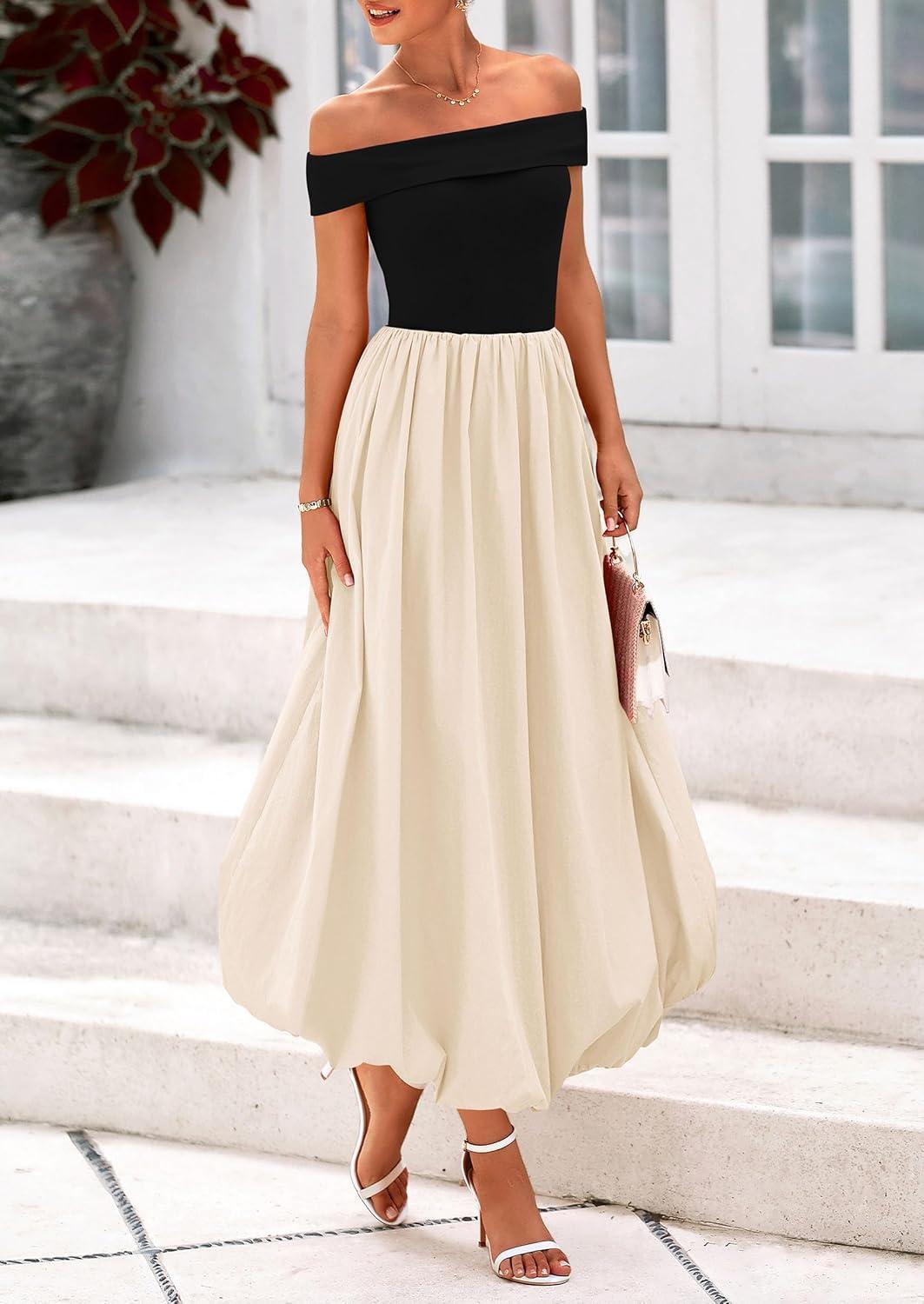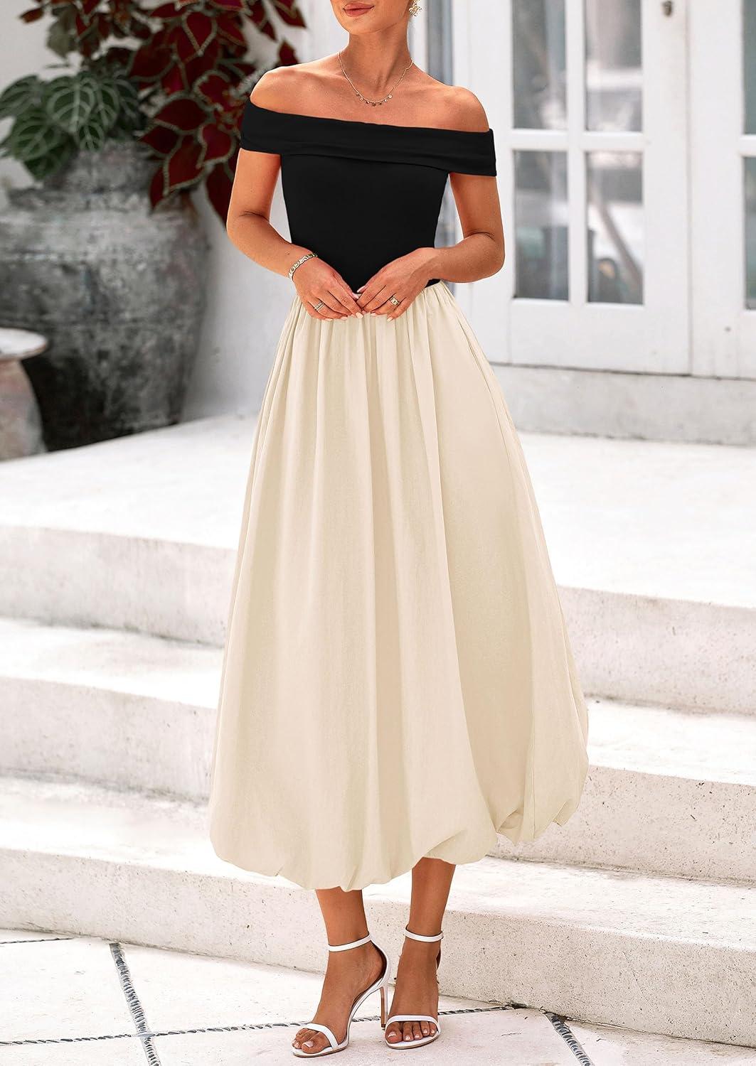 PRETTYGARDEN Womens Summer Off Shoulder Sleeveless Midi Dress Cocktail A Line Flowy Wedding Guest Dresses with Pockets(Black Apricot)
