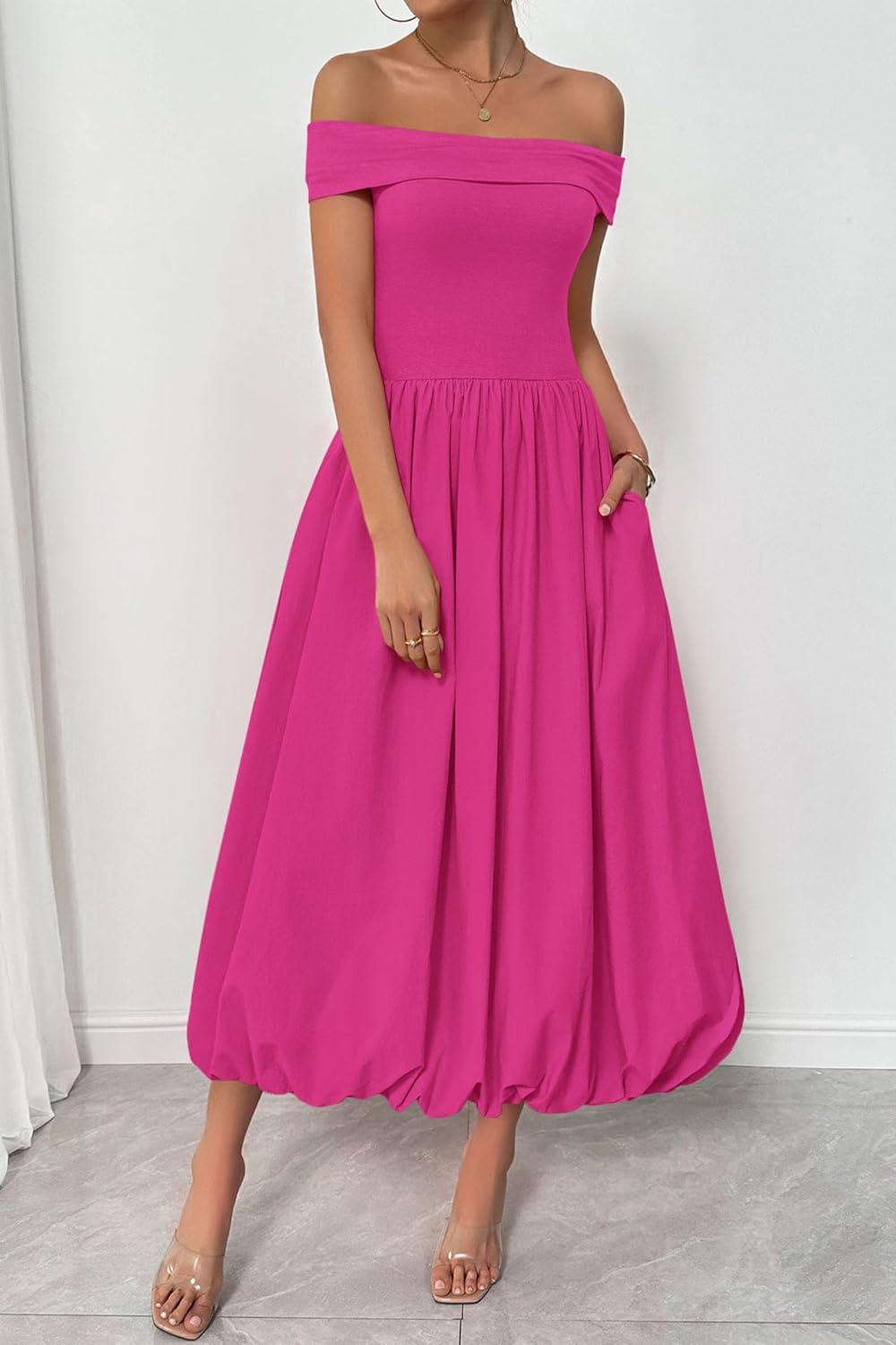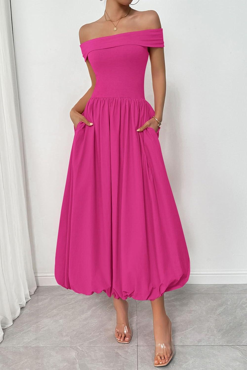 PRETTYGARDEN Womens Summer Off Shoulder Sleeveless Midi Dress Cocktail A Line Flowy Wedding Guest Dresses with Pockets(Rose Red)