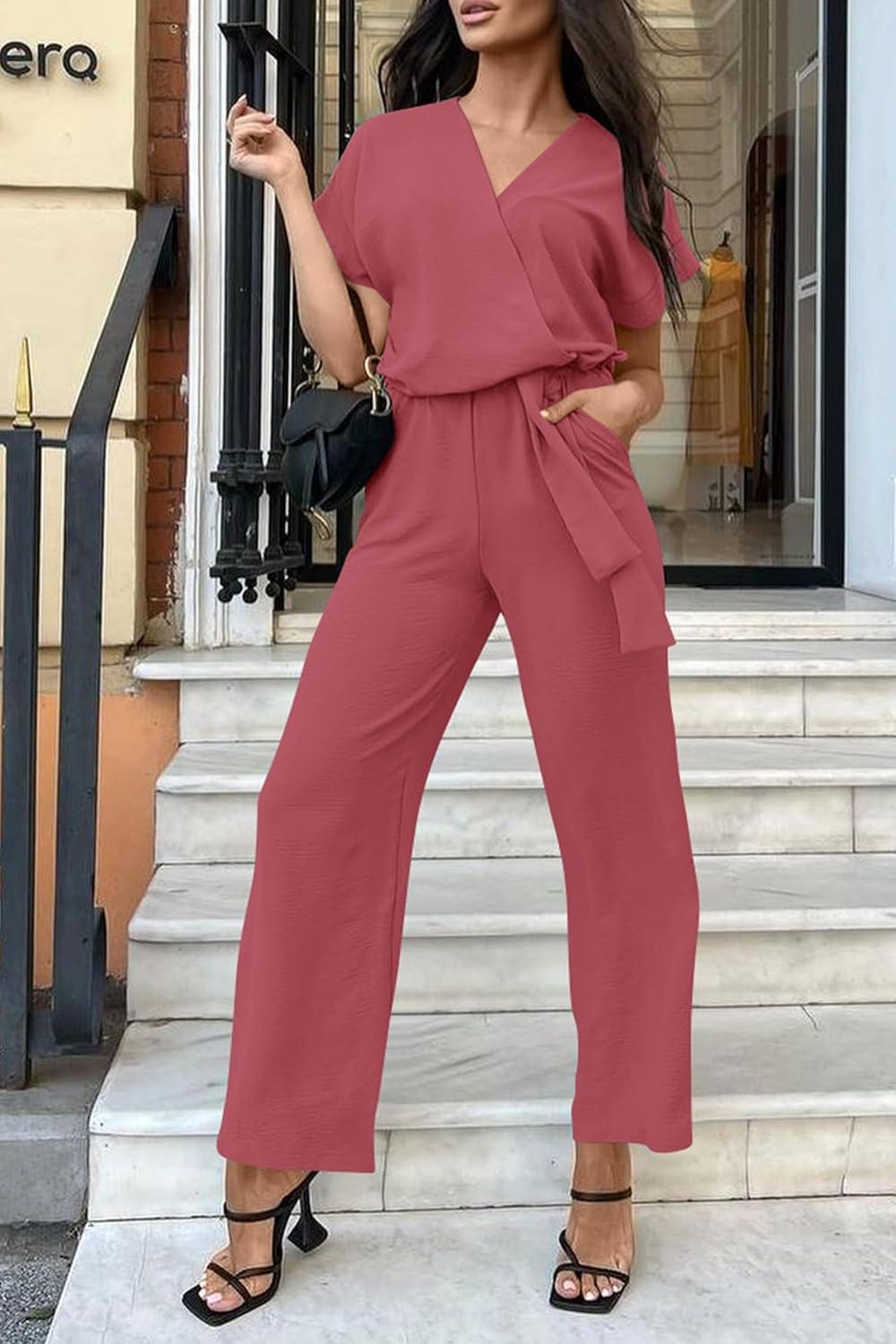 PRETTYGARDEN Women's Summer One Piece Jumpsuits Belted Short Sleeve Wrap V Neck Fashion Dressy Casual Wide Leg Pants Romper(Dark Pink)